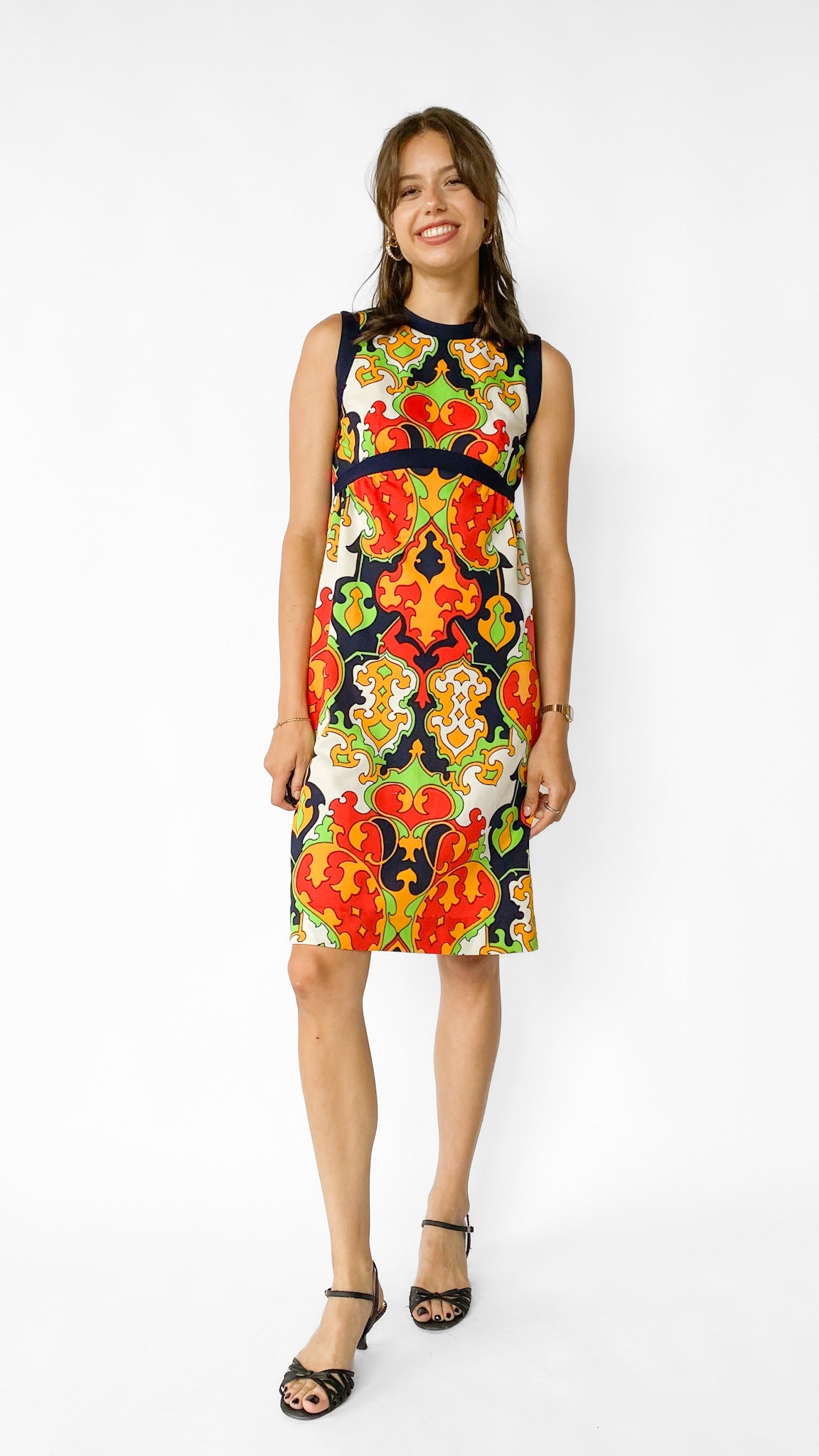 Sleeveless white sheath dress with navy blue waistband, neckline, and armholes. Bright green, yellow, and red geometric pattern. Zipper in center back.