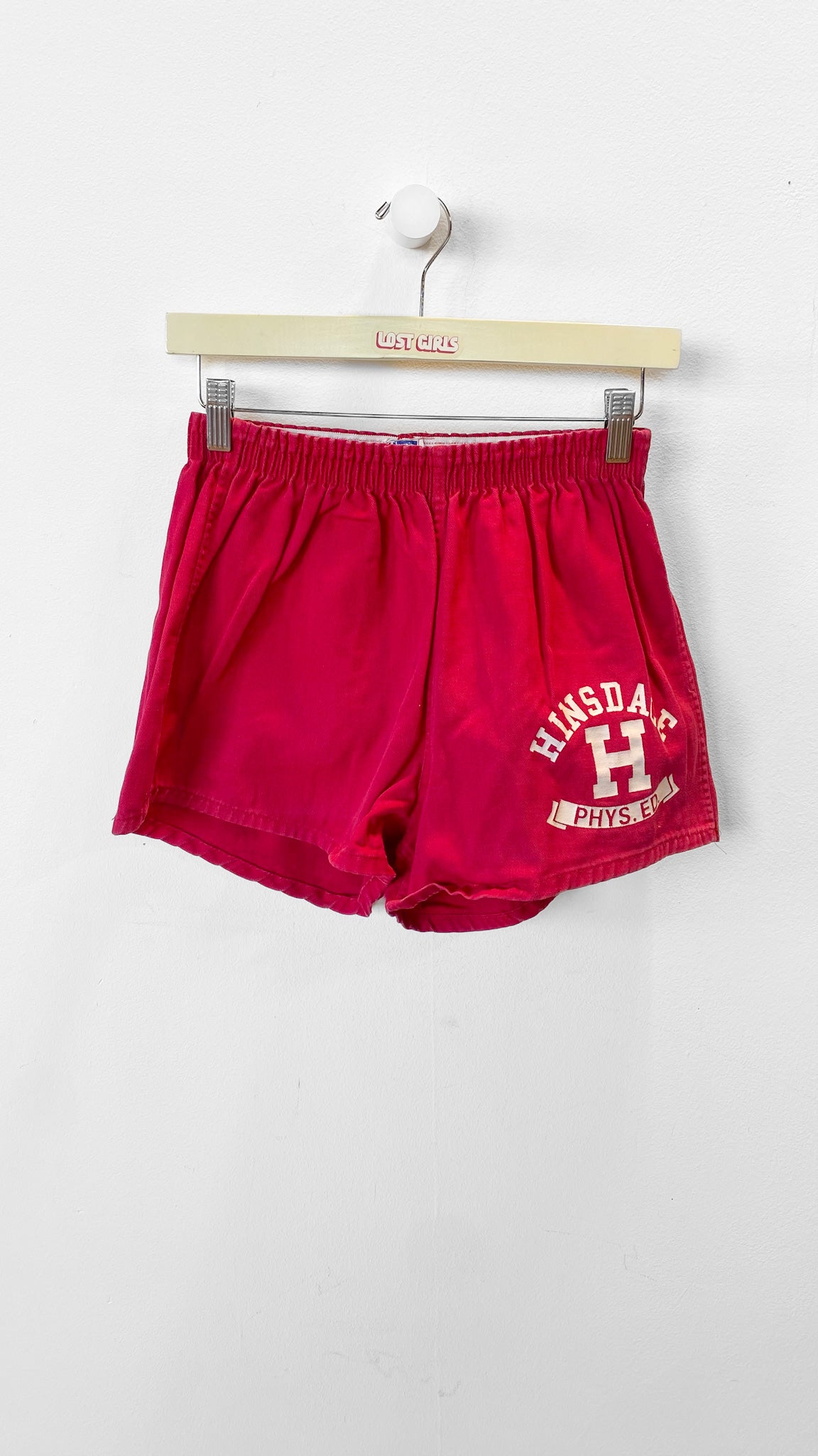 Deep red gym shorts with elastic waistband. Has school logo reading Hinsdale Phys. Ed.