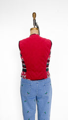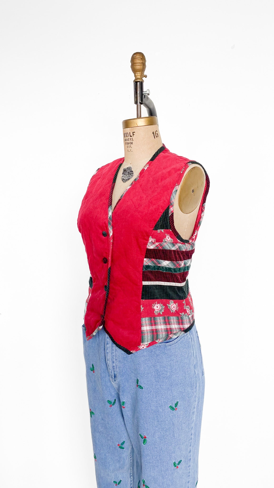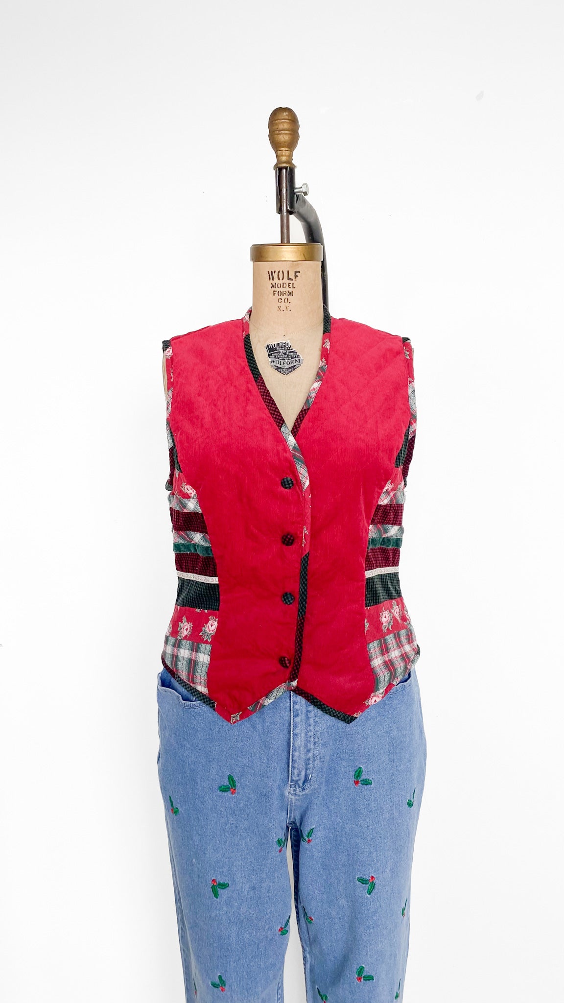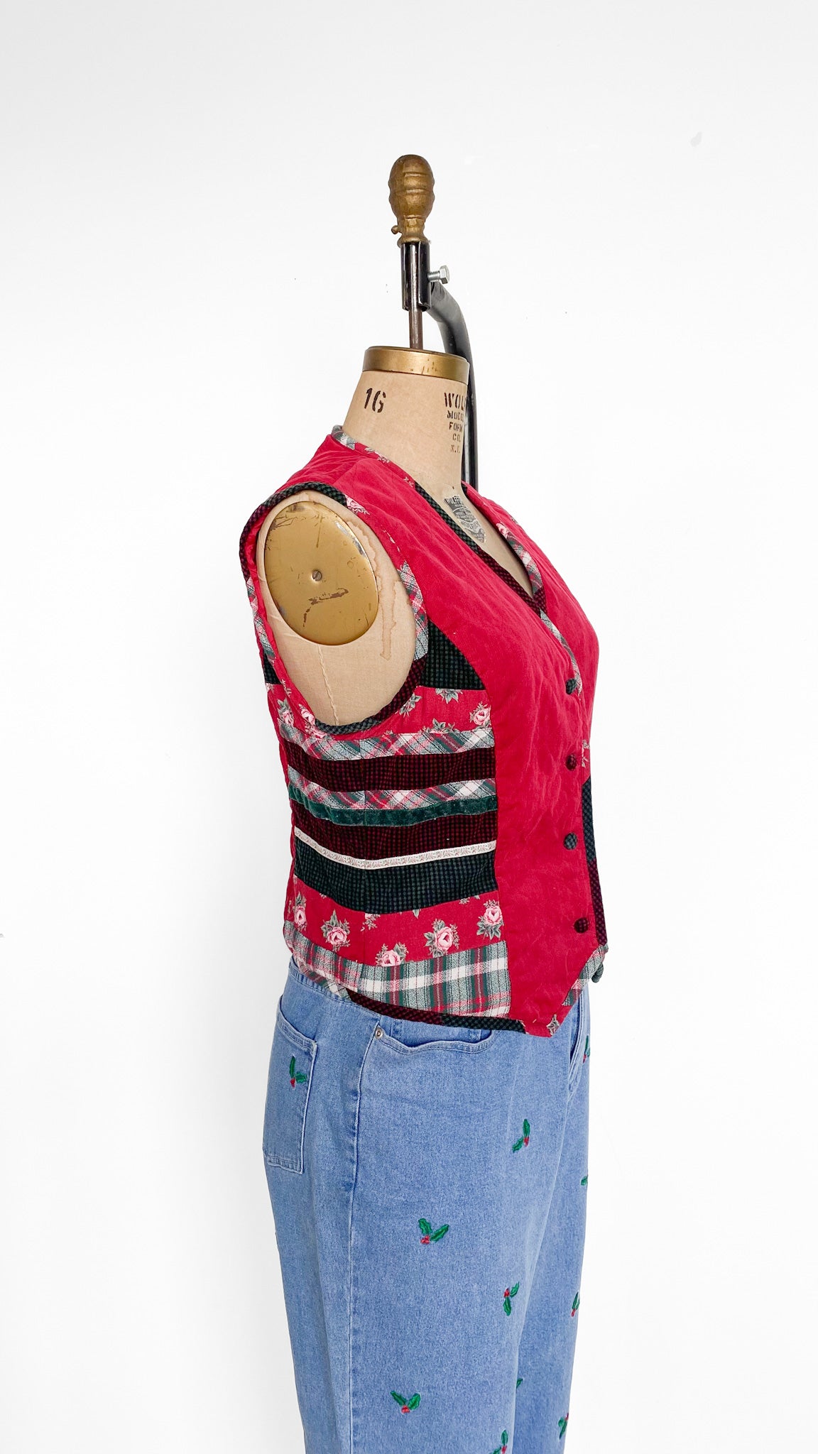 Red corduroy vest with patchwork stripes down side. Has alternating plaid button closure down center front.