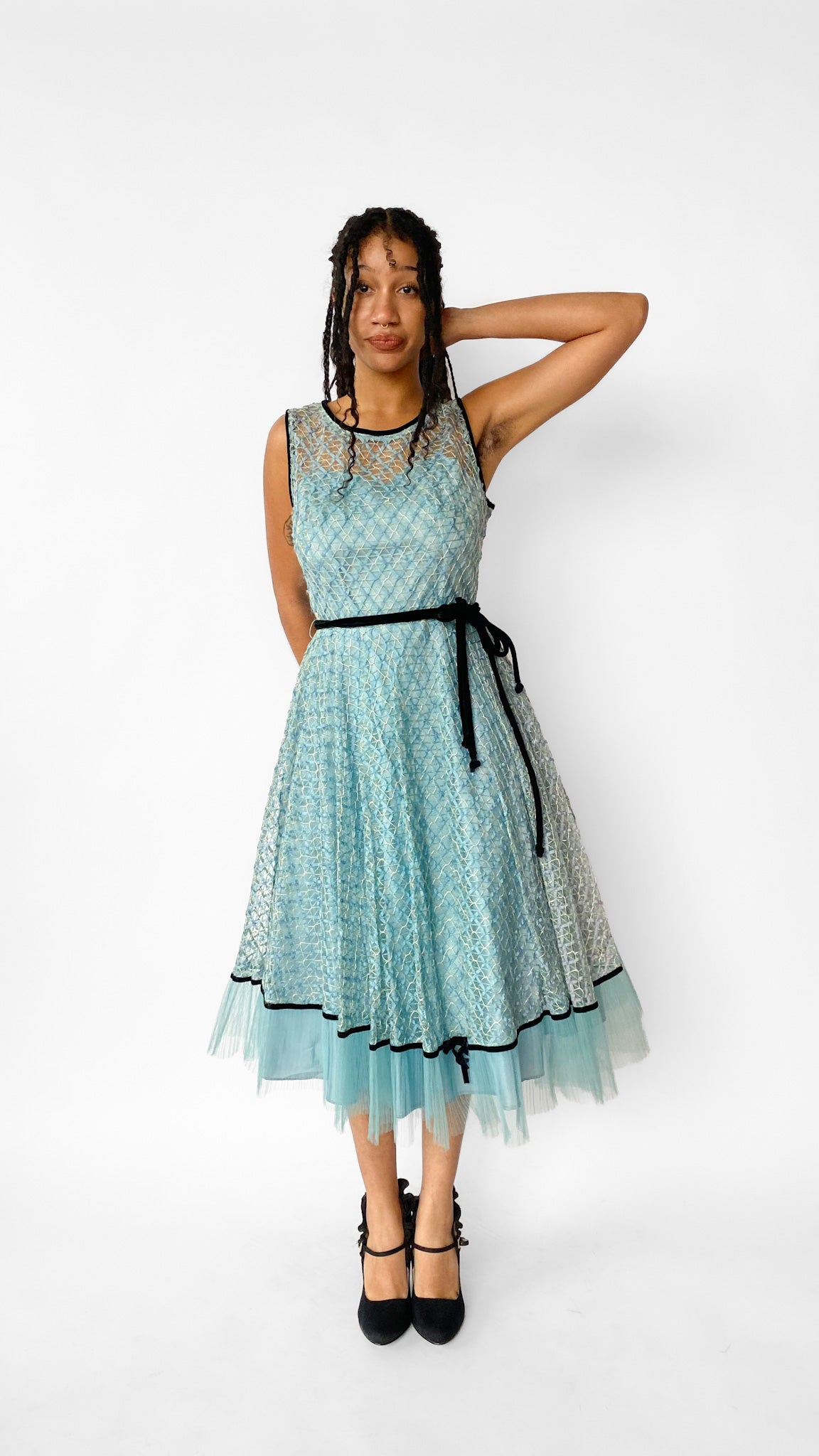 Description: Blue lace dress with black velvety edges and black velvety belt. Tulle on hemmed on bottoms of dress with black velvet bow.