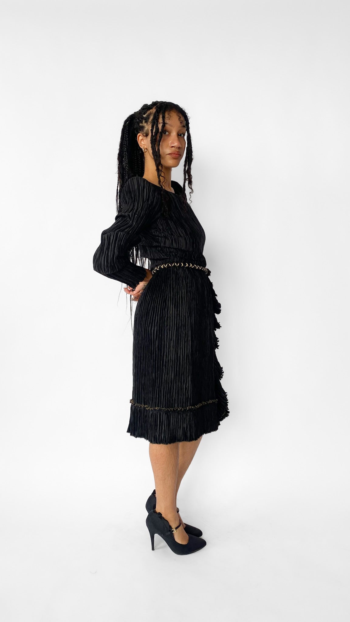 Description: Long sleeve ruched black dress with gold belt detailing and gold seam accents. Lettuce hem seams on sleeves and bottom of dress. Gathered gold and black accent on right side.
