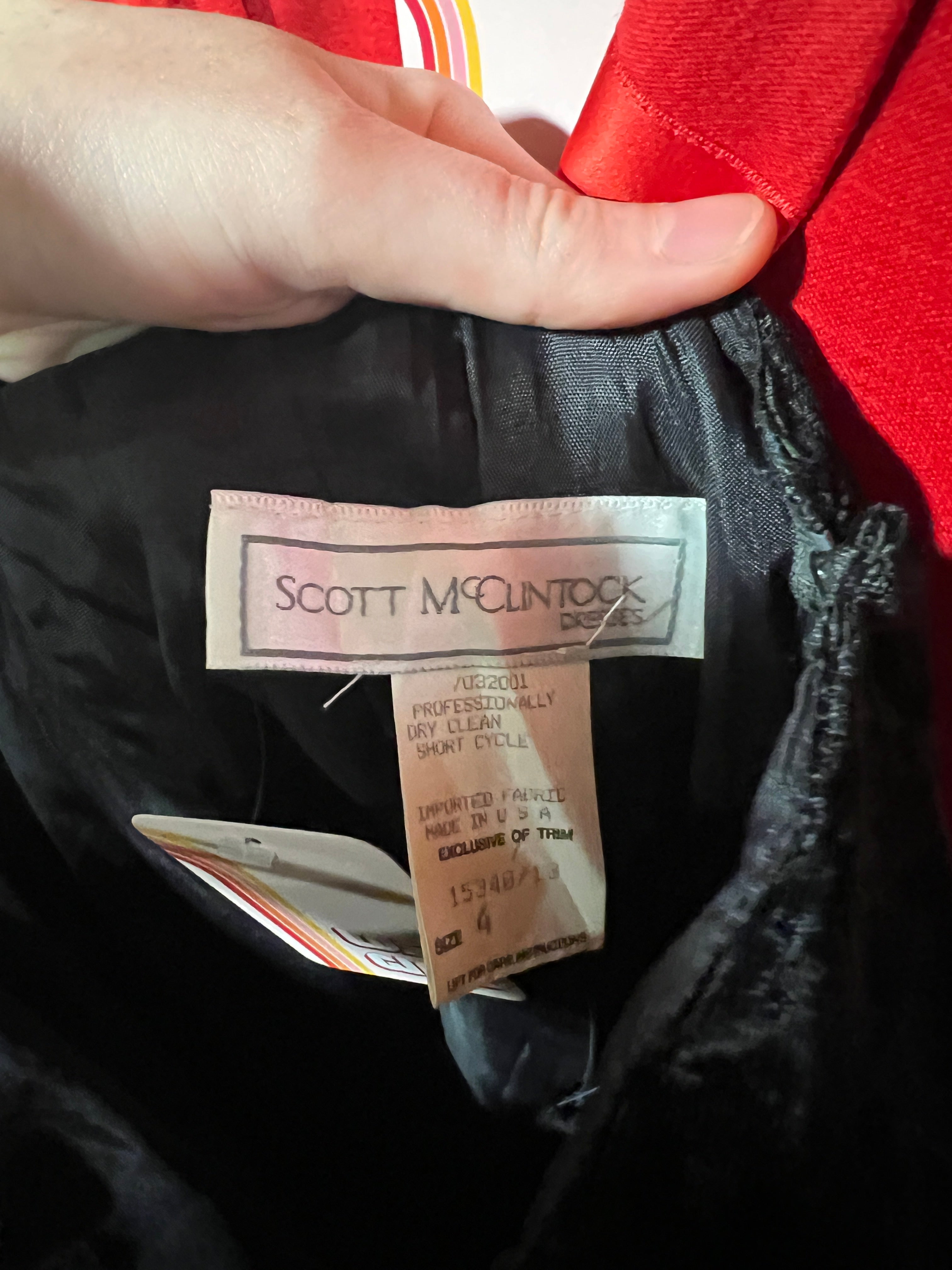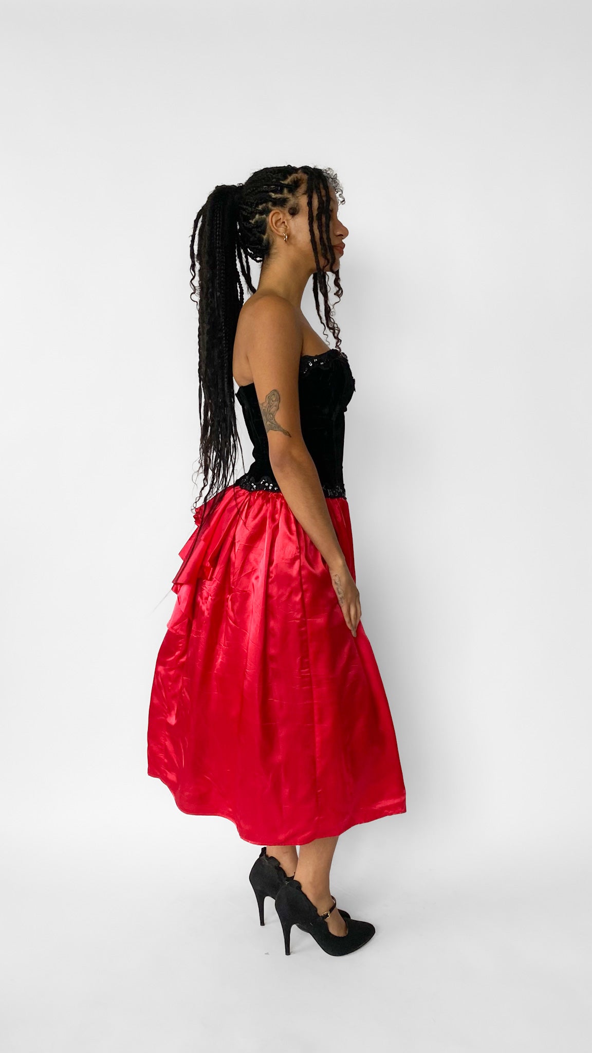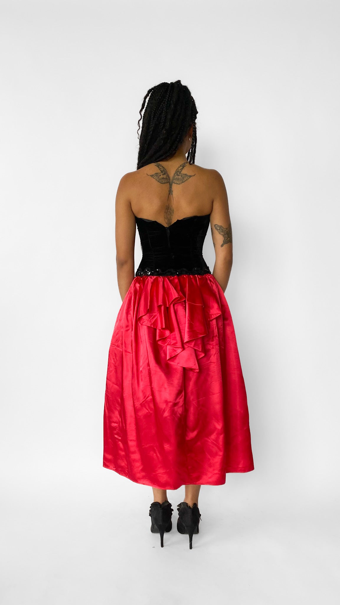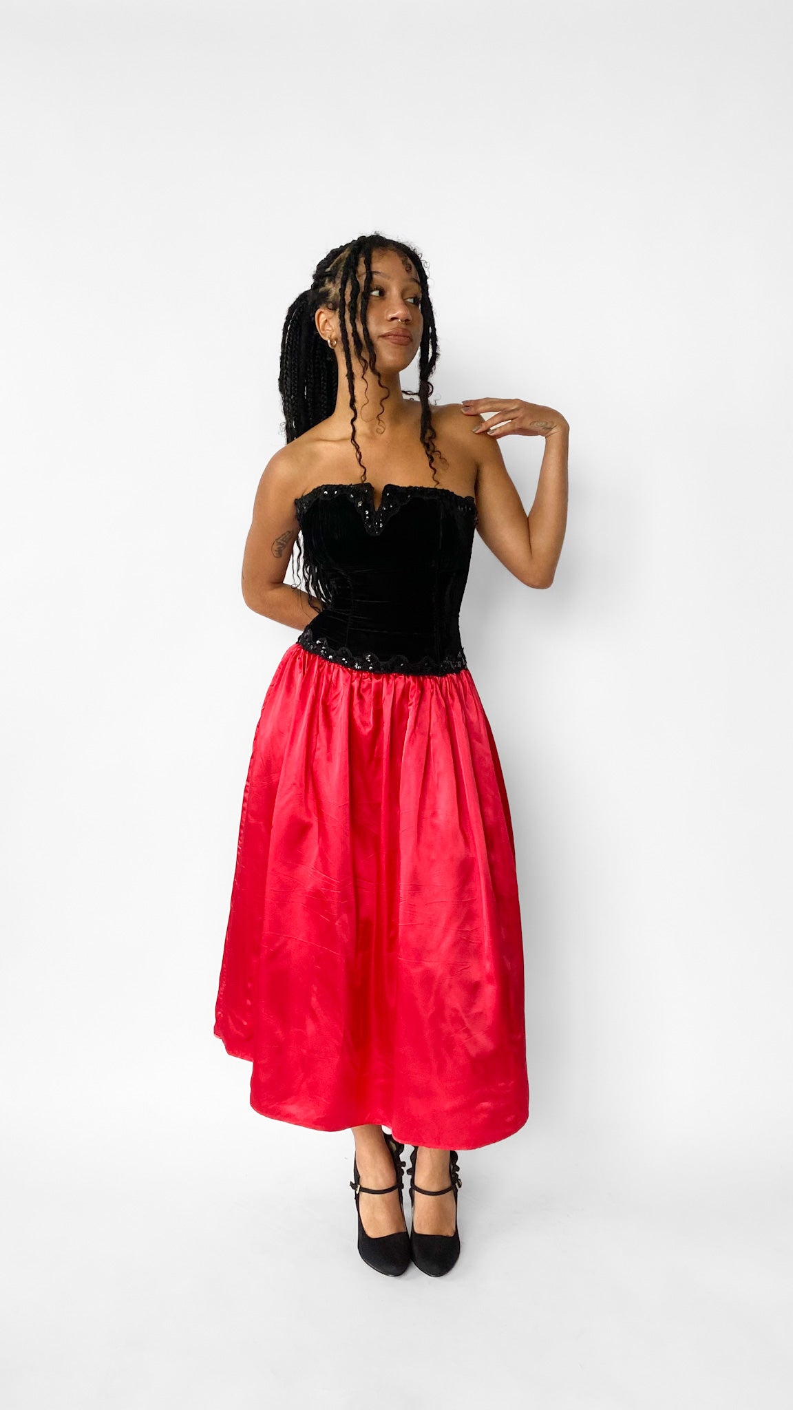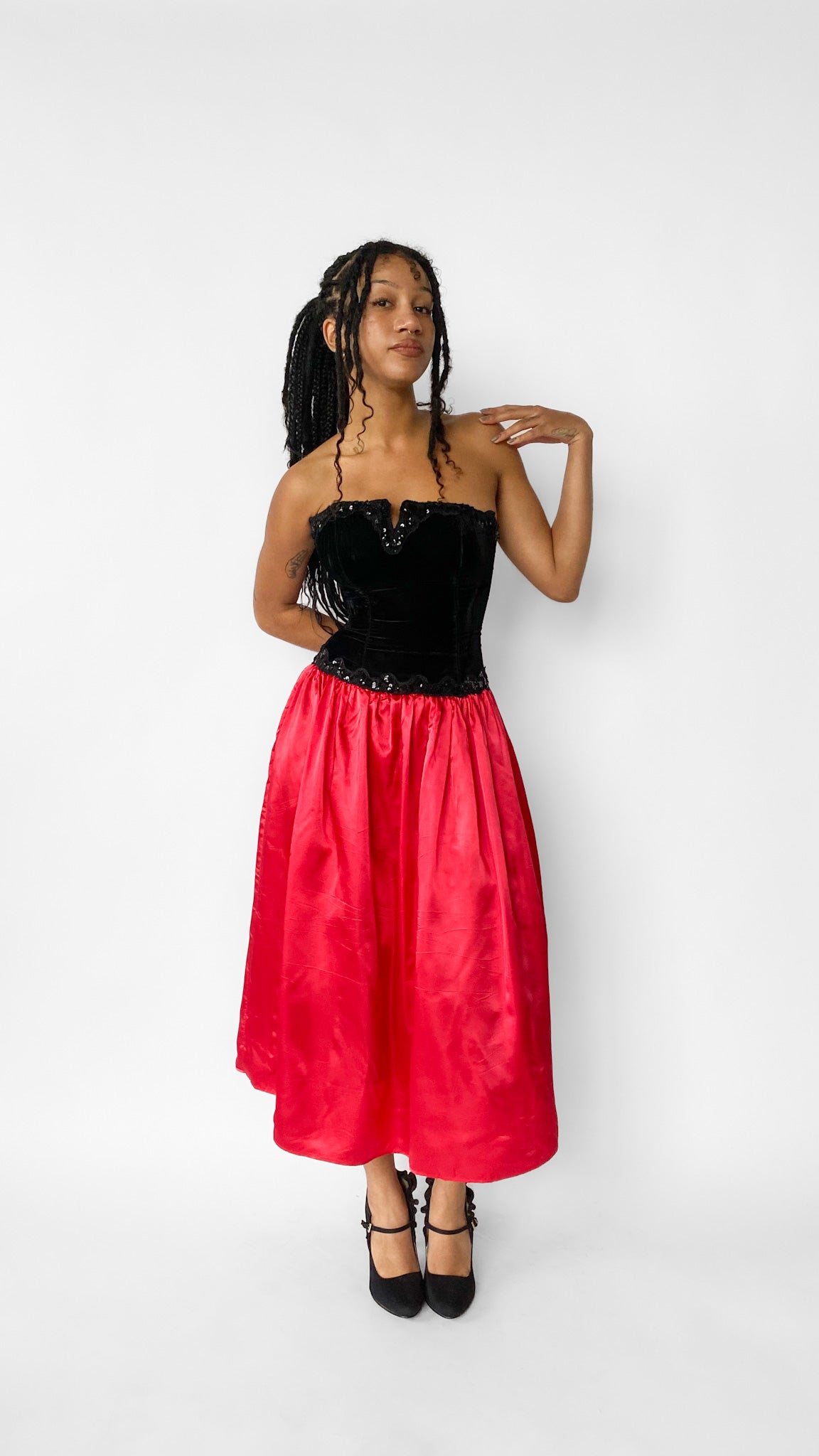 Description: Dress with black velvet and sequined bodice and red bottom with tulle underneath. Boning in bodice and little V cutout.
