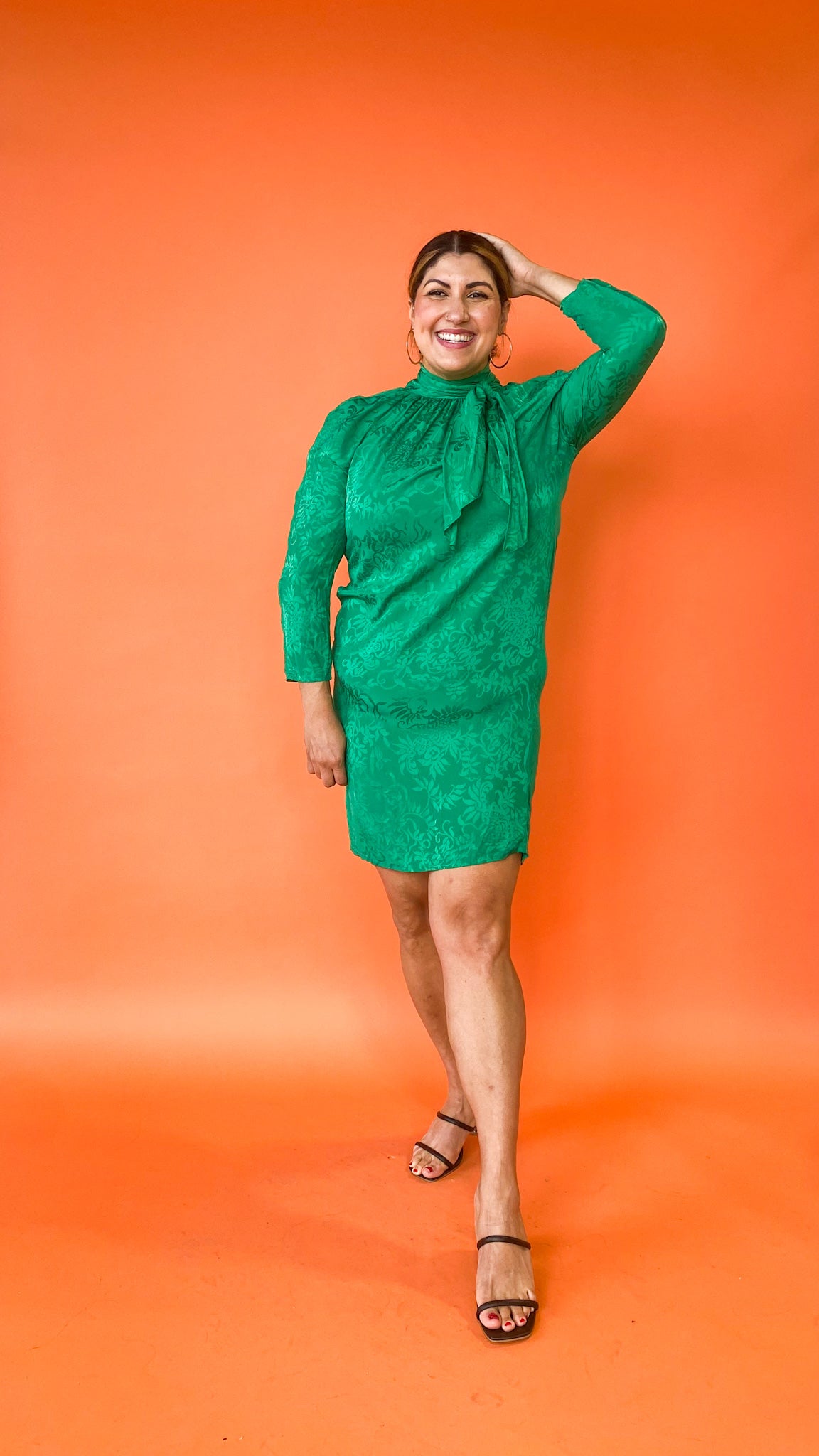 Green silk midi dress with a bow at the back of the neck. Floral pattern in the fabric. Hook and eye at the back of the neck.