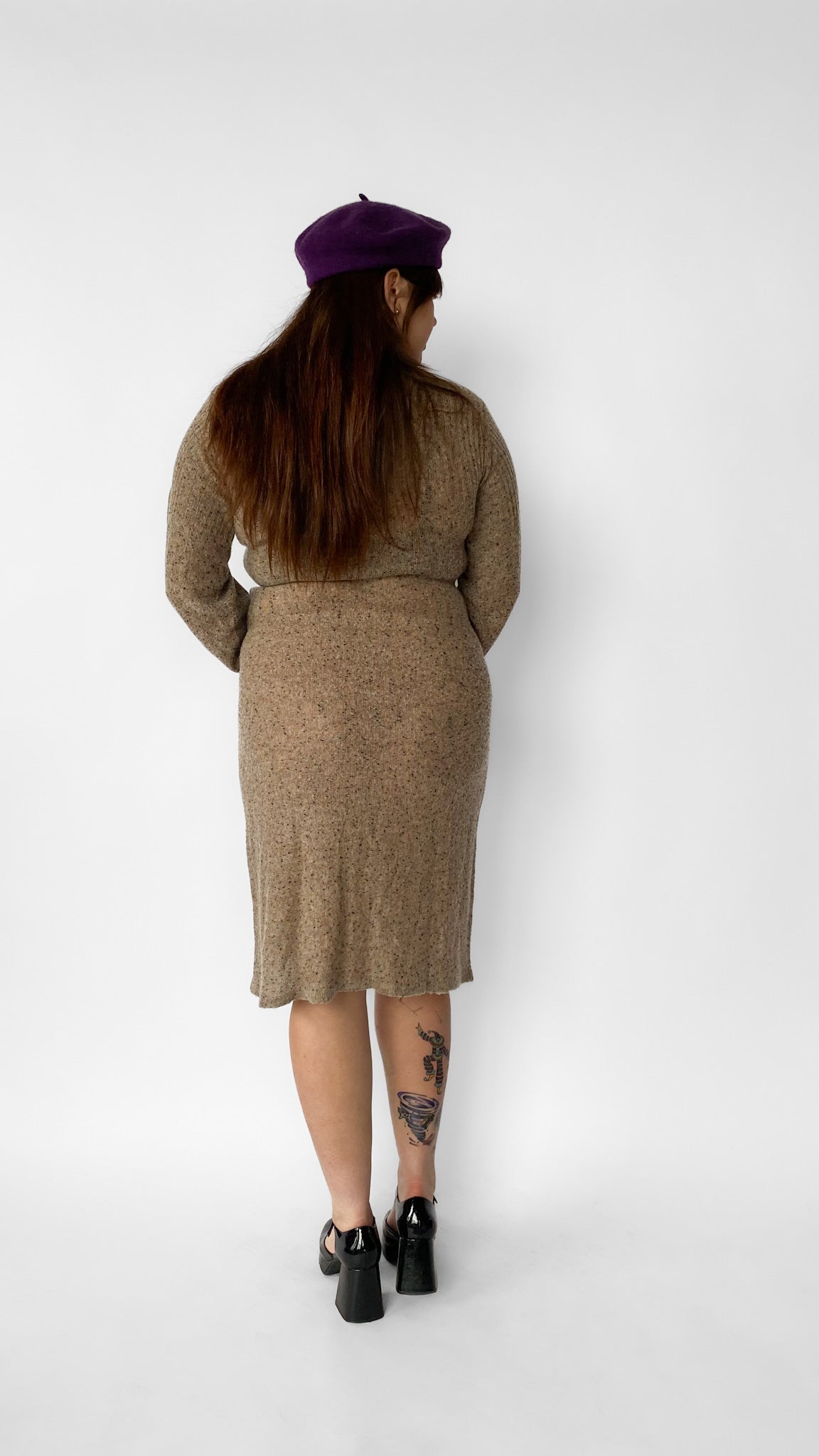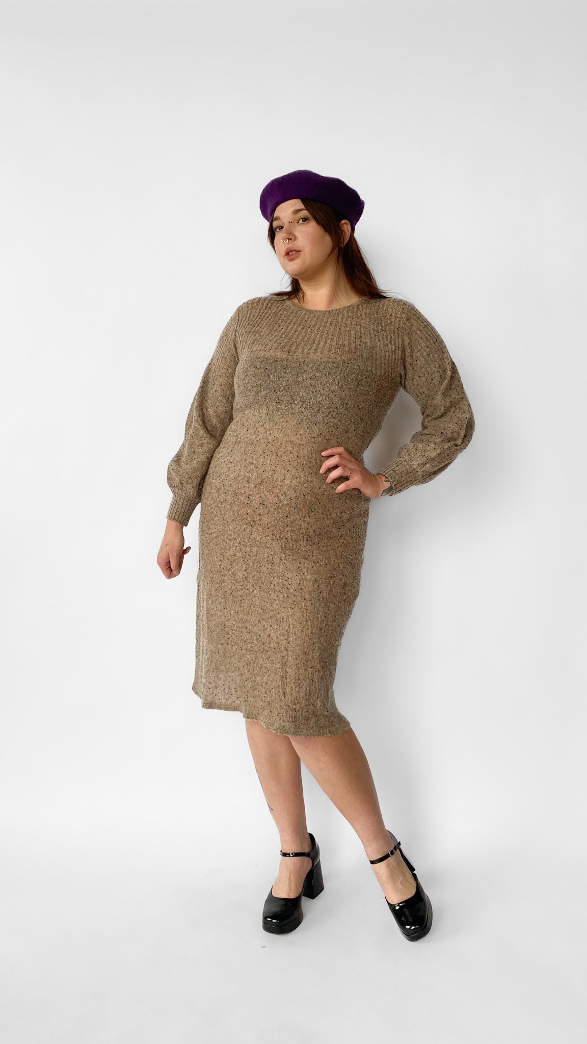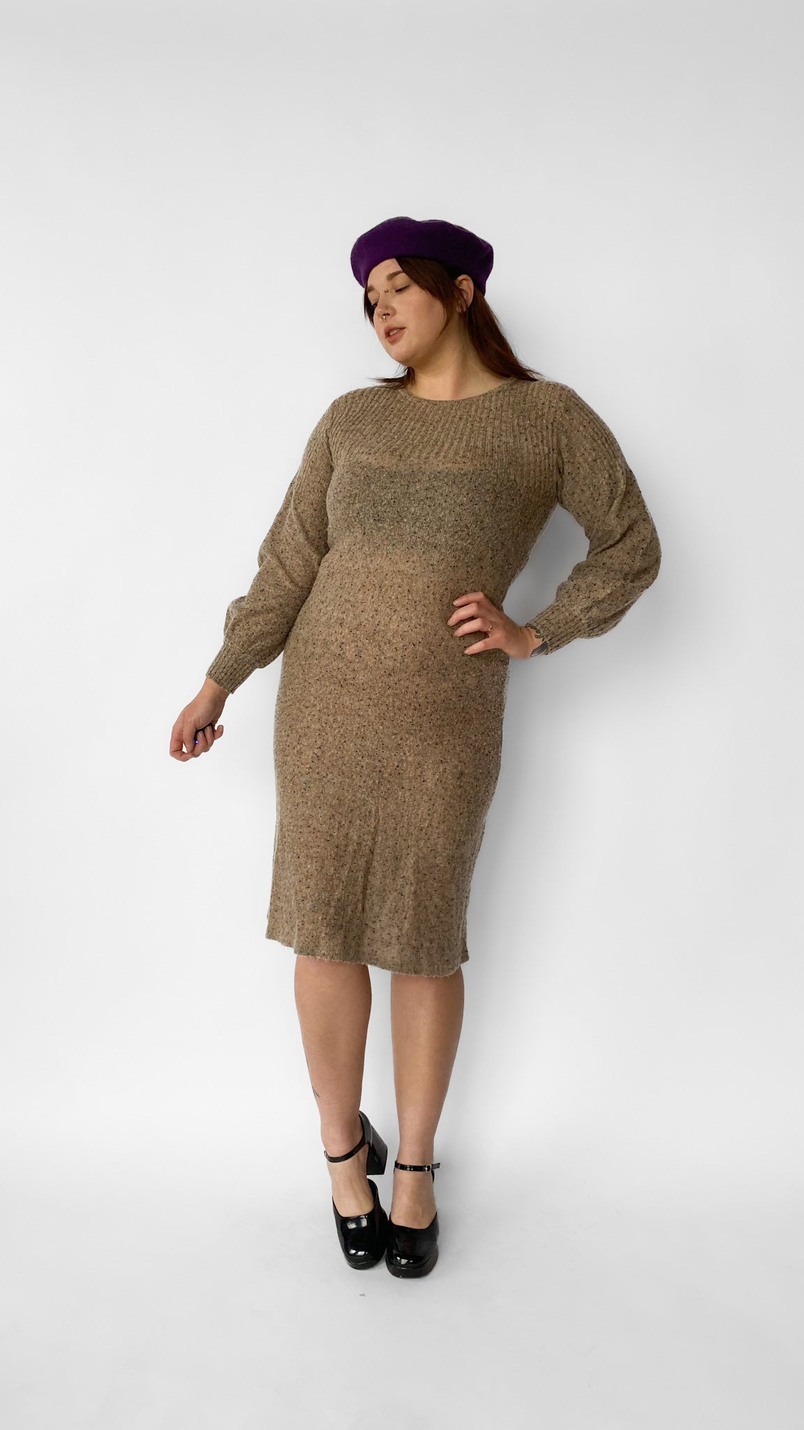 Description: Tan, knit, mid length sweater dress with black and orange flecks. Sleeves are long with a slight poof. Crew neckline. Stretchy knit fabric.