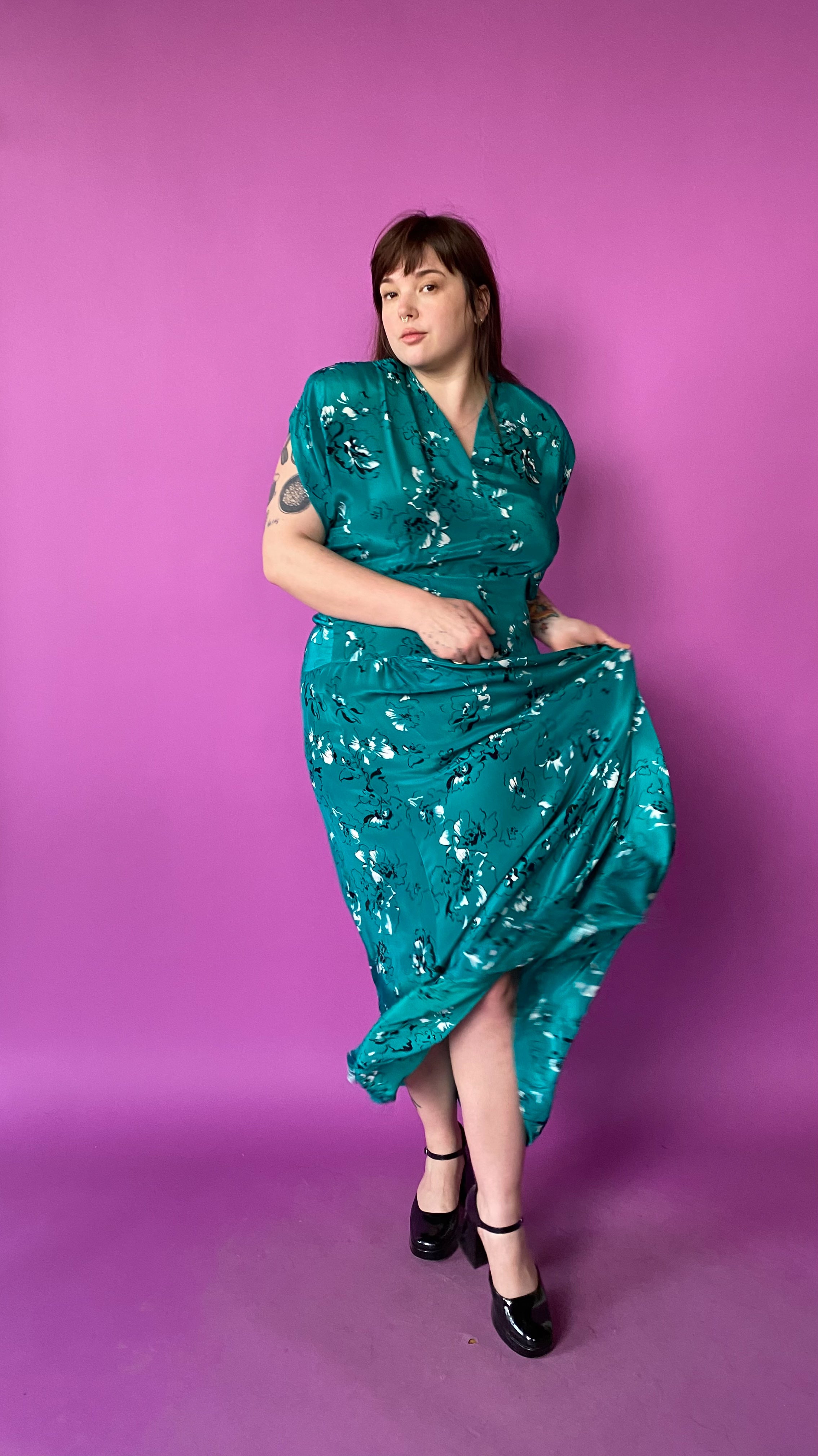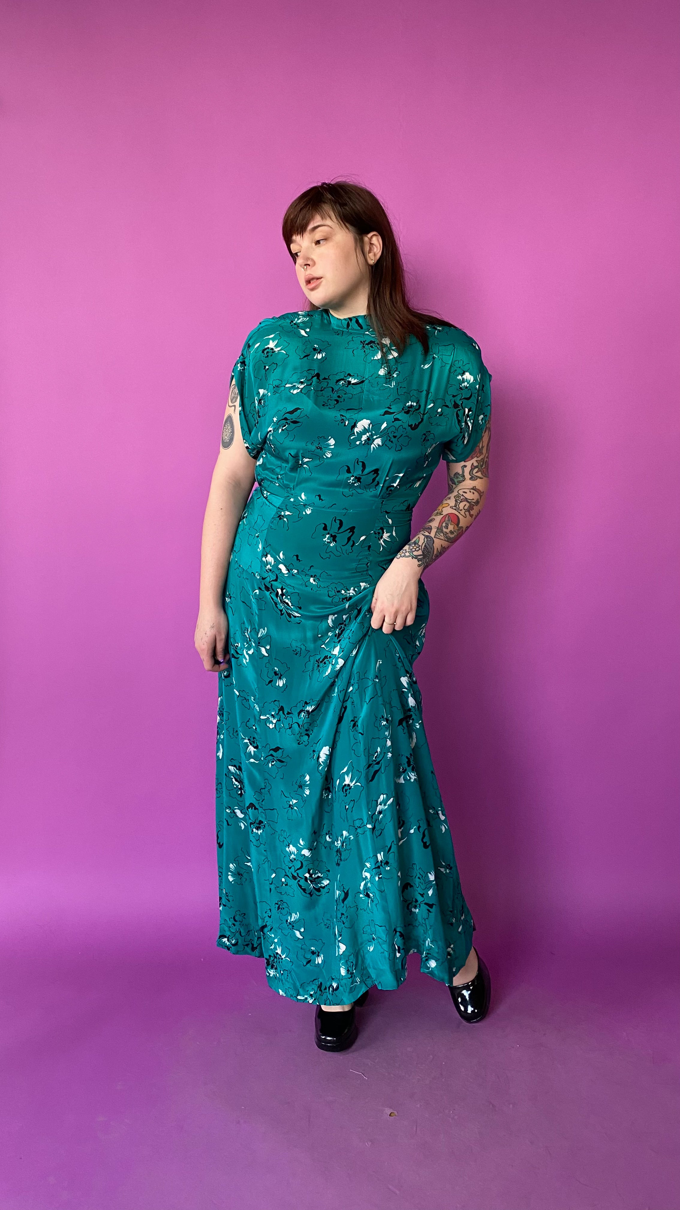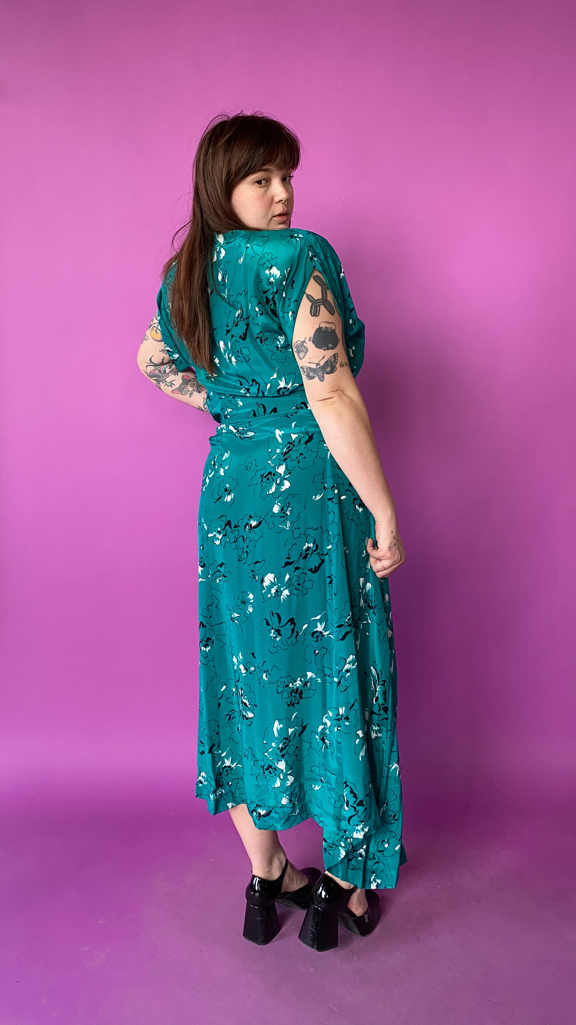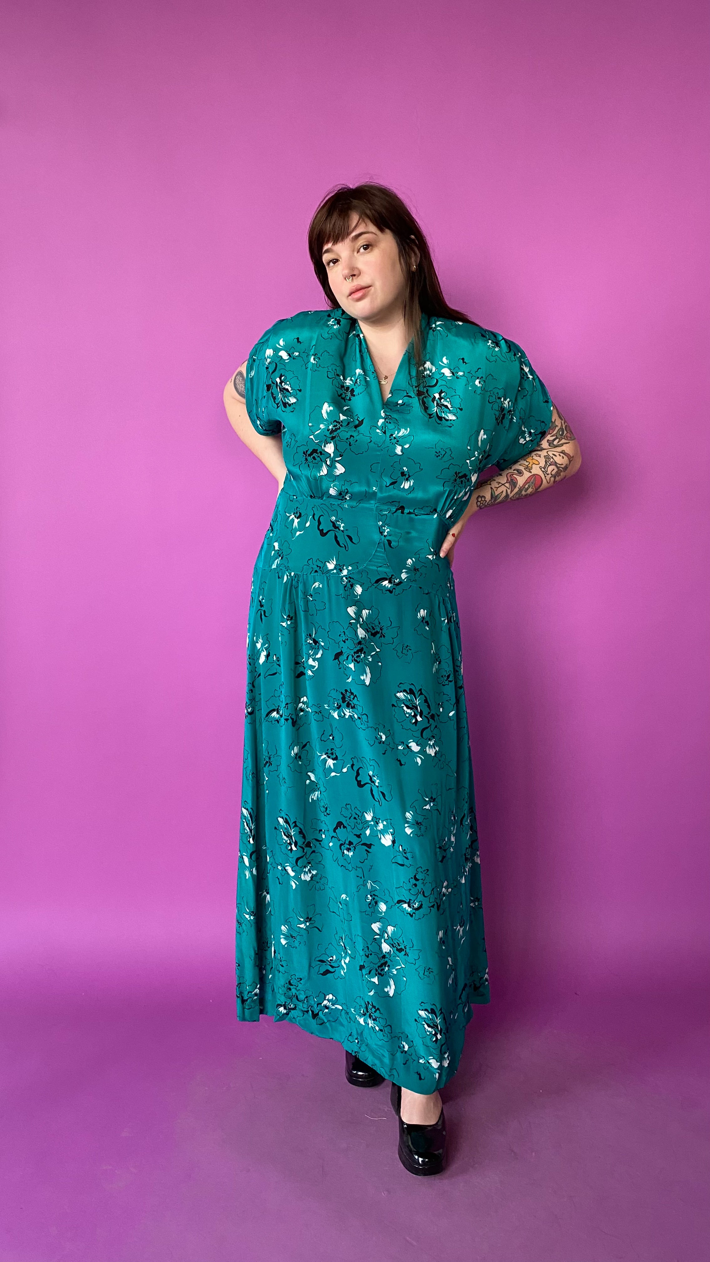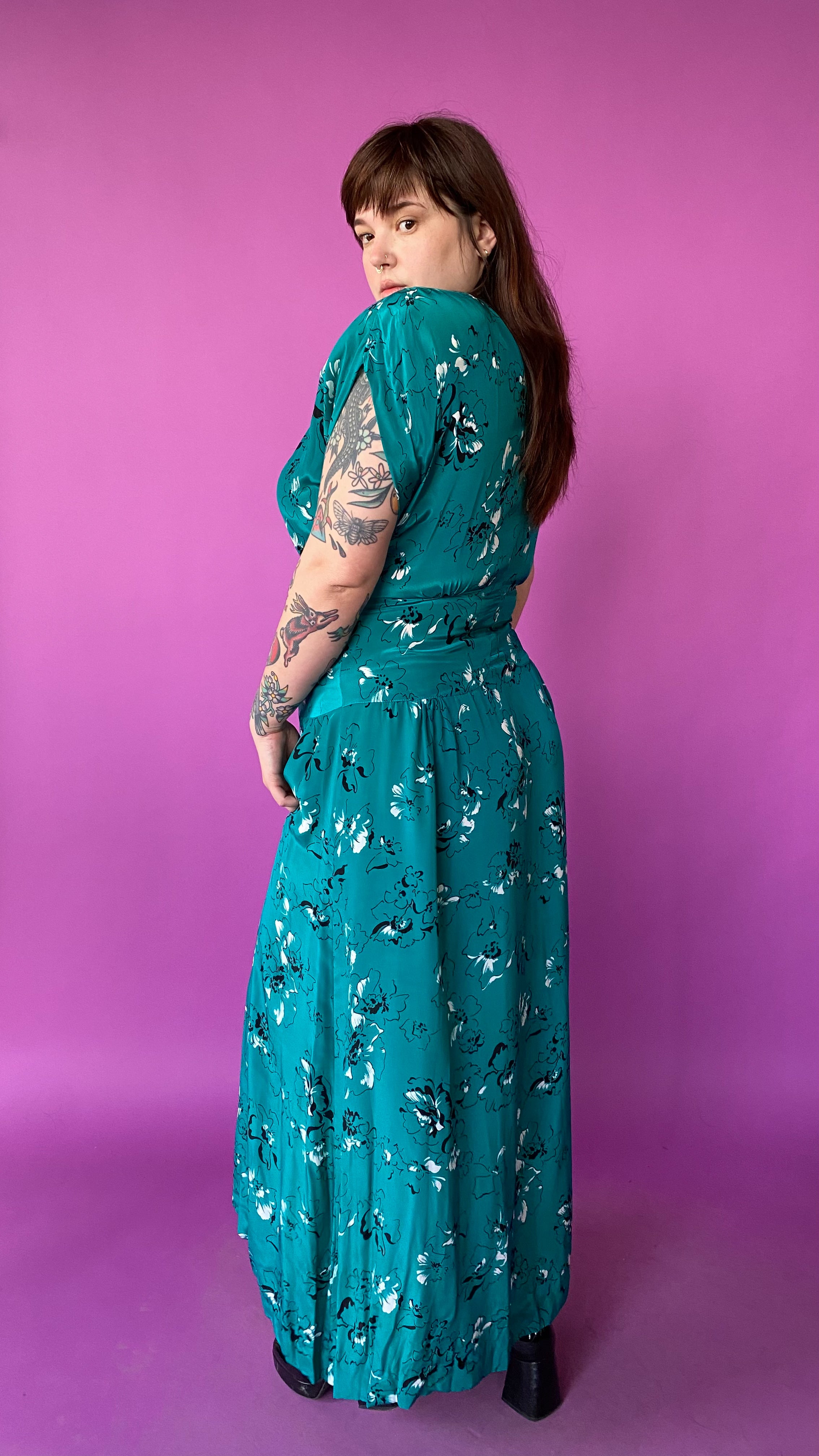 Teal short sleeve silky maxi dress with painterly abstract flowers in white and black throughout. Dress has thick shoulder pads and a side zipper.