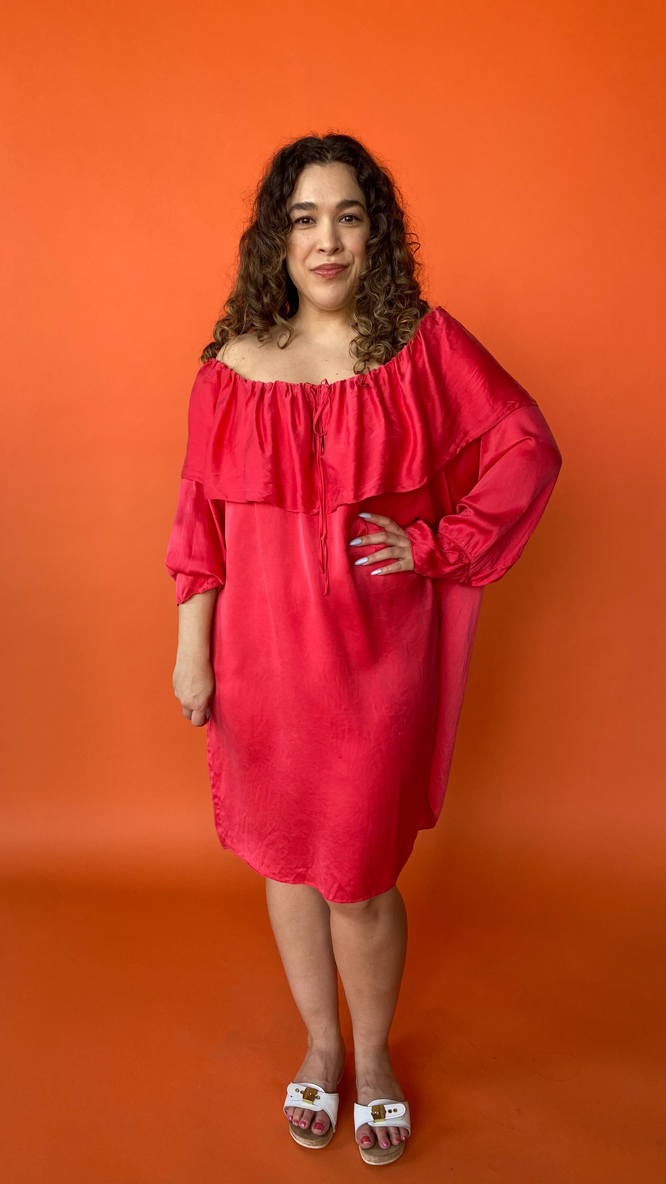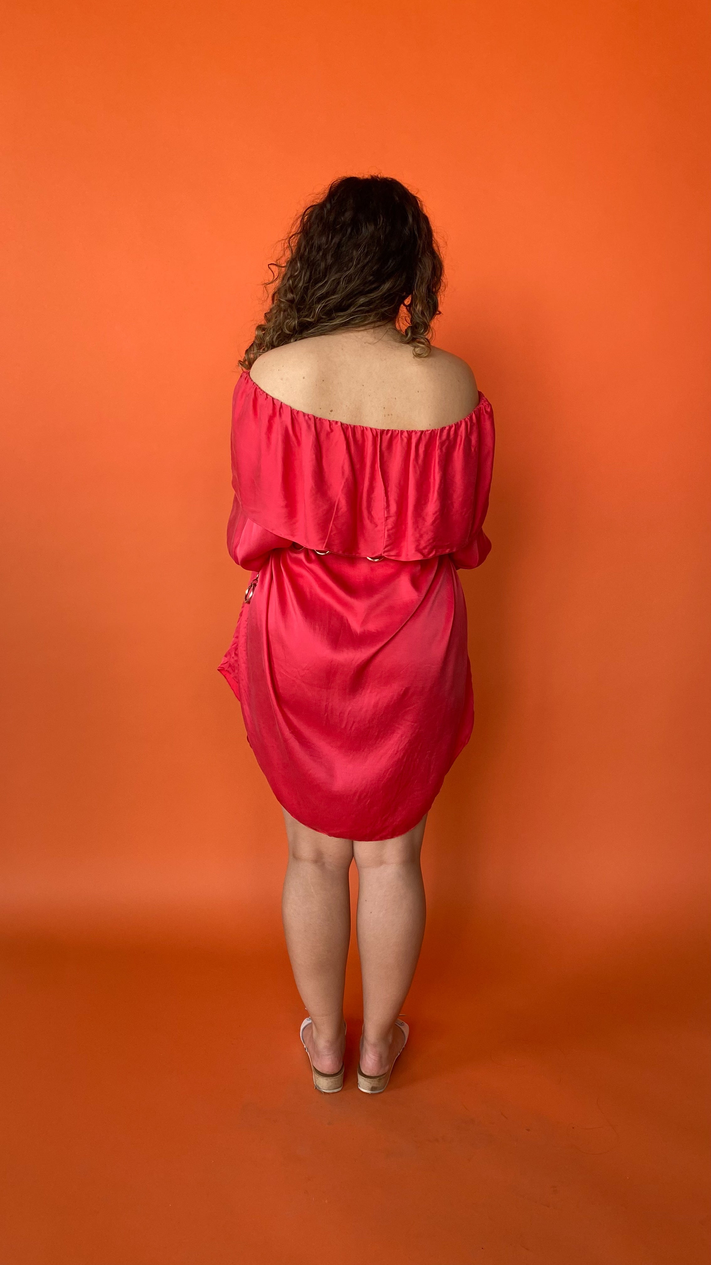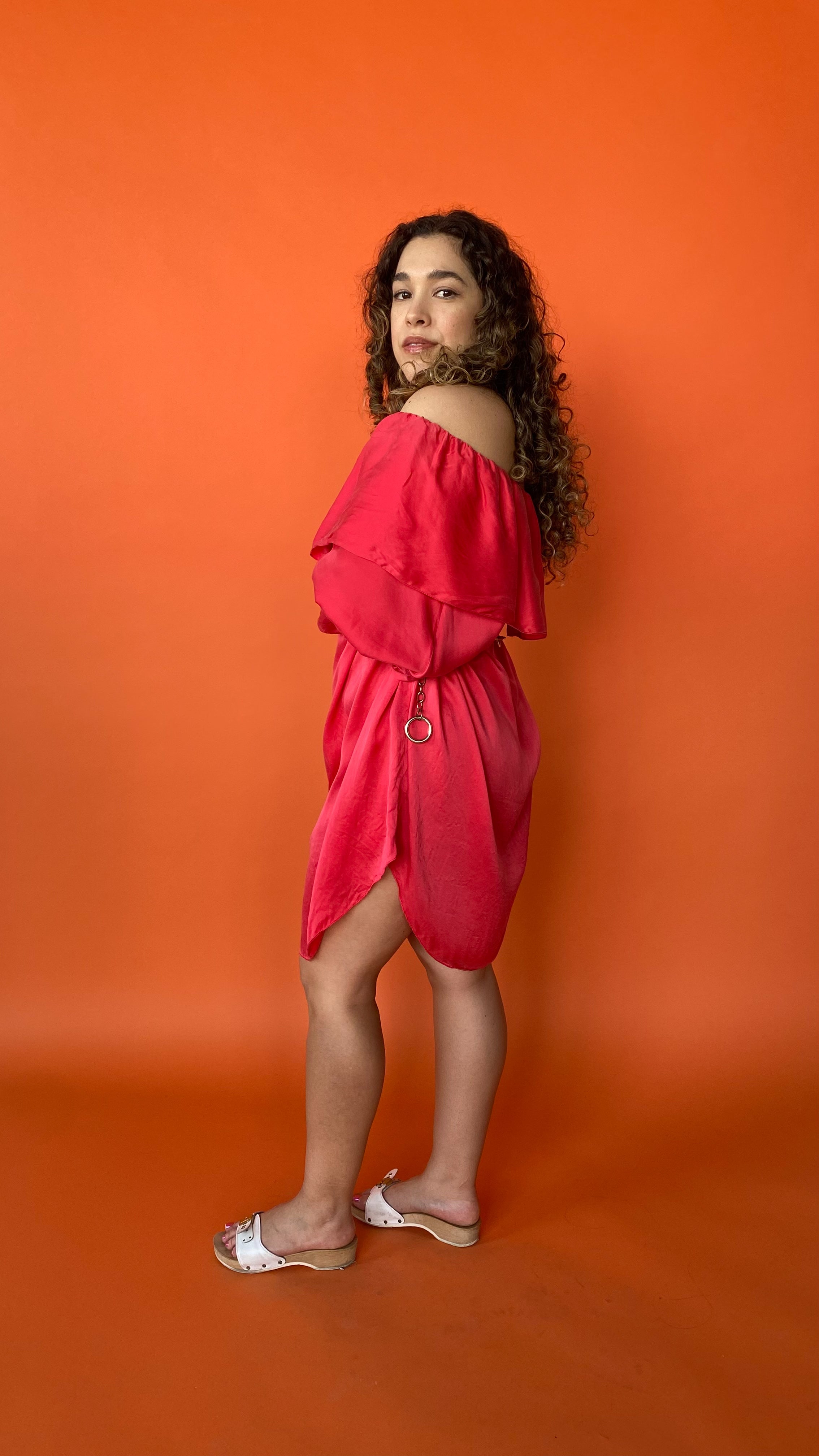 Description: 1980s flowy dress in a watermelon pinky color. This dress has an elastic top so it can be worn on or off the shoulder with a tie in the middle. There is no closure on this piece since it is so flowy. Super easy to just throw on!