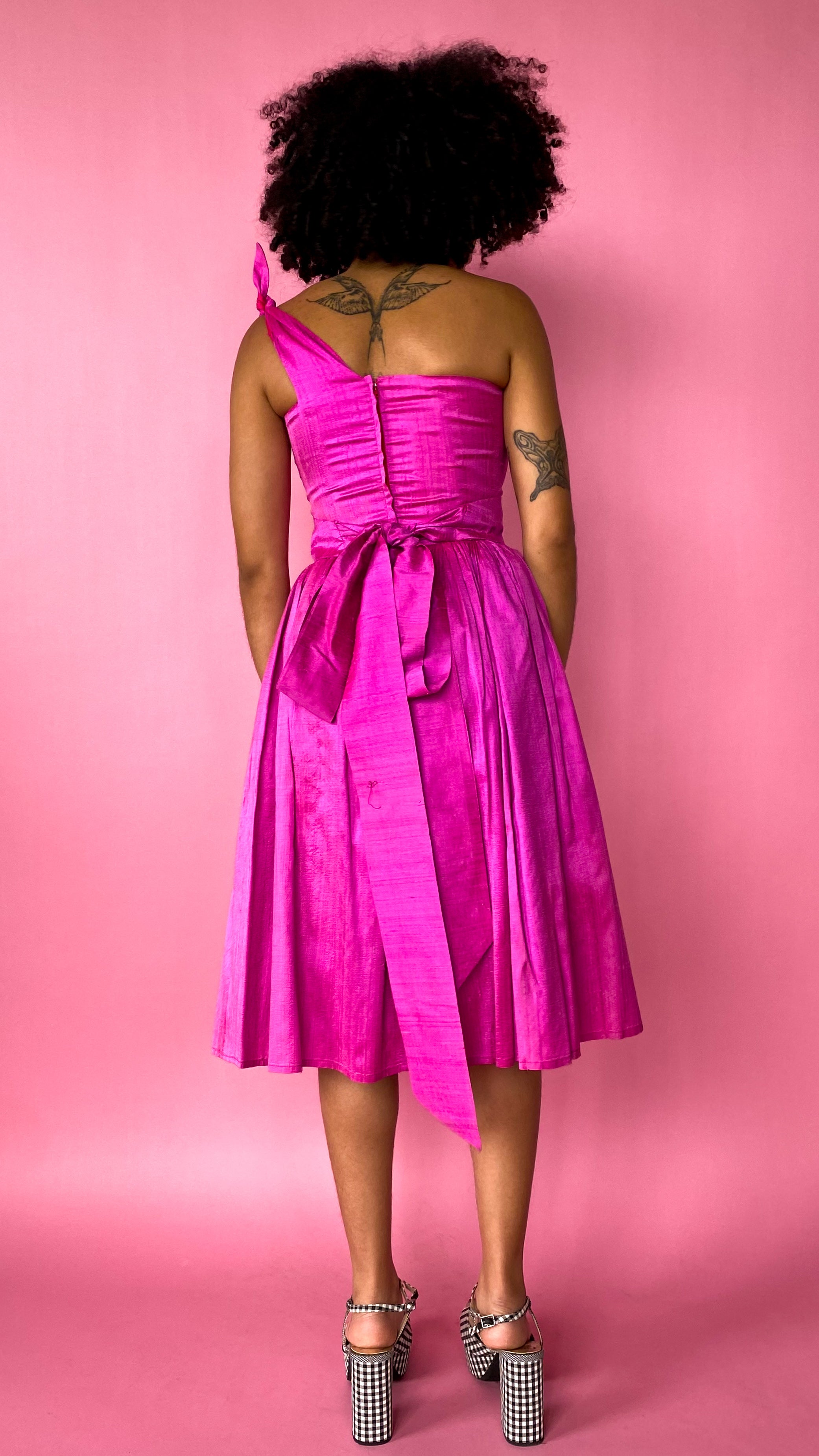 Description: Fit and flare fuchsia dress with detachable bow sash & single shoulder strap. Has zipper closure down center back, with a layer of tulle lining. Bodice has boning at seams.