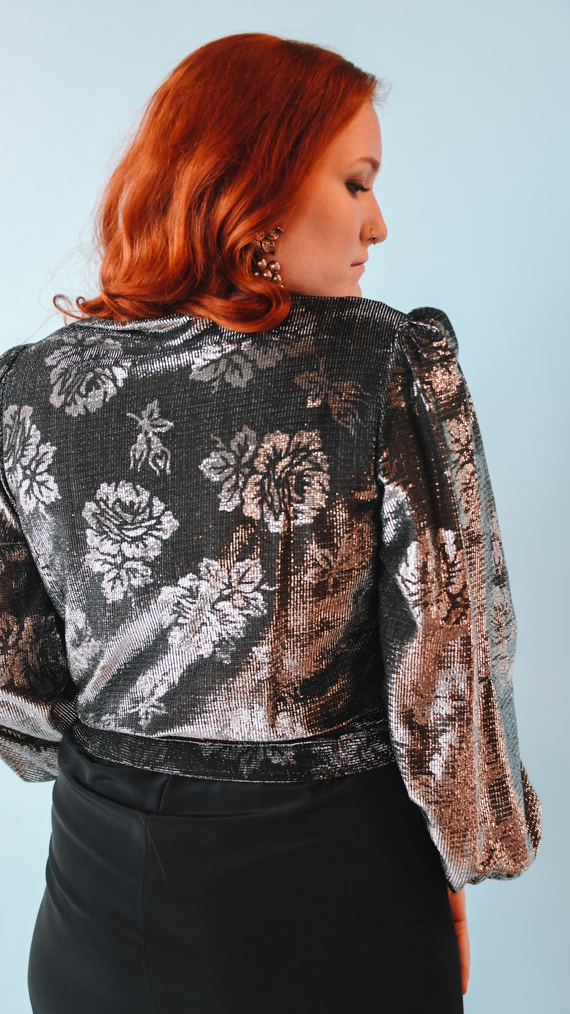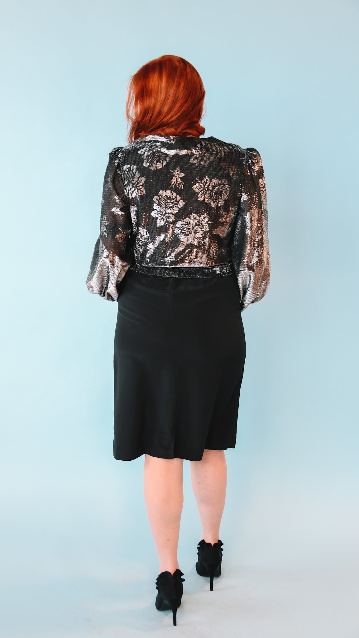 Black dress with connected silver floral top; gathered sleeves with shoulder pads.