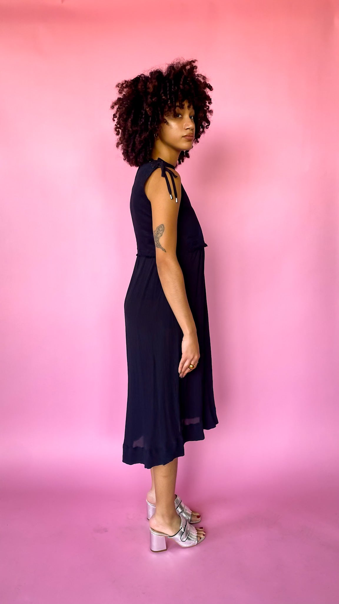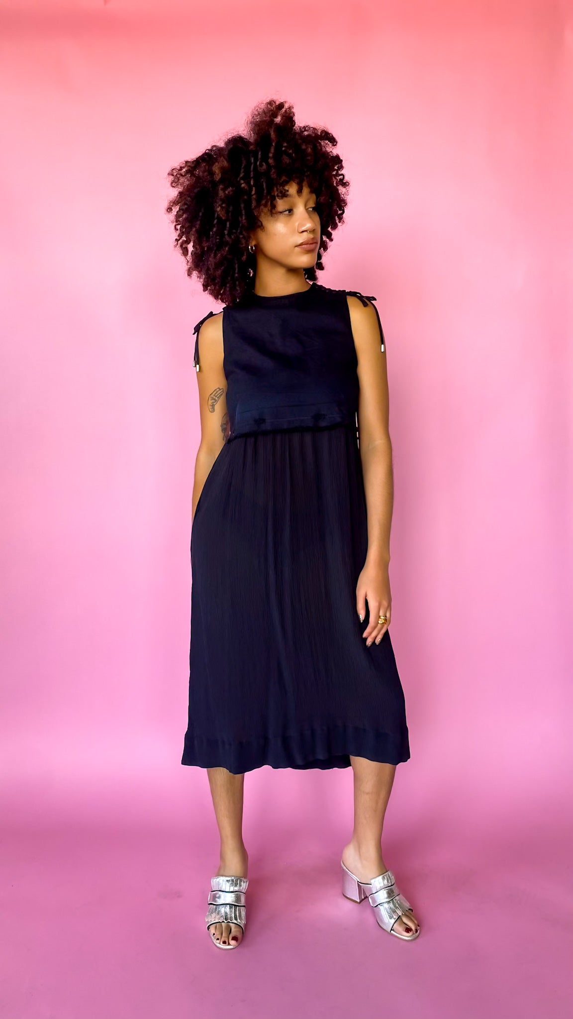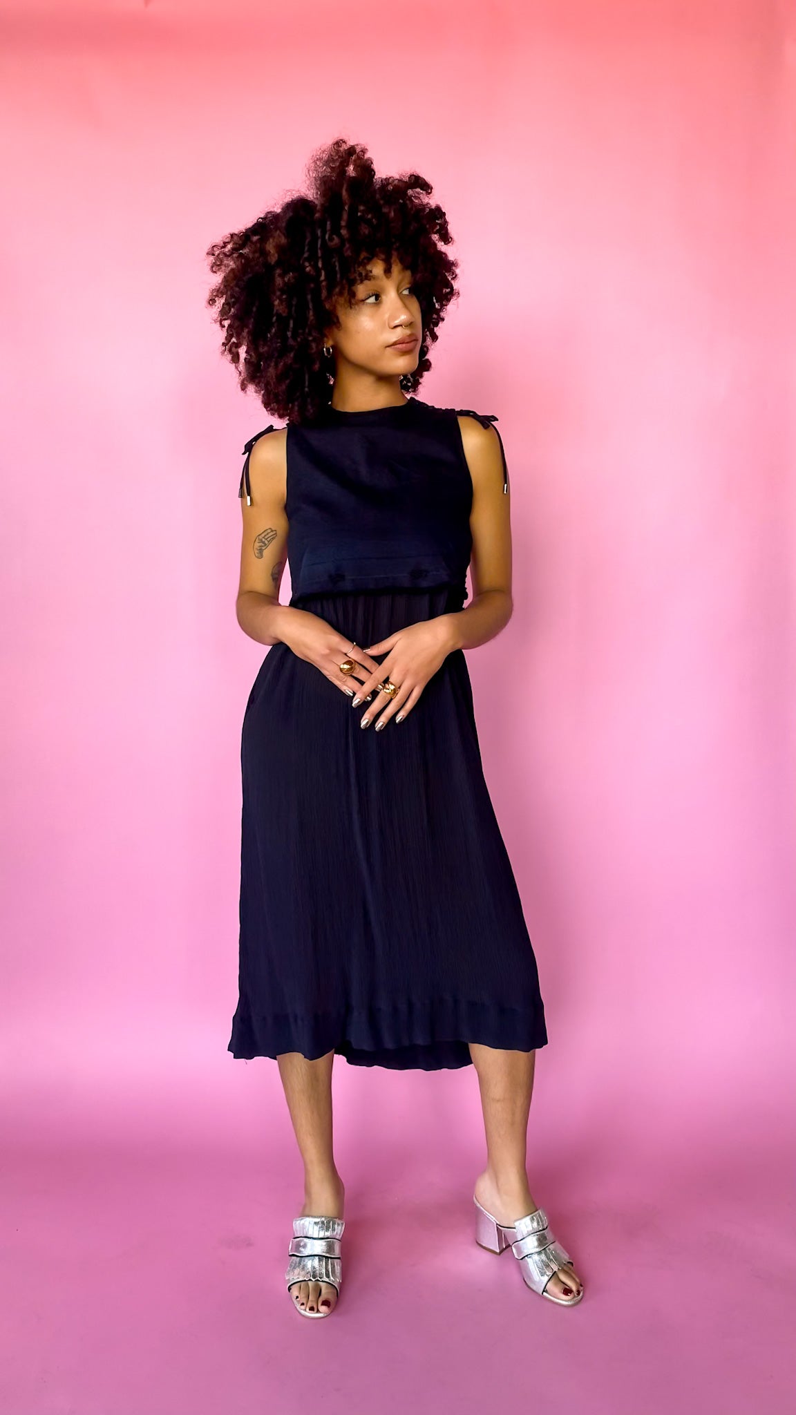 Description: Black midi length sleeveless dress with silver grommet adjustable lace up shoulder details. Distressed look at the waist hem and skirt is a crushed crinkle texture. Zipper down center back.