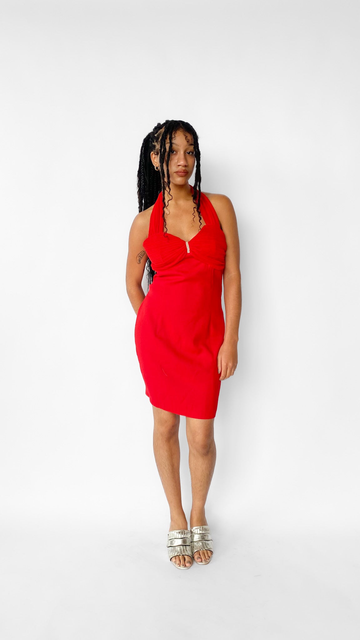 Description: Red halter dress with ruched material on bust and halter straps. Diamond accent in the middle of bust on ruched material.