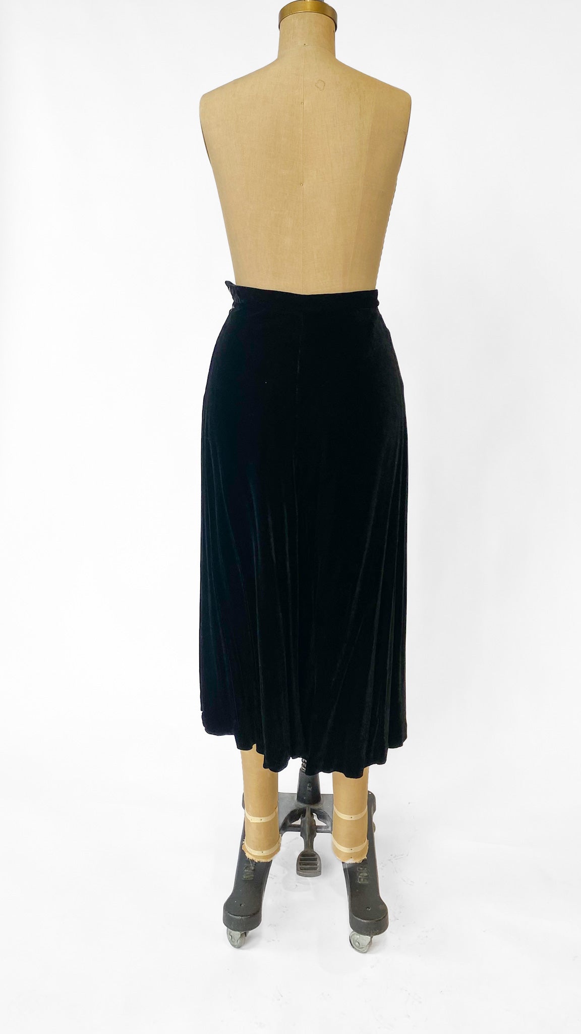Black velvet A-line midi length skirt with side zipper and hook and bar closure.