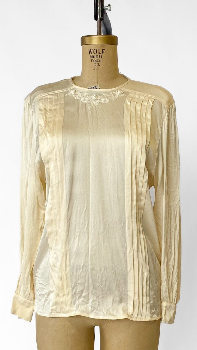 Ivory silk long sleeved blouse with pleats down the front, floral and bow embroidery around neckline with small faux pearl beads. Two buttons at the back of the neckline.