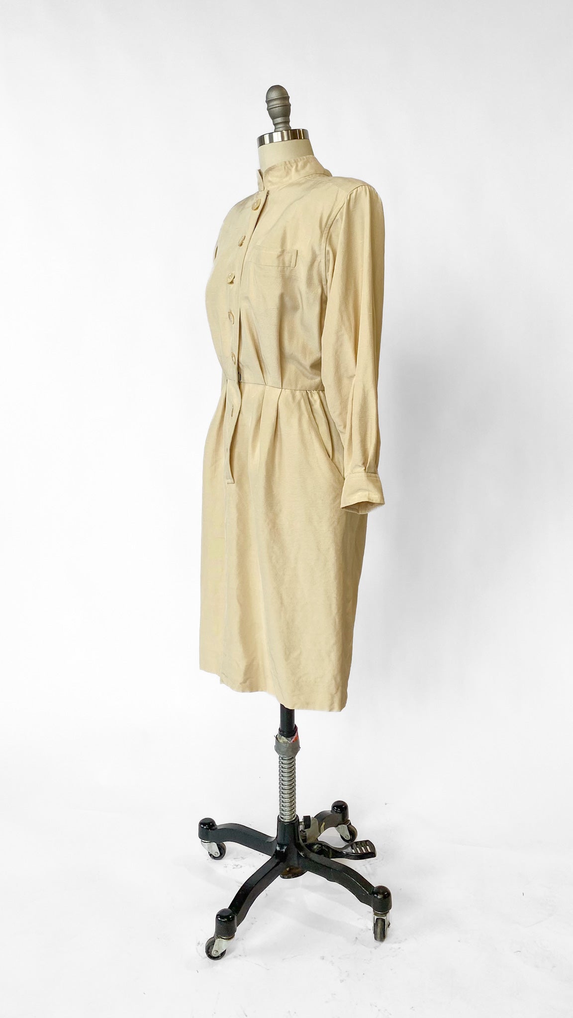 Ivory button up shirt dress with large shoulder pads, long sleeves, mock neck, and inset pockets. Large white marbled buttons, hook and bar closure at waist. Welt breast pocket.