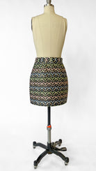 Black skirt with metallic silver woven throughout. Blue, green, and pink V pattern. Invisible zipper in side seam. Lined in black satin fabric.