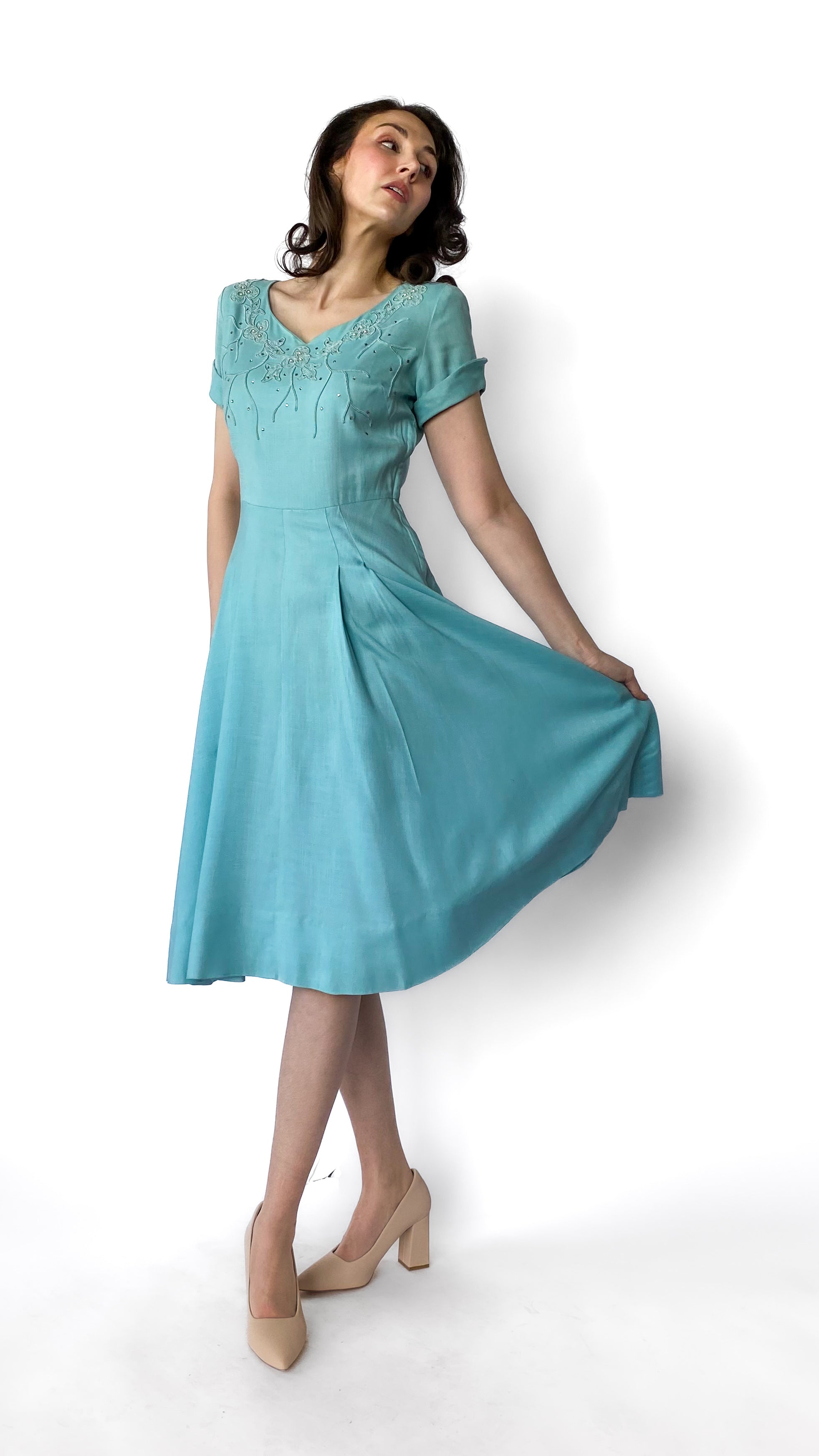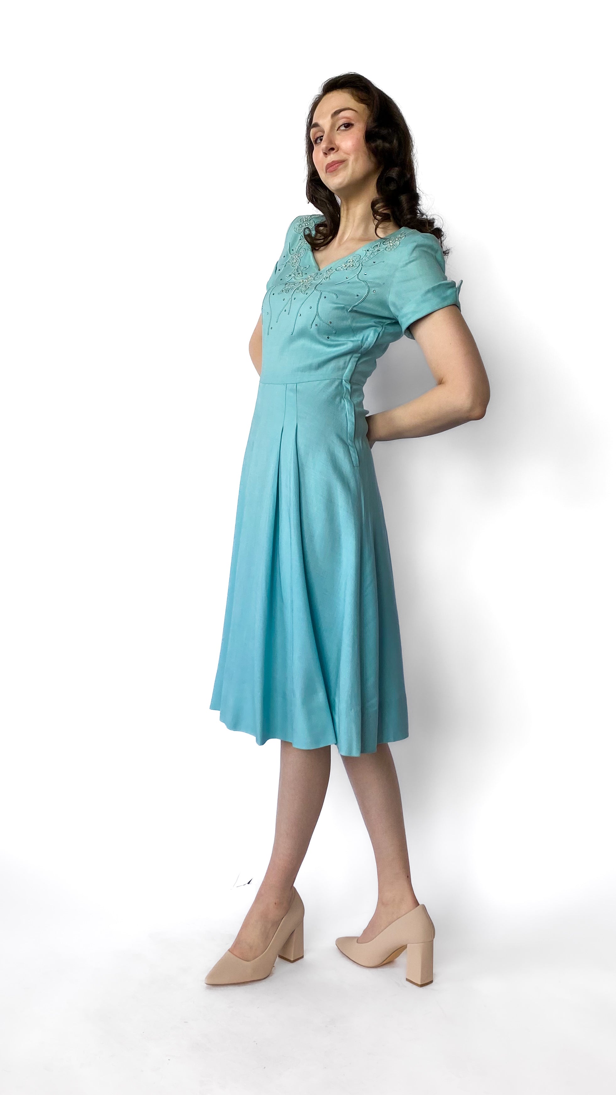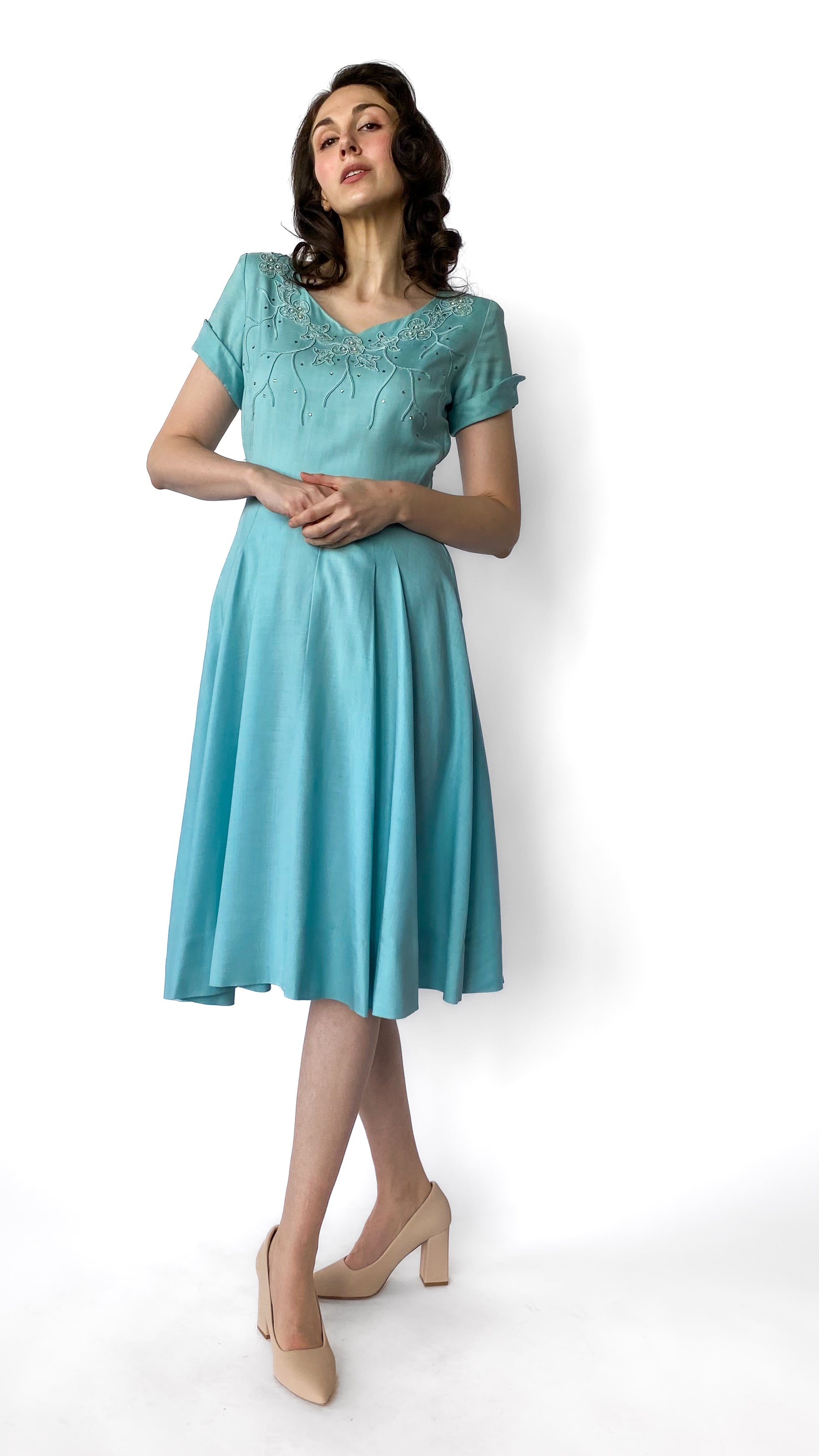1950s Light Blue Jeweled Fit and Flare Dress, sz. S/M