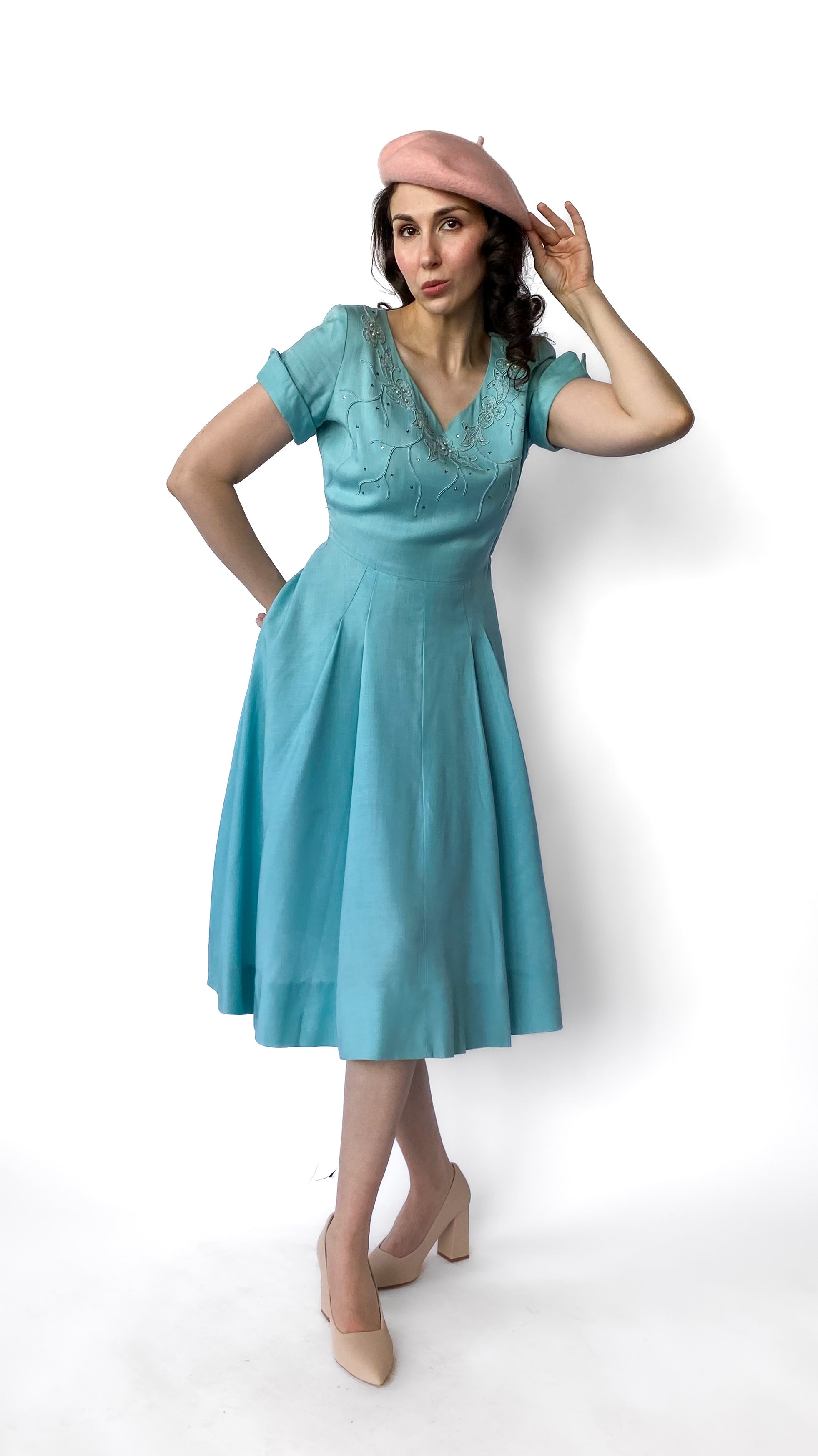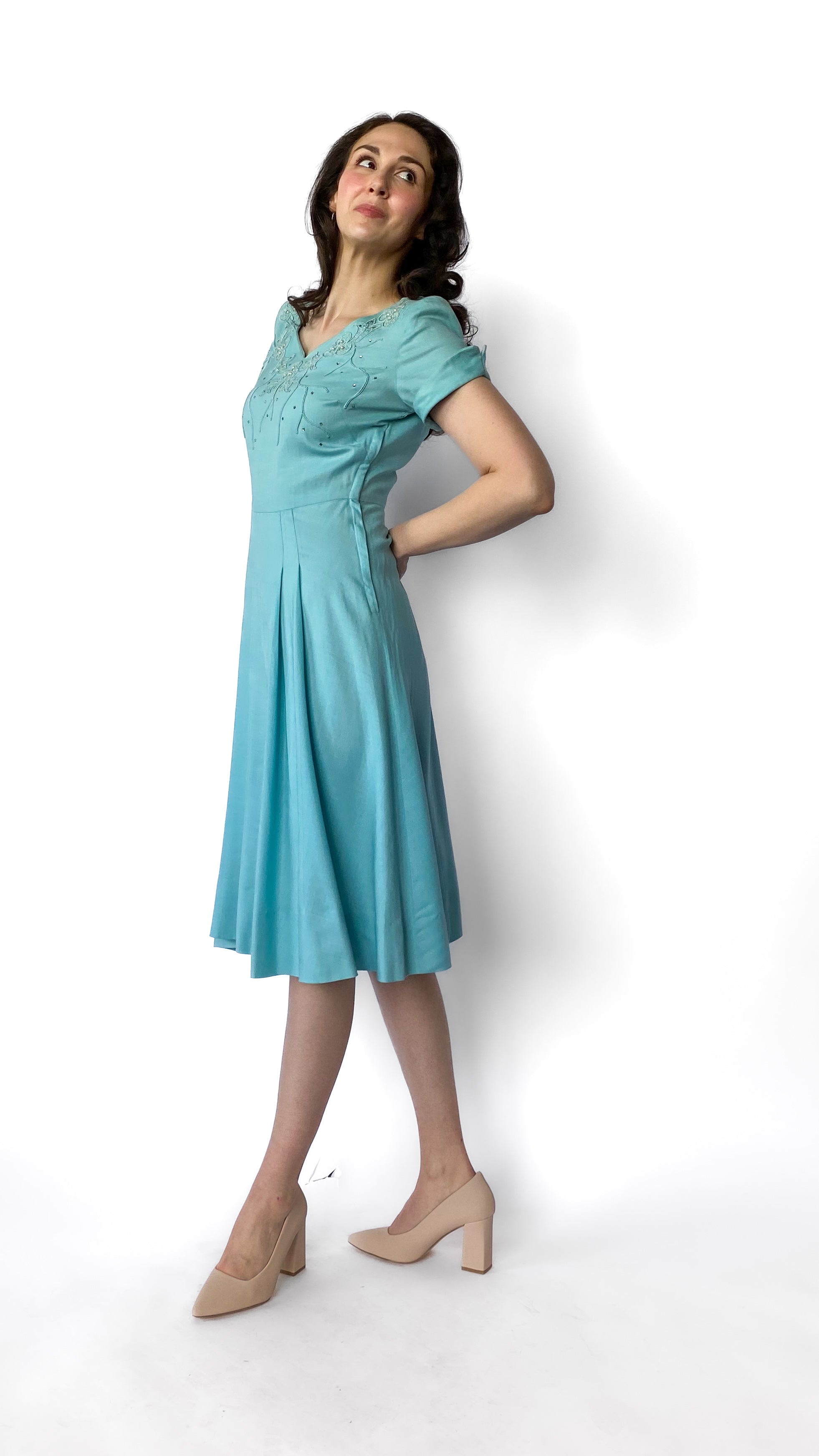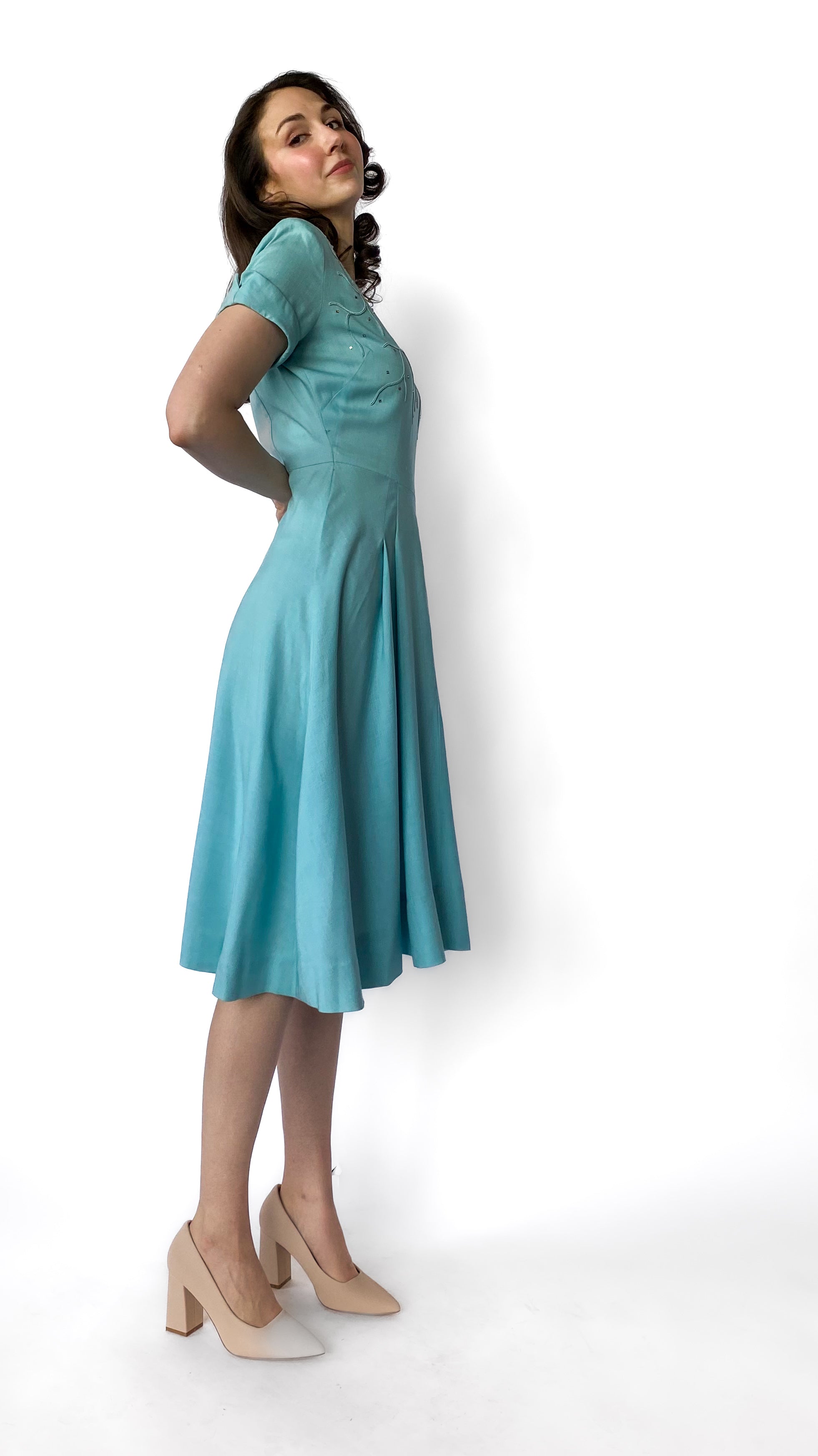 1950s Light Blue Jeweled Fit and Flare Dress, sz. S/M