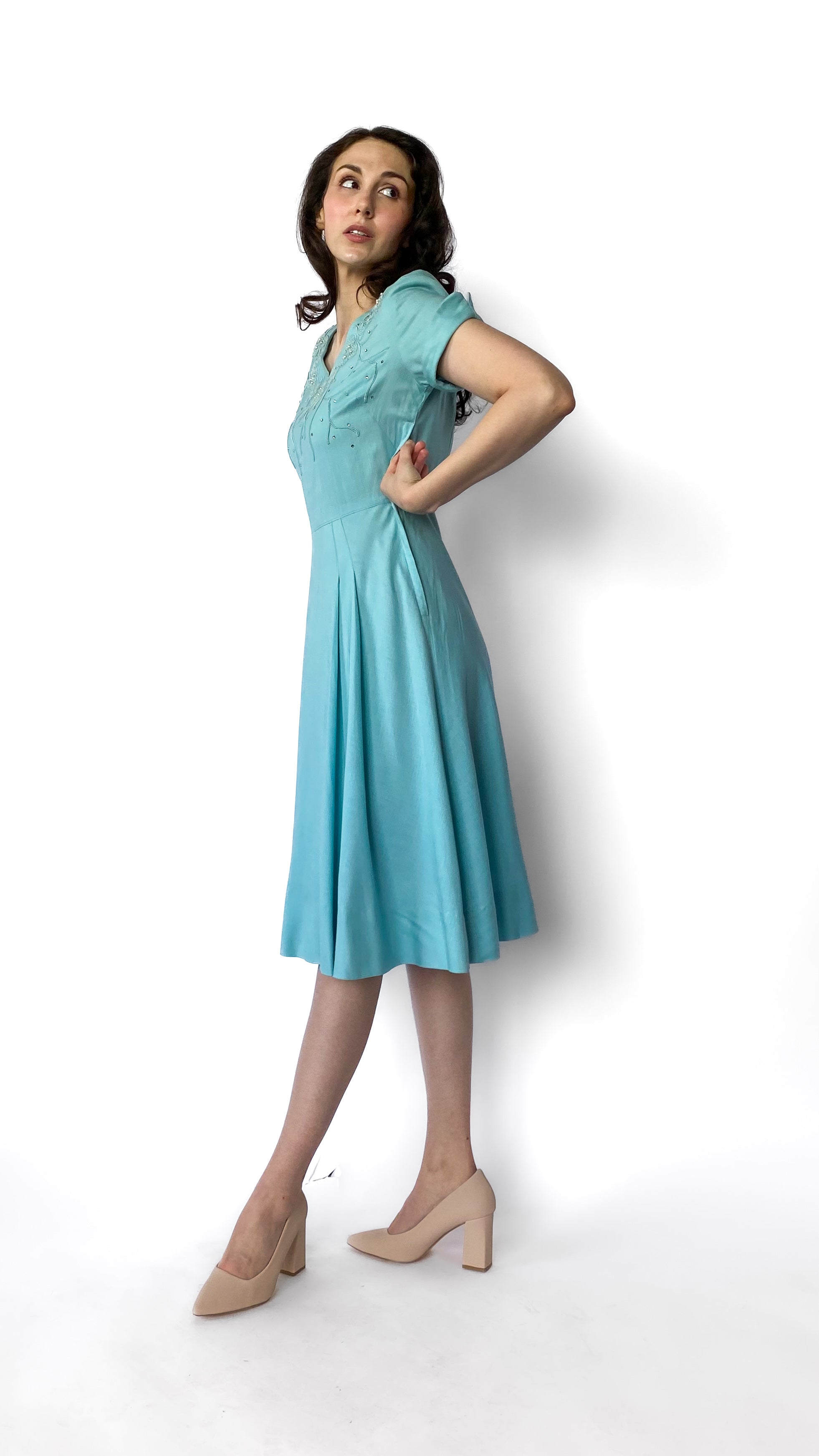 Description: Light blue short-sleeve dress with floral design adorned with pearls and rhinestones. Design continues onto back collar. Dress has a zipper on the side and sewn-in shoulder pads.