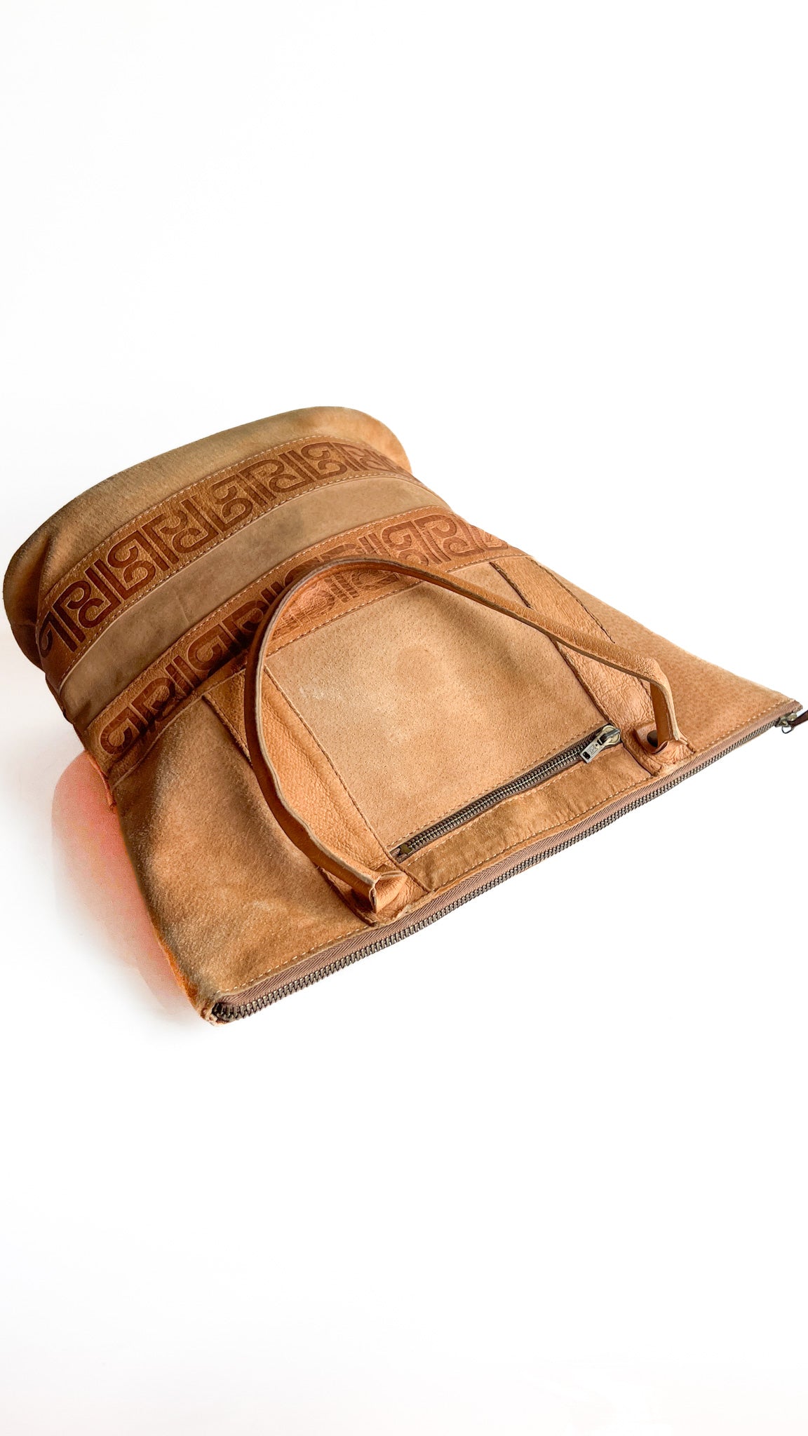 Description: Tan leather suede tote bag. Embossed design on front. Two shoulder straps. Zipper closure on top and zipper pocket on side