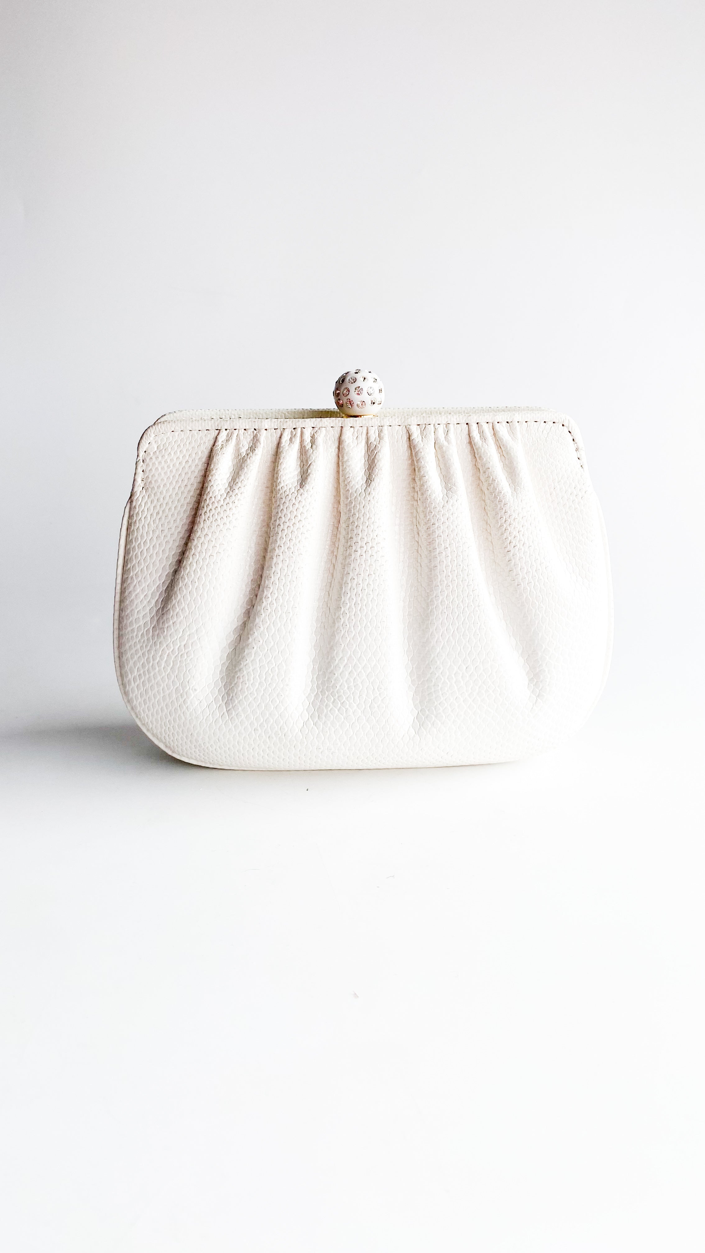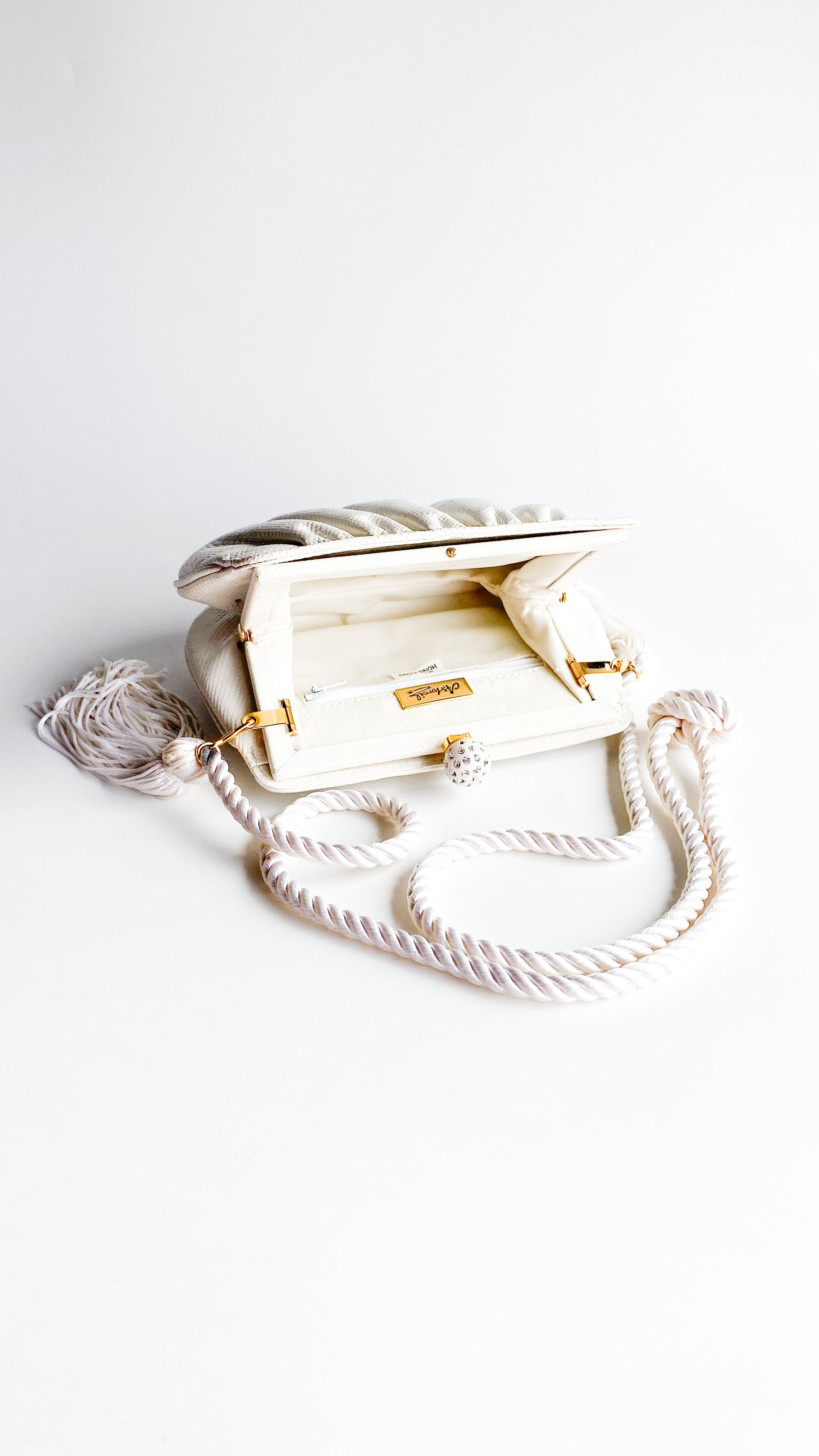 Description: White shoulder bag with snakeskin like texture and clam shell shape. Gold toned hardware and sphere clasp at top with rhinestones embedded in. Bag opens to one compartment with a lining pocket that closes with small zipper. Comes with removable tassel strap.