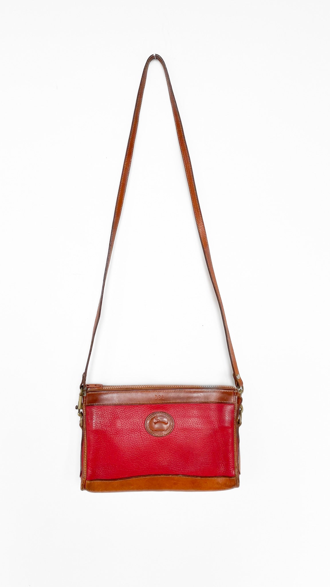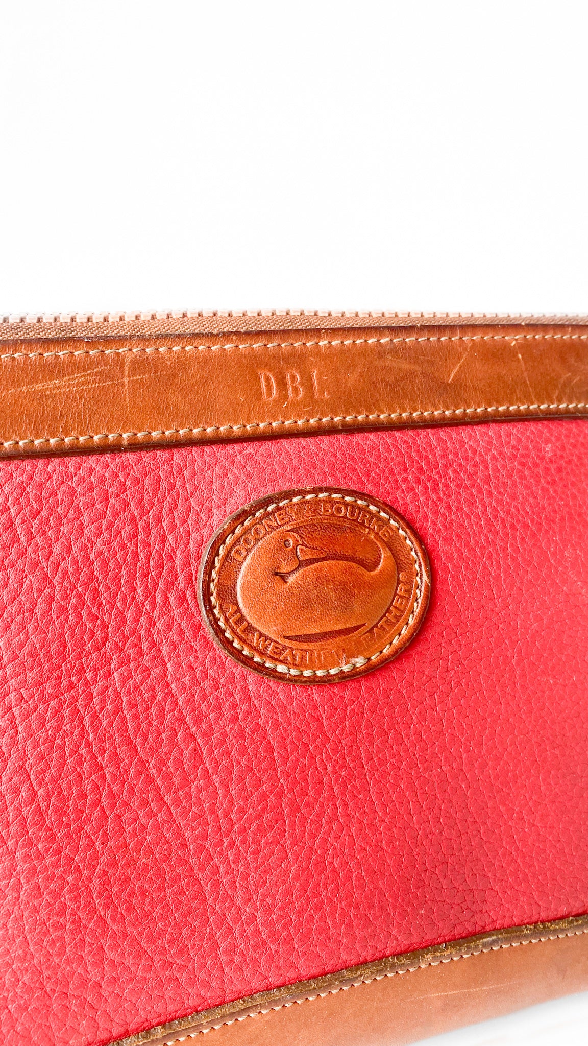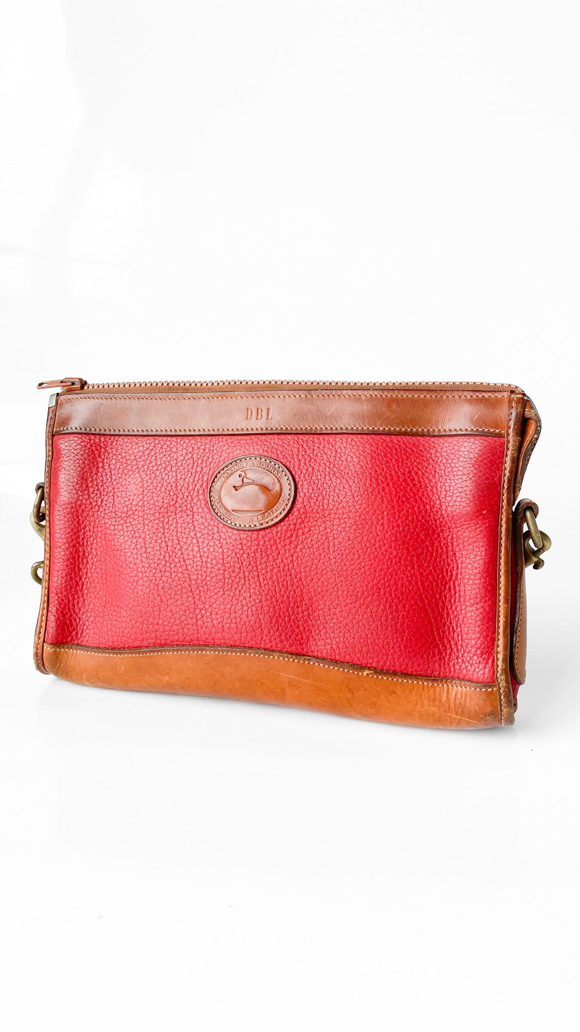 Description: Dooney & Bourke brown and red leather bag. Interior of bag has a zippered pouch and a clasp pouch. Straps are detachable. Exterior of bag has a leather embroidered Dooney & Bourke label with a duck. Top of purse near zipper has "DBL" initials. Hardware is brass.