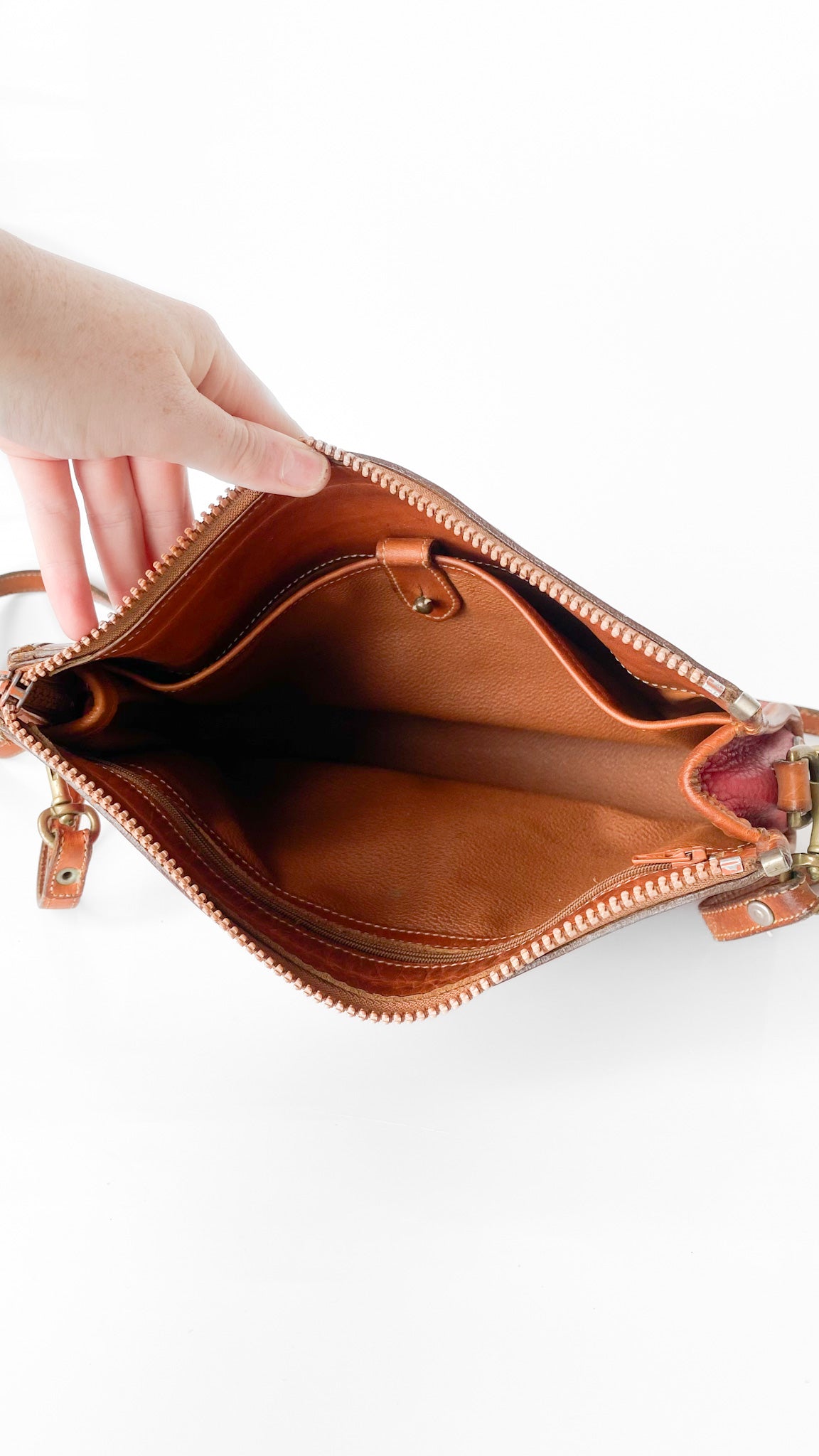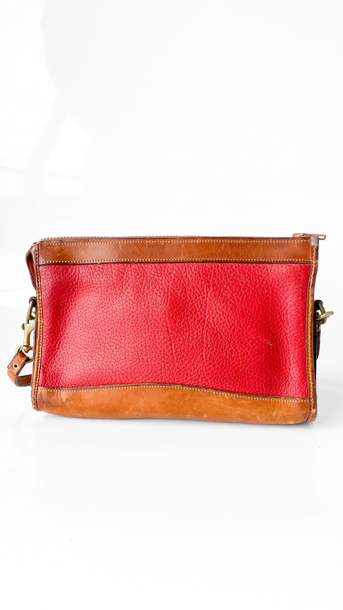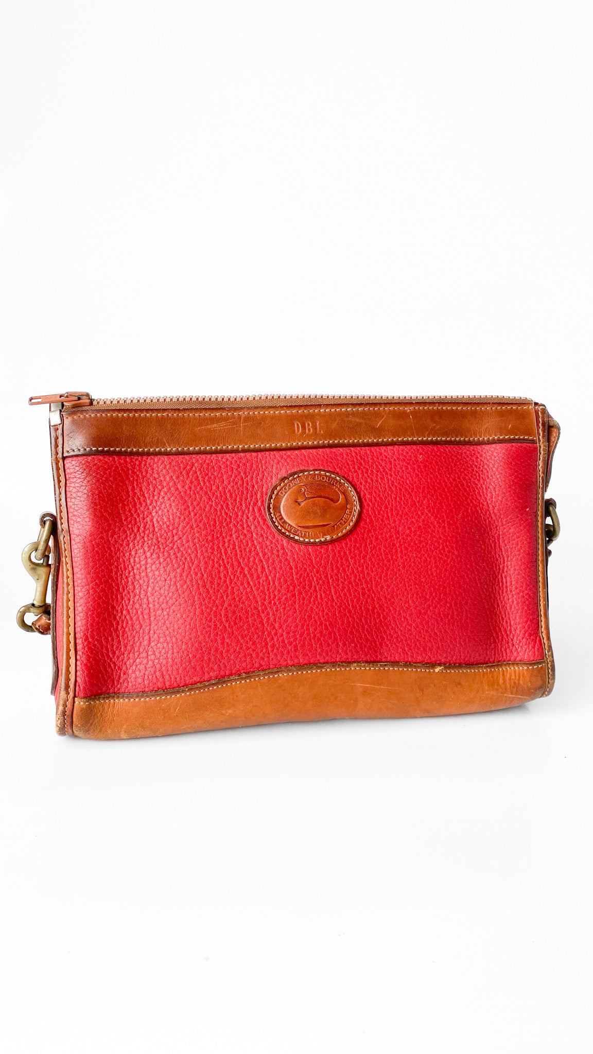 Description: Dooney & Bourke brown and red leather bag. Interior of bag has a zippered pouch and a clasp pouch. Straps are detachable. Exterior of bag has a leather embroidered Dooney & Bourke label with a duck. Top of purse near zipper has "DBL" initials. Hardware is brass.