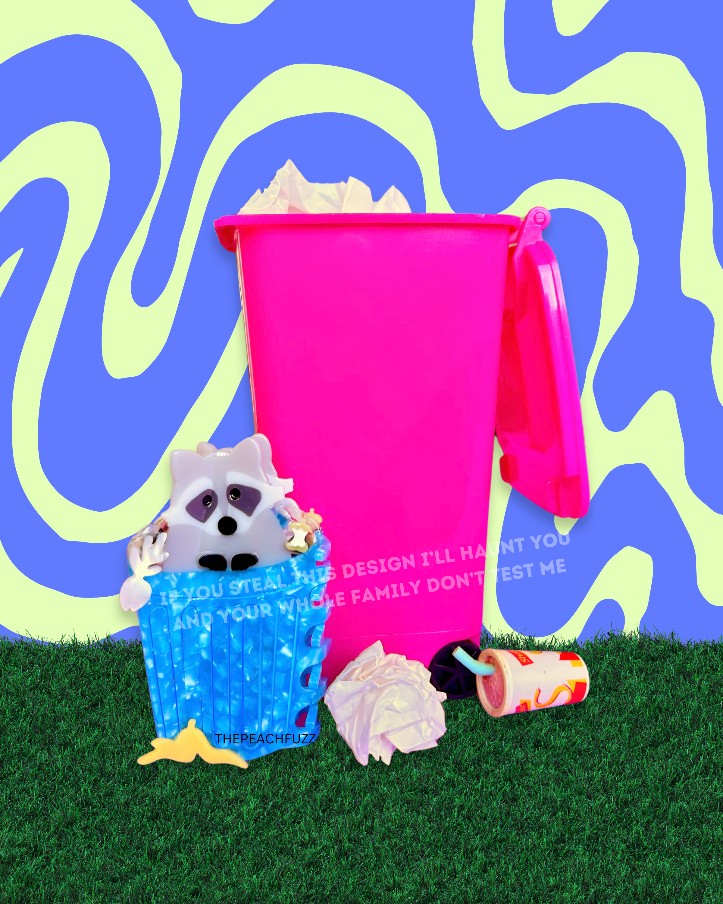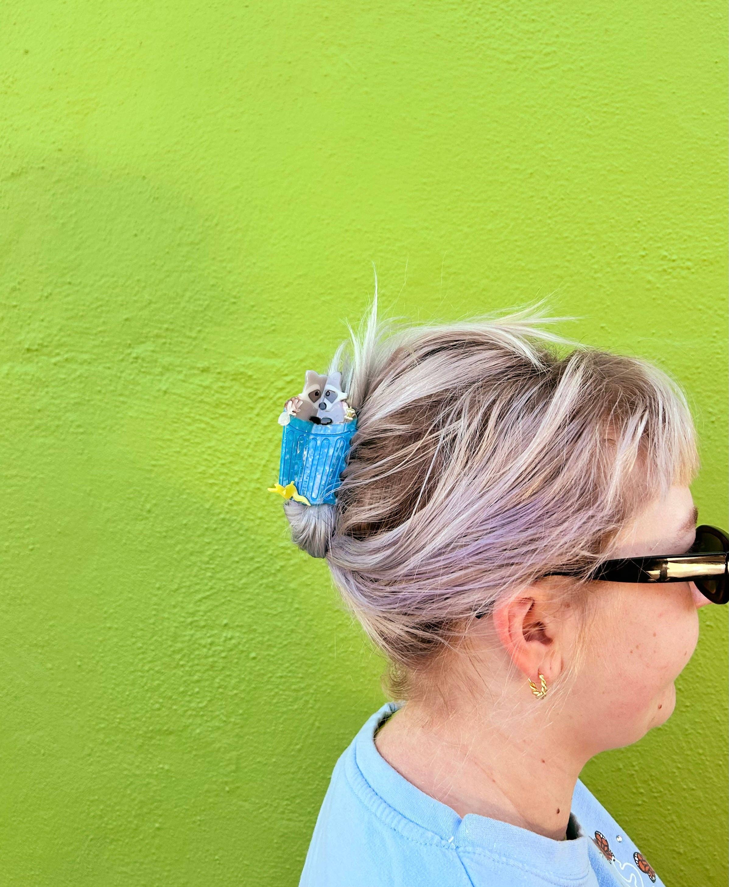 I'M THE TRASH MAN! And every trash man deserves their own trash panda. This raccoon inspired hair claw comes complete with a little guy in his cozy trash can and all his favorite scraps.