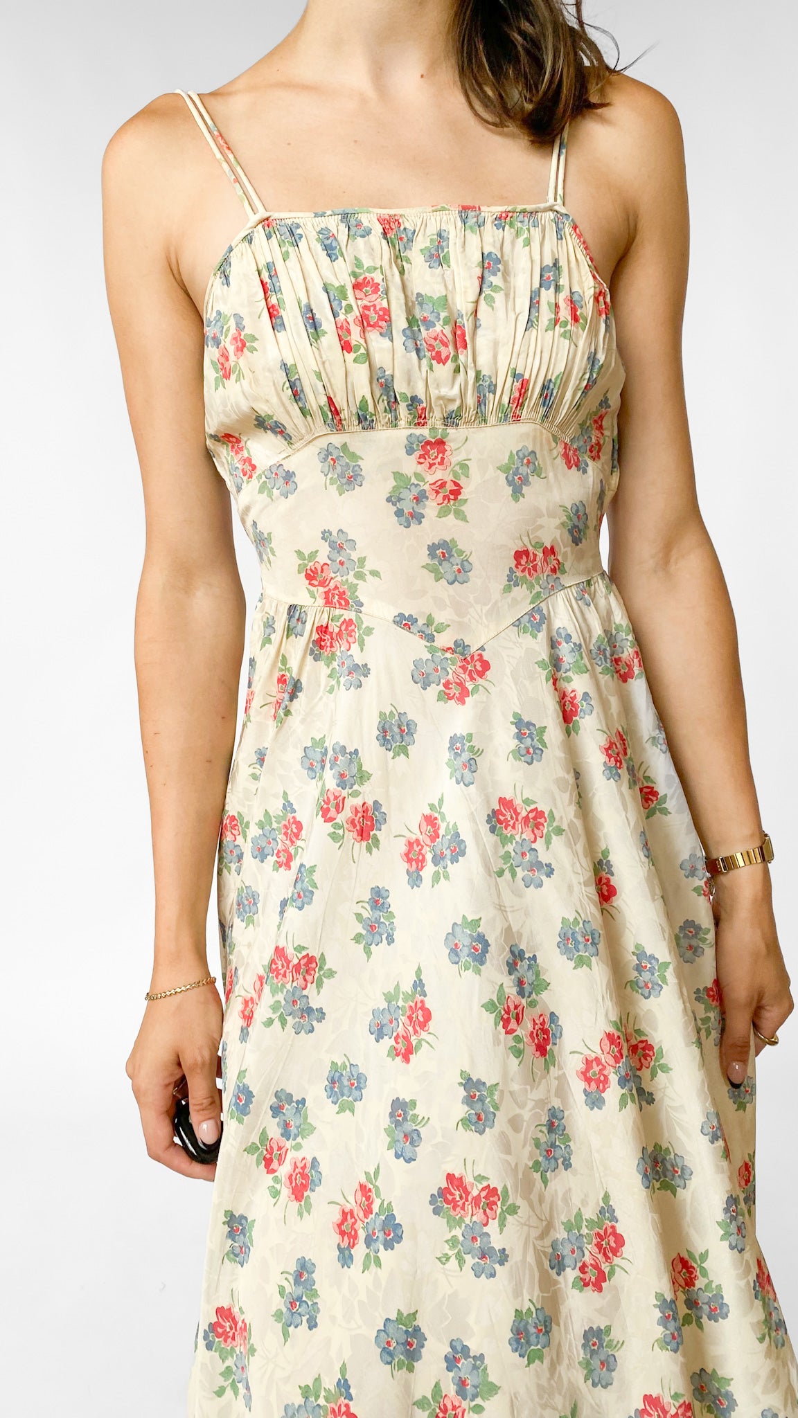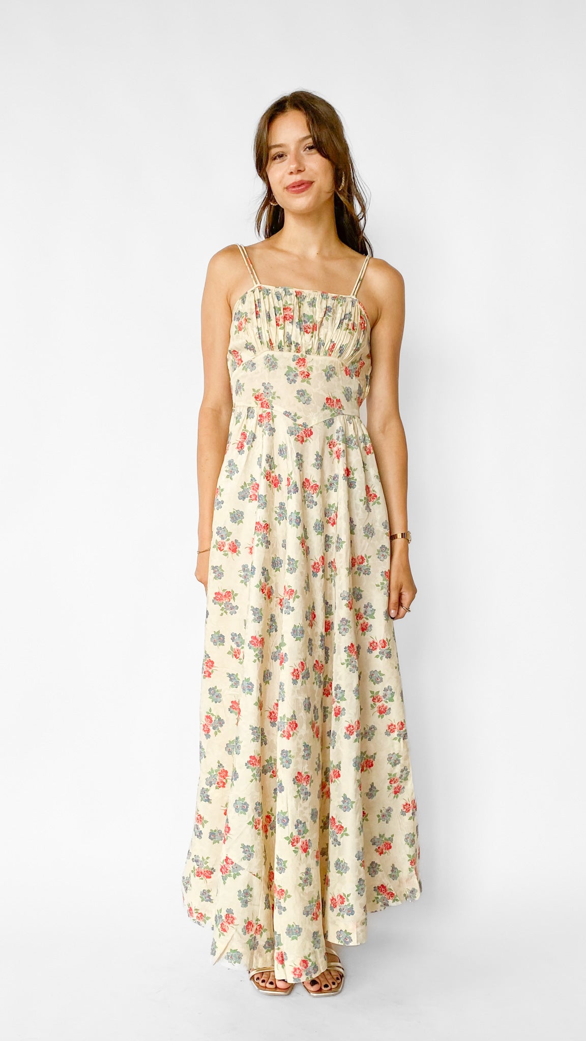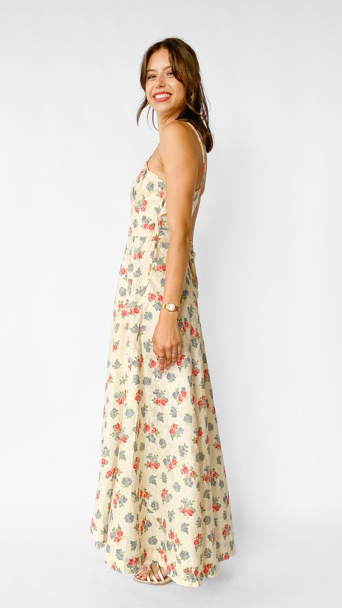 Description: Ivory floral maxi dress with pleated bust. Has side zipper closure and sashes at waist to adjust fit. Dress is unlined. Has double spaghetti straps.