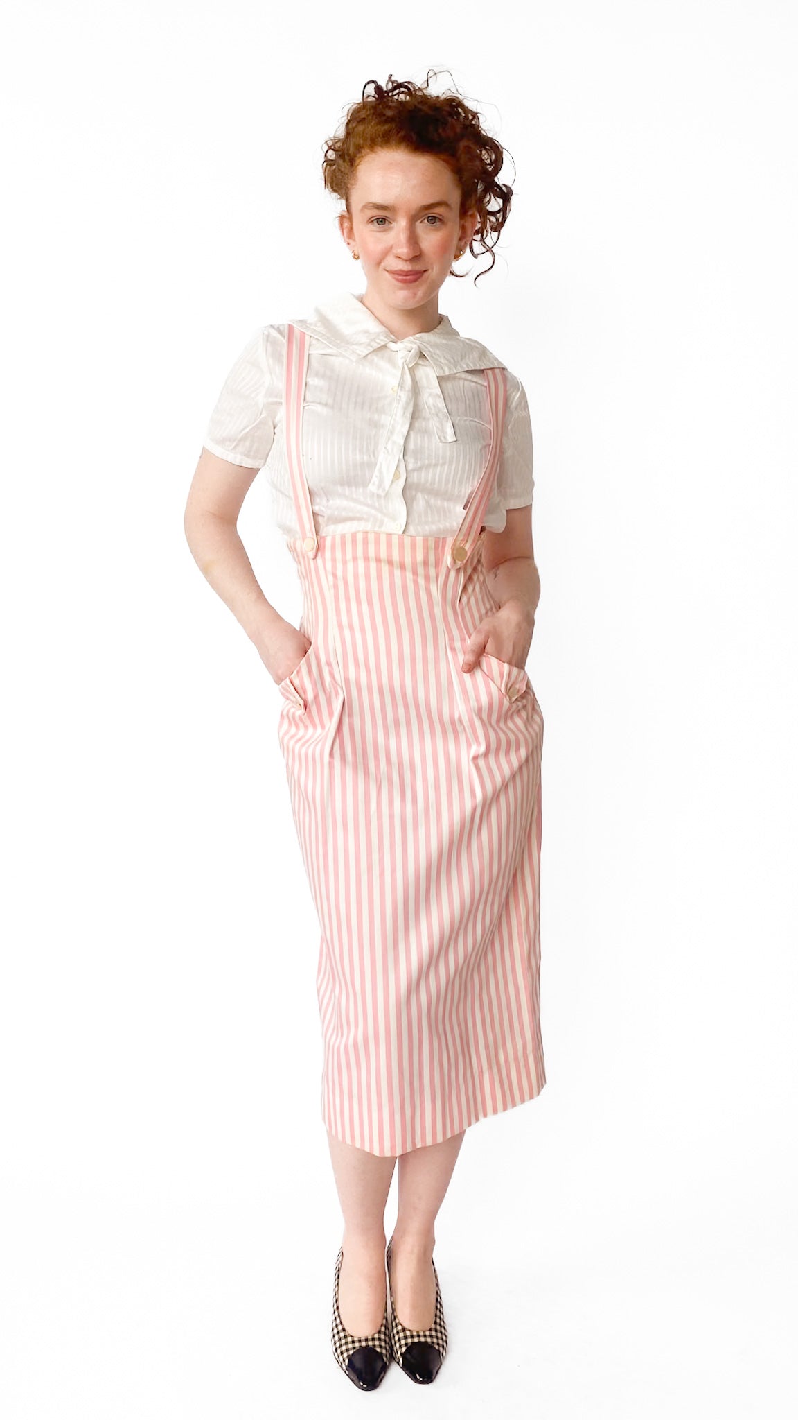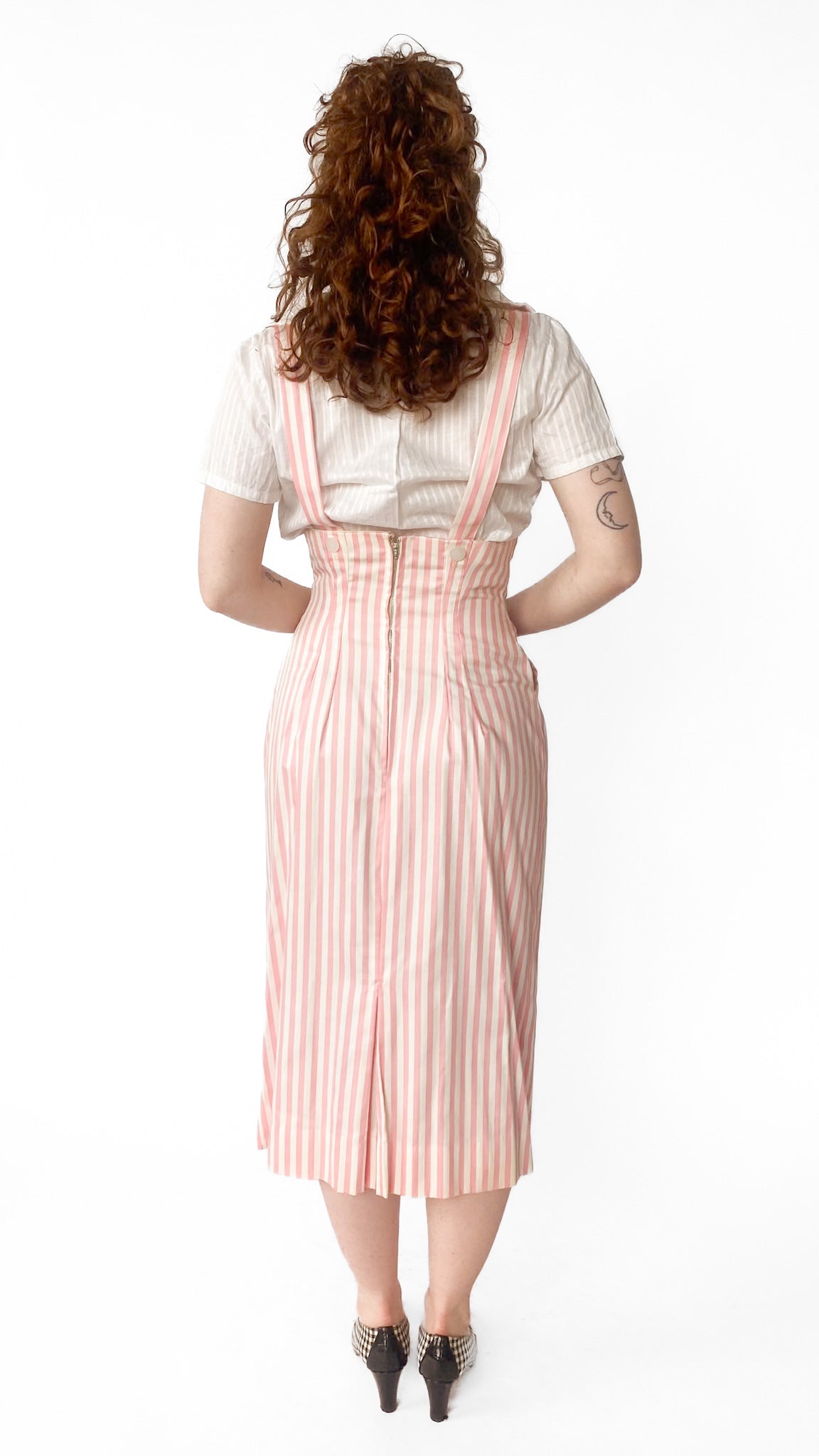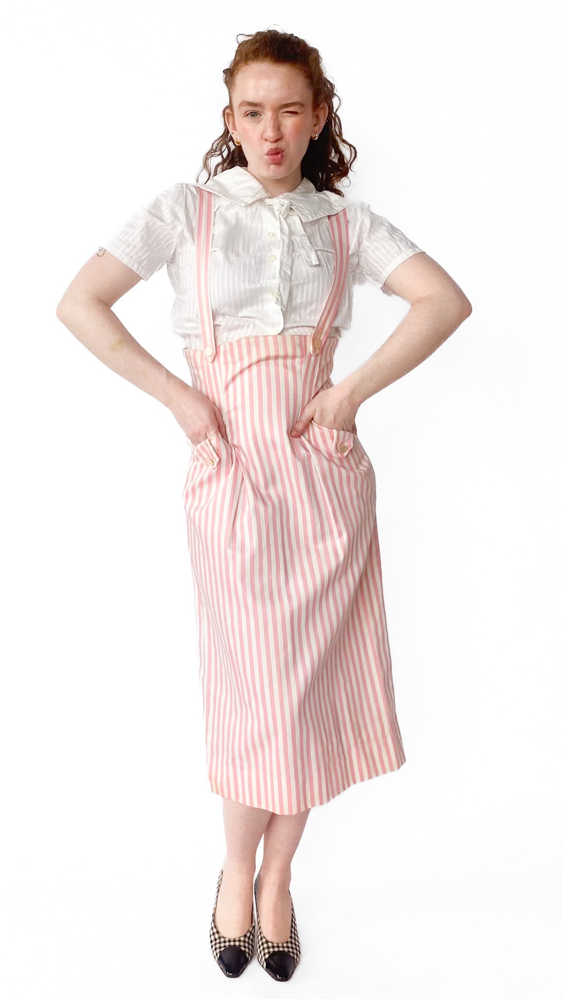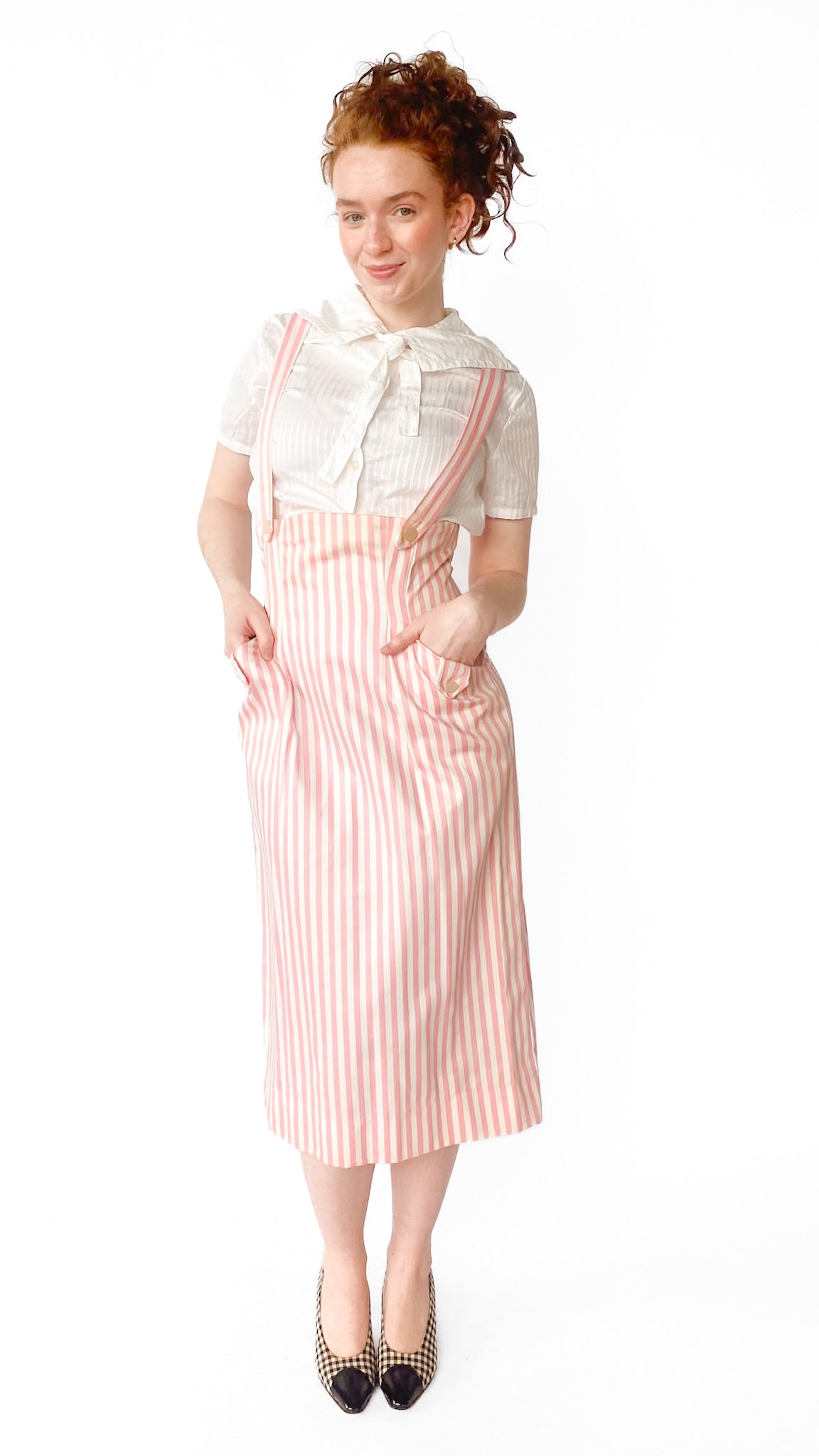 Description: High-waisted pink and white vertical striped skirt with attached straps that go over shoulders. Skirt has two front pockets with white buttons. Top of skirt goes under bust. Back has zipper.