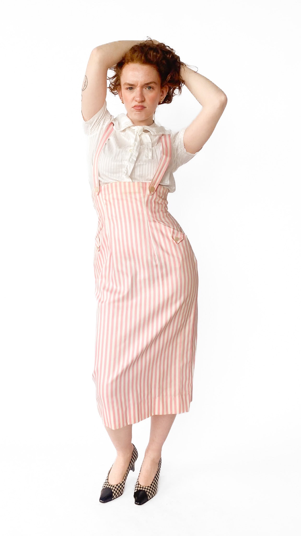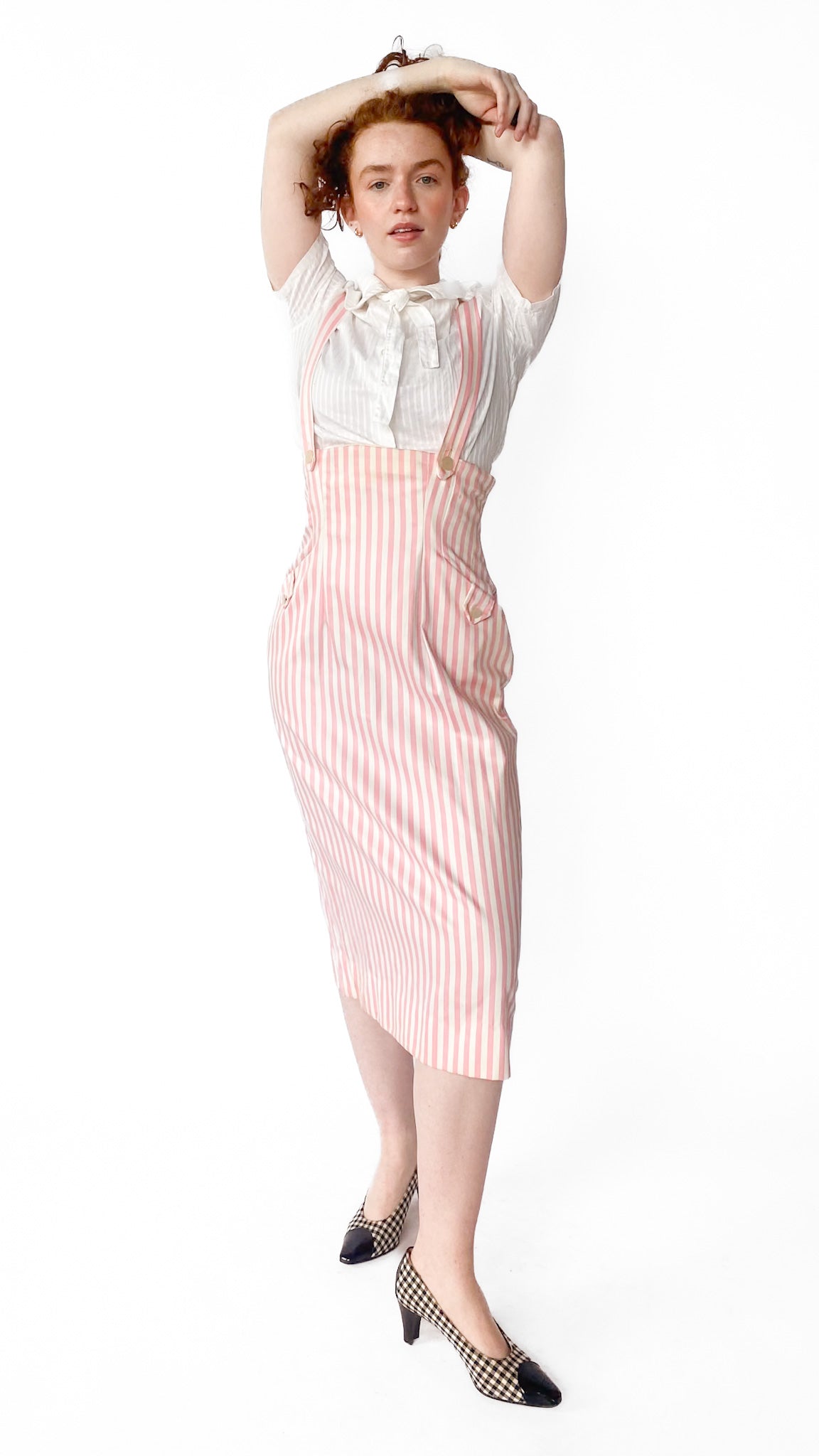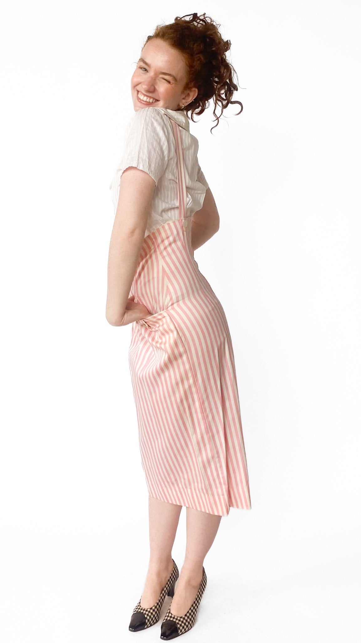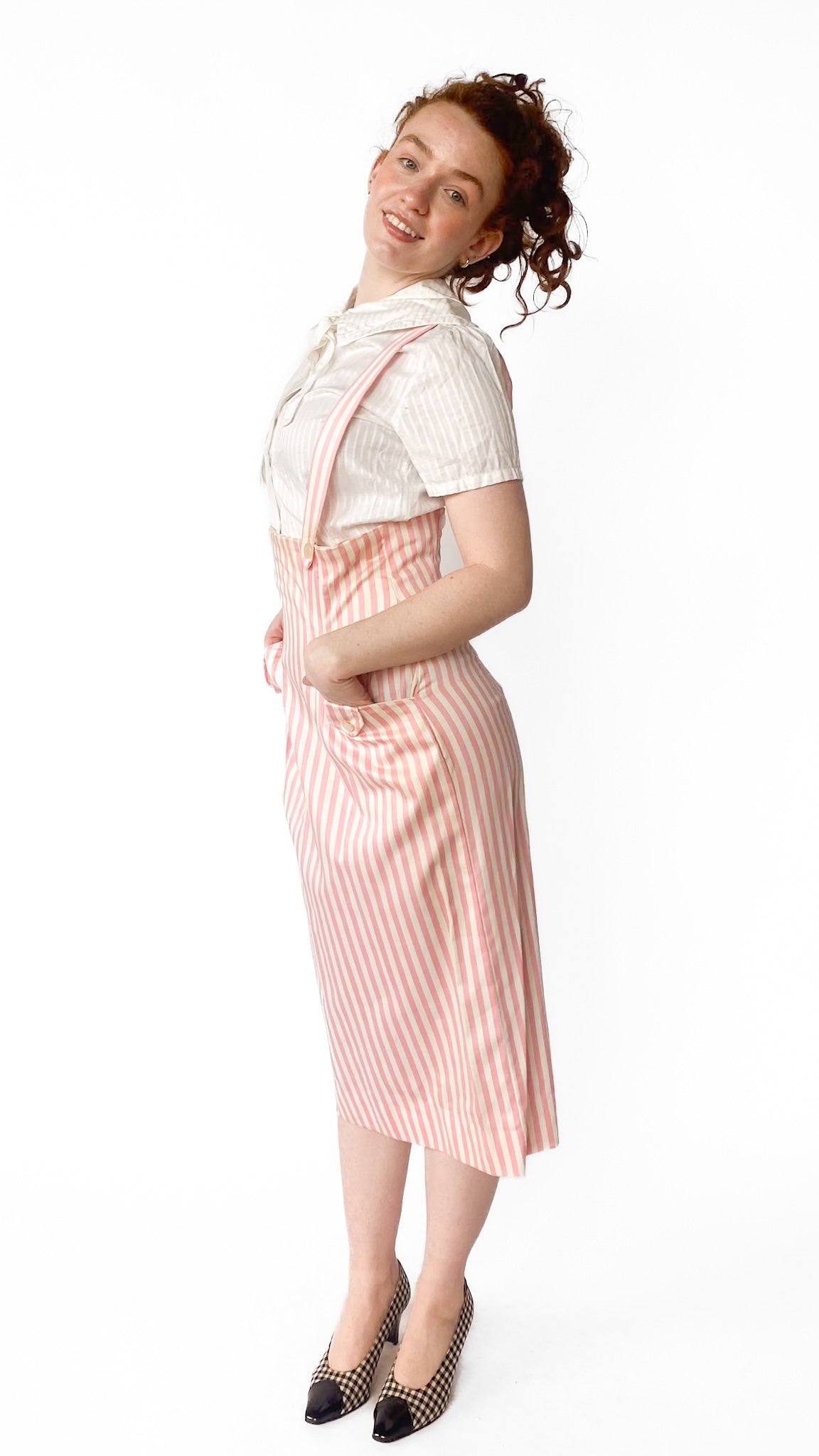 Description: High-waisted pink and white vertical striped skirt with attached straps that go over shoulders. Skirt has two front pockets with white buttons. Top of skirt goes under bust. Back has zipper.