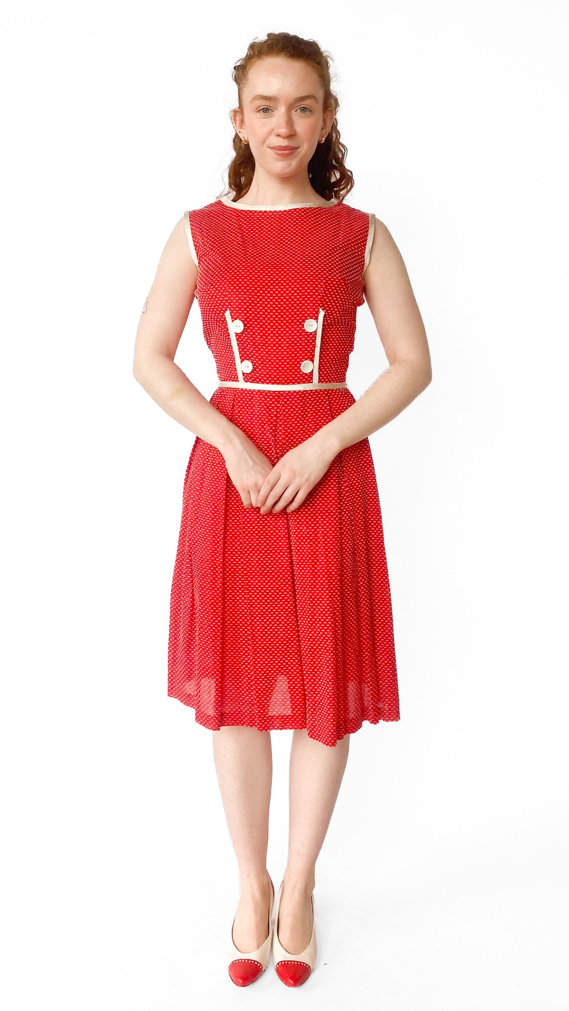 Description: Sleeveless red dress with white polka dots and white trim details. Dress has zipper in back. Front of dress has four buttons in a square shape above the waistline. Skirt has pleated detail.