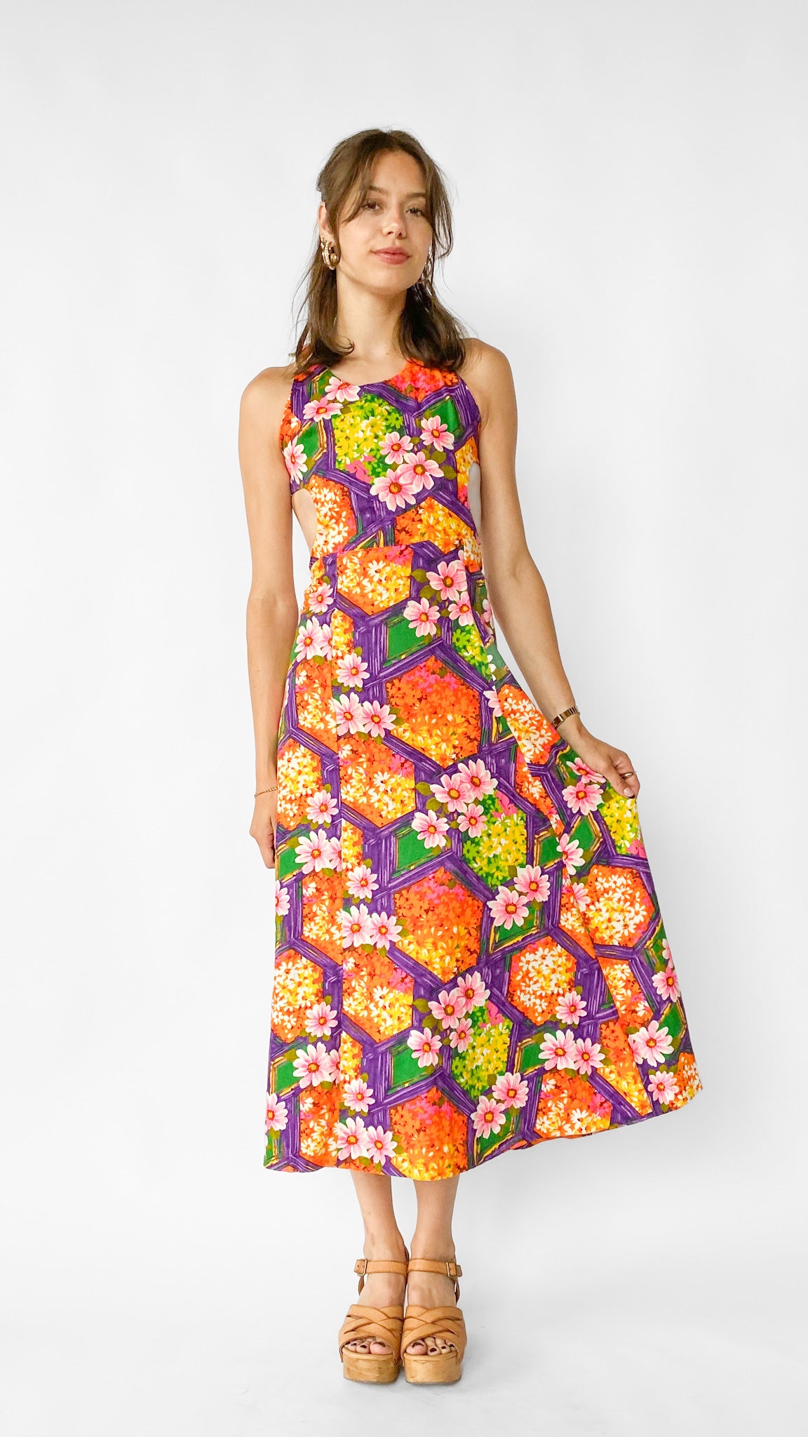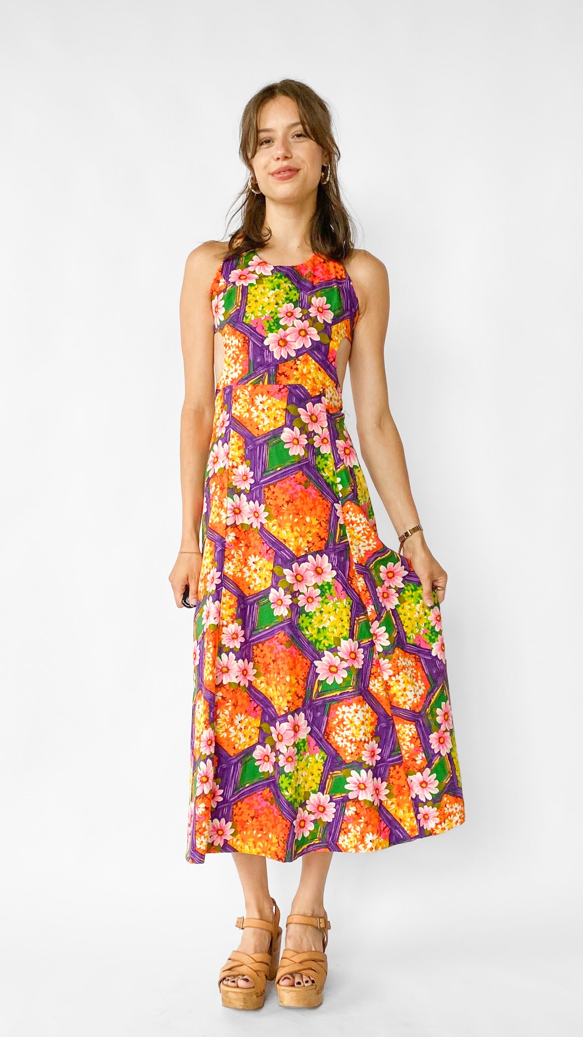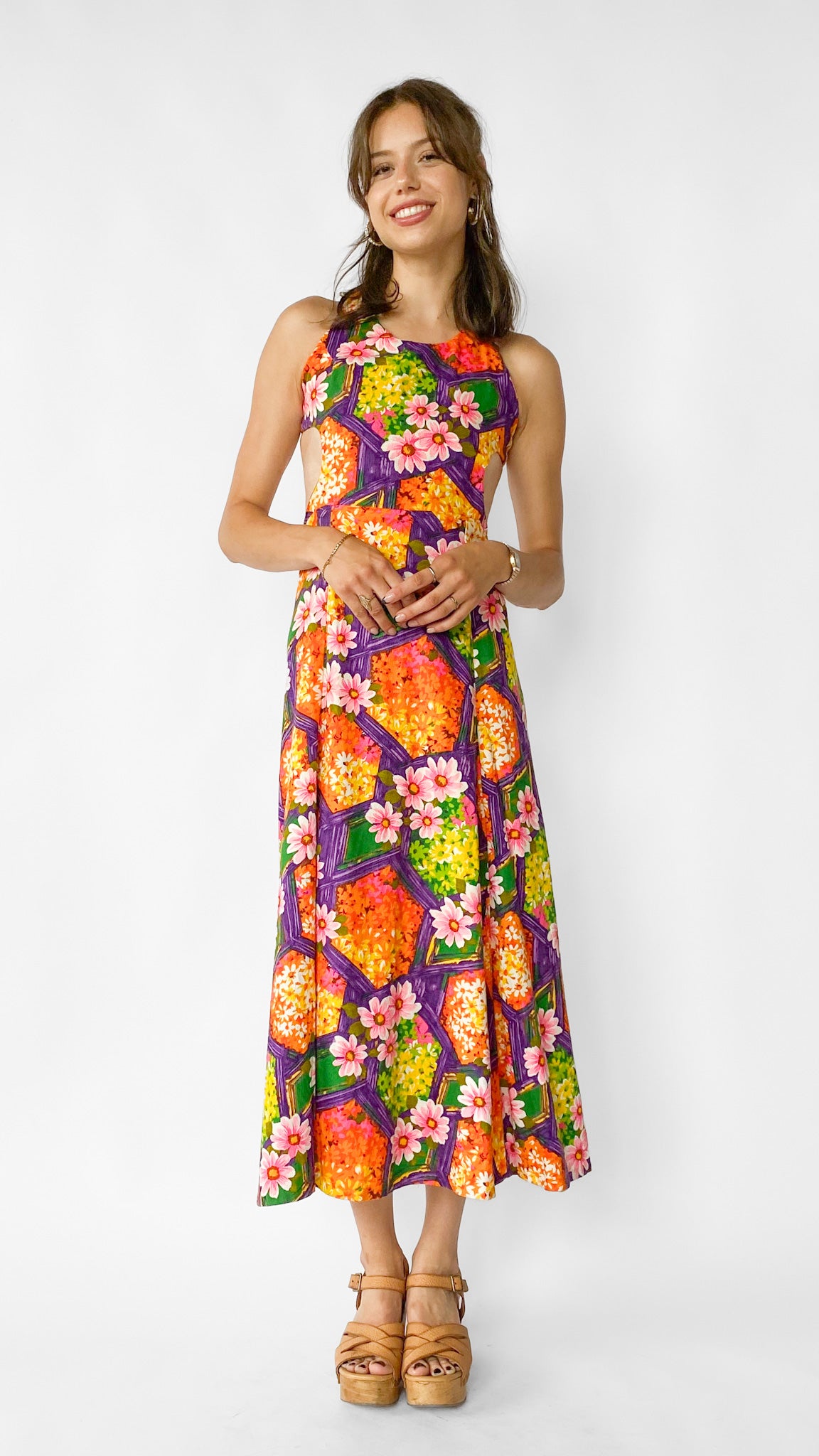 1960s Tropical Bright Purple & Orange Maxi Dress, sz. XS
