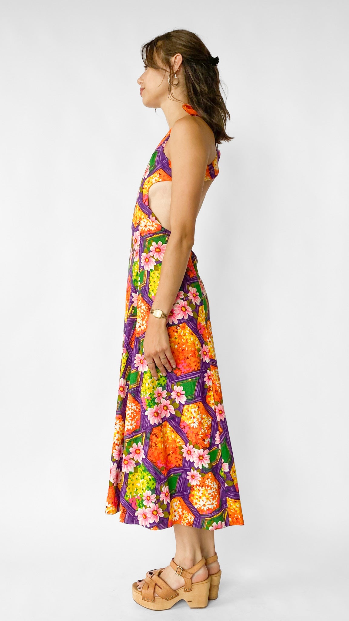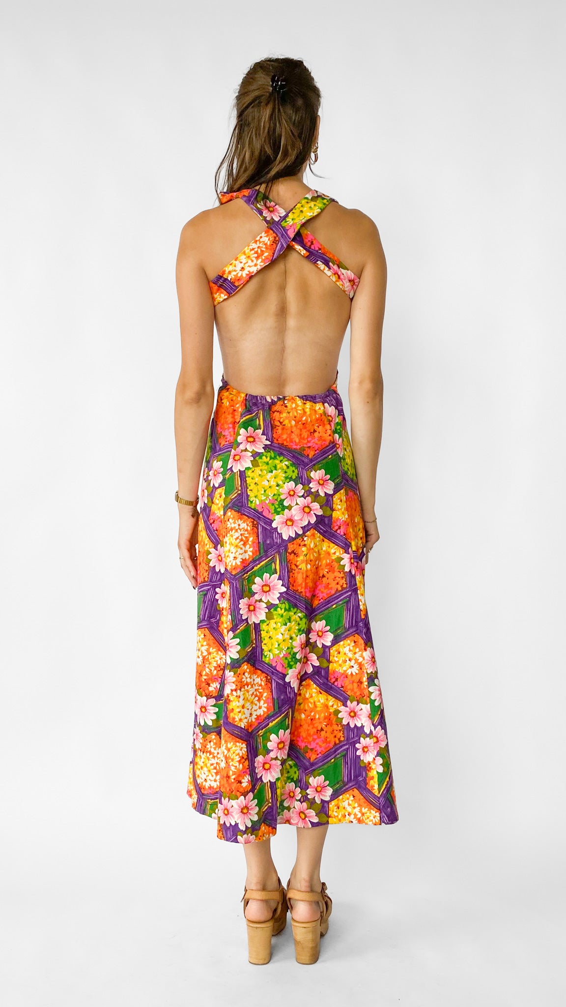 Description: Purple and orange floral printed maxi dress with open back. Straps have snap closure and cross over in back. Waist has elastic along back.