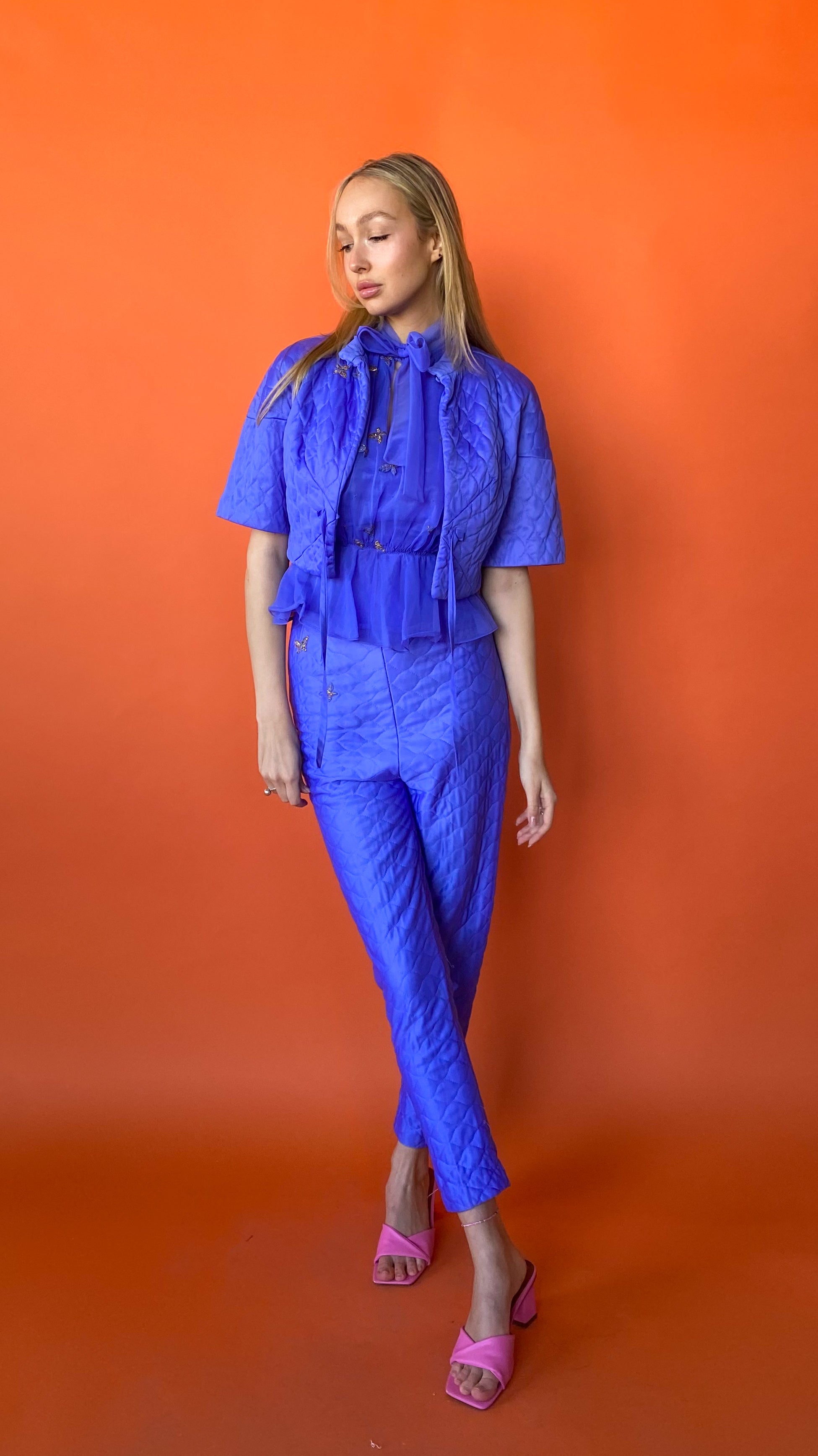 1960s Rare Periwinkle Quilted Pants Set, sz. S