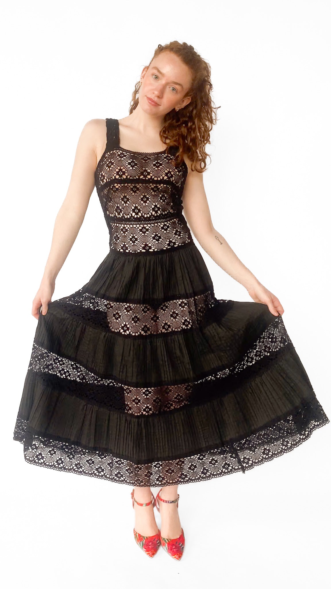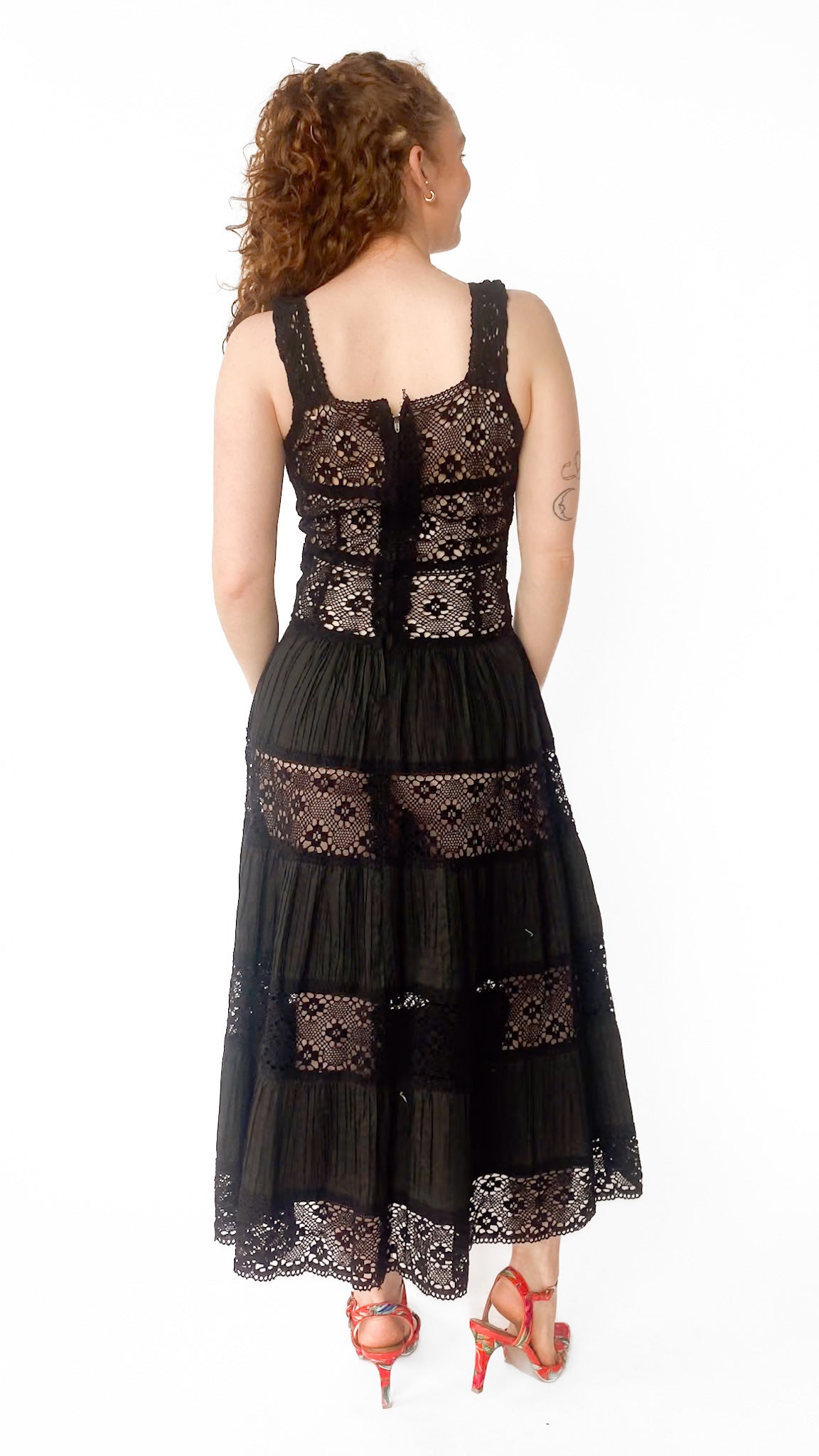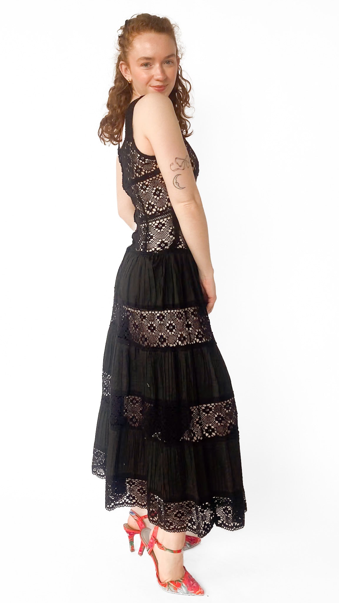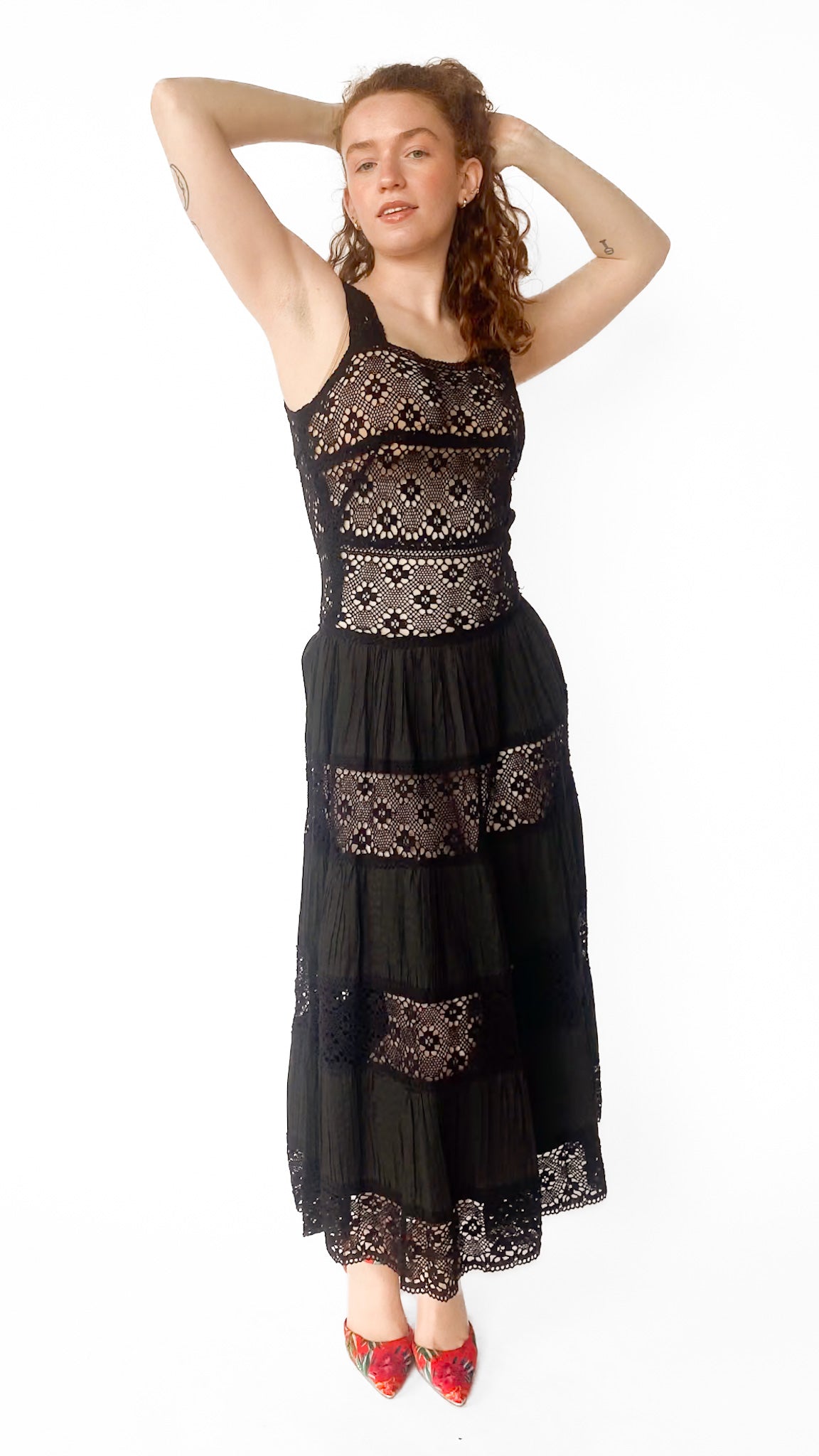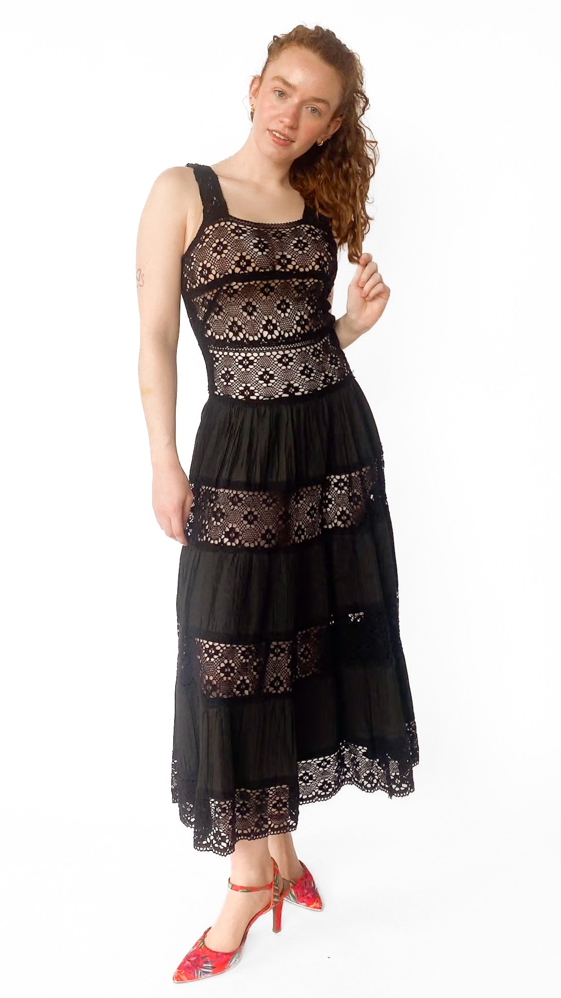 Description: Black maxi drop waist dress with crochet bodice and pleated tiered skirt. Has zipper closure down center back. Unlined.