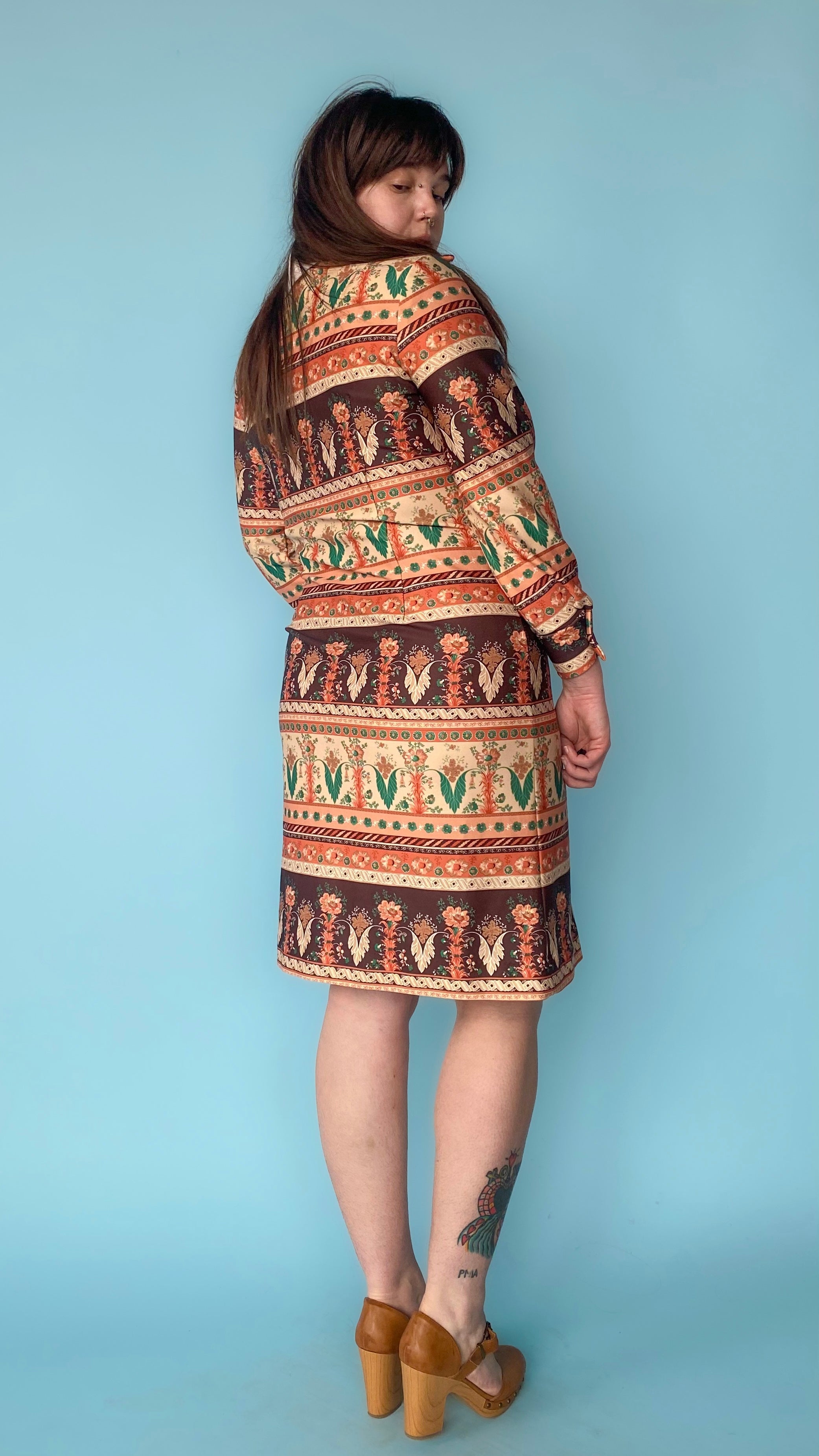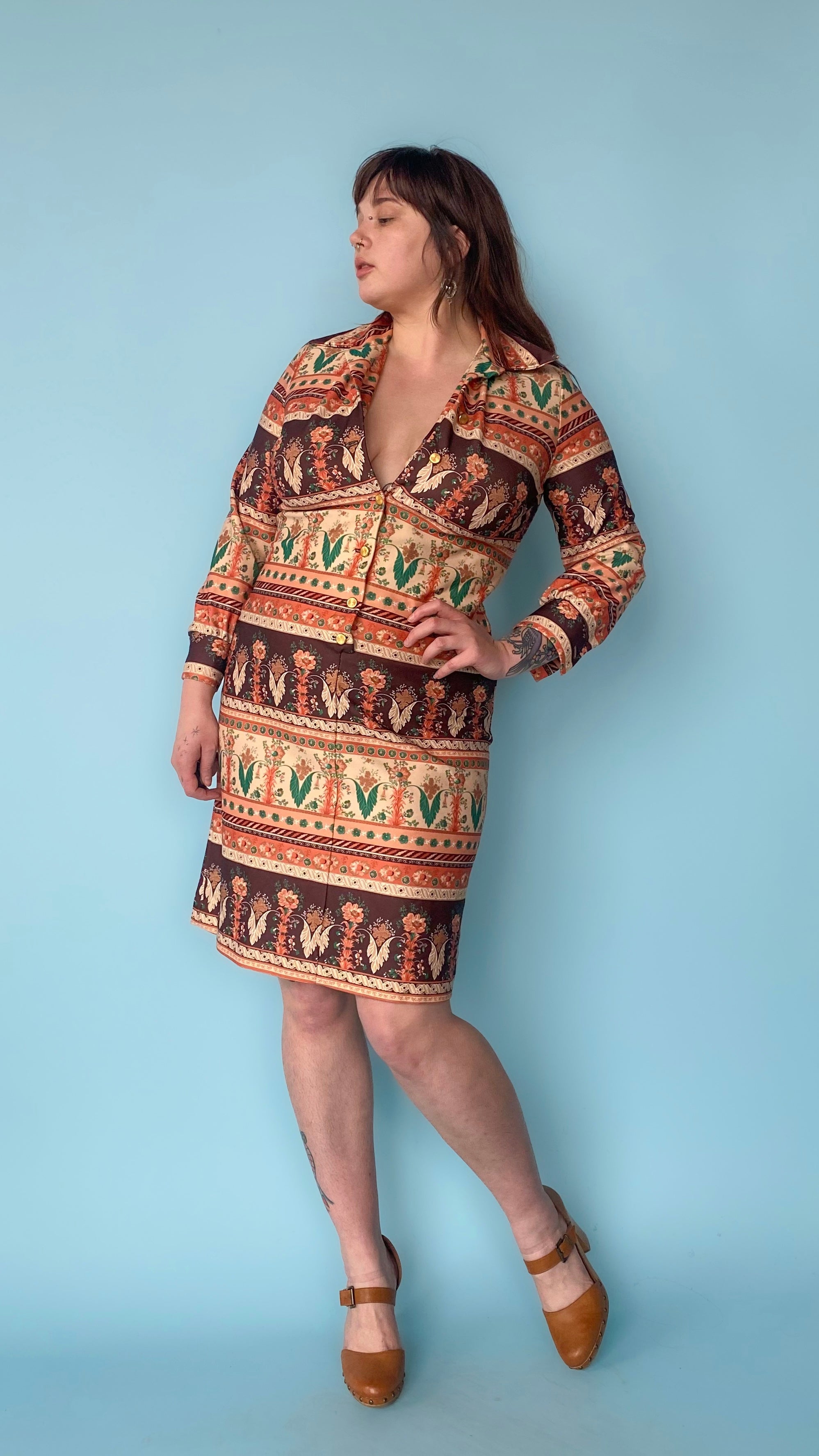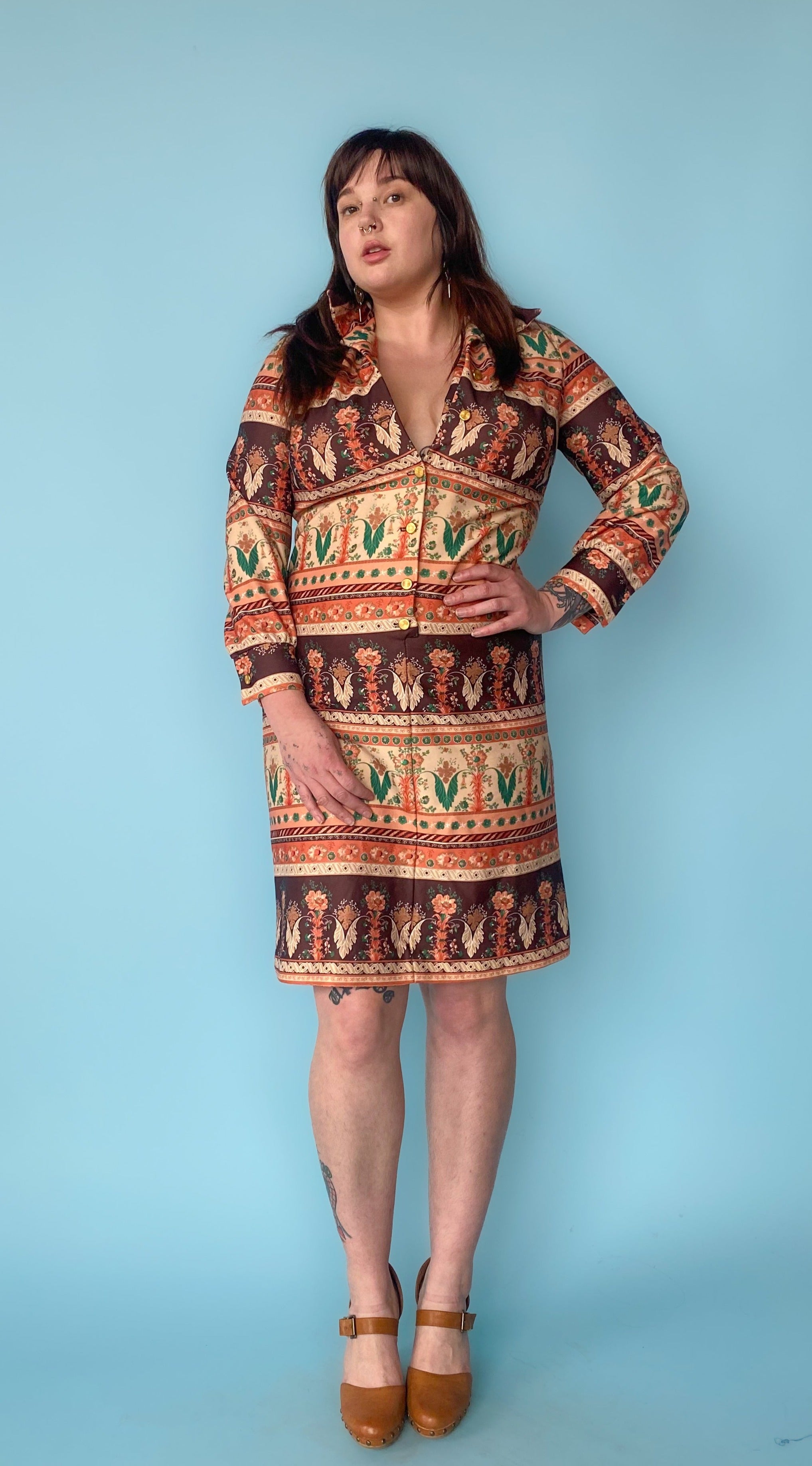 A mid-length dress featuring an allover floral print in oranges, greens, and browns. Garment is a pullover style with gold buttons and a collar.