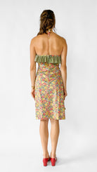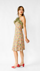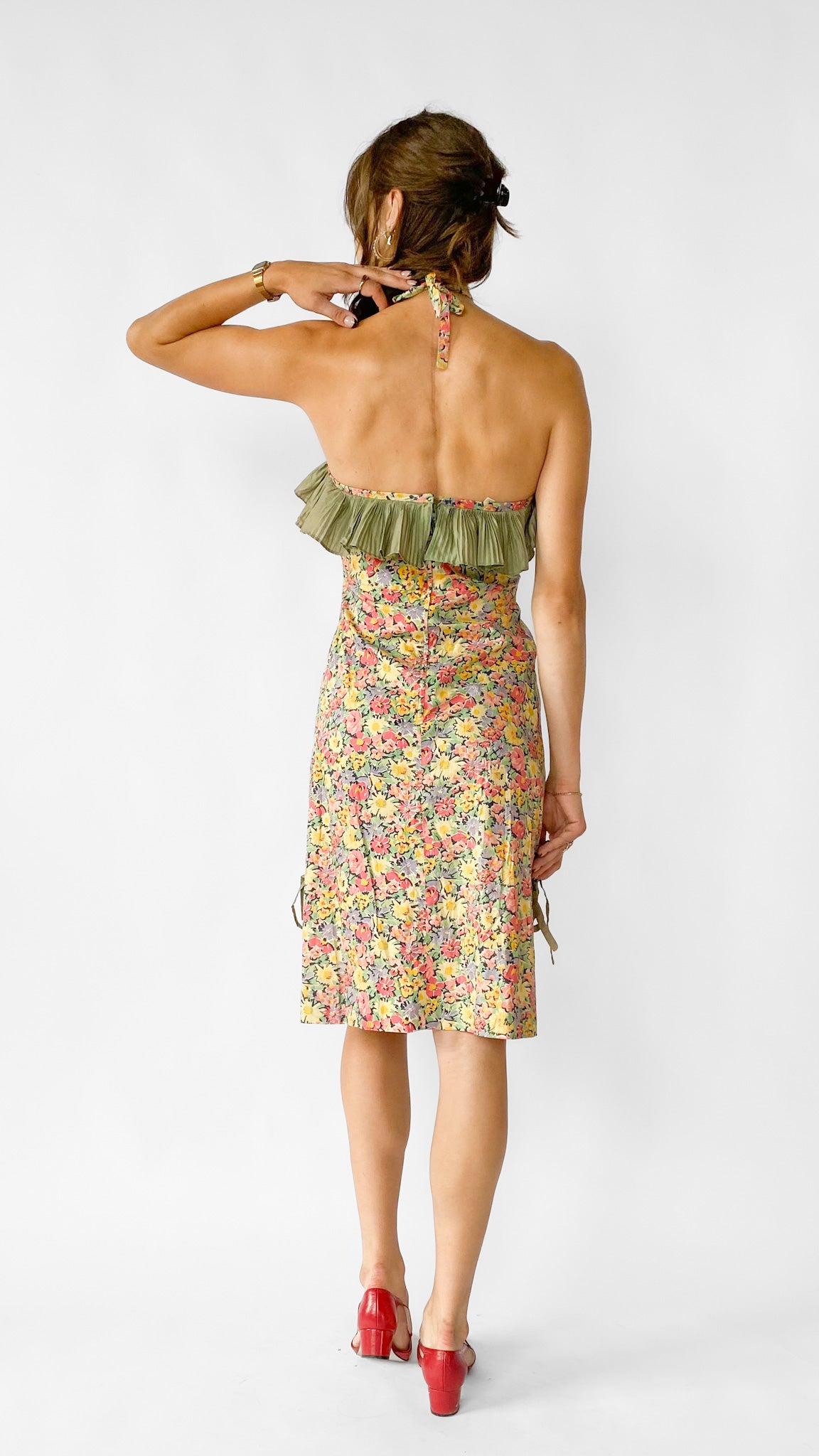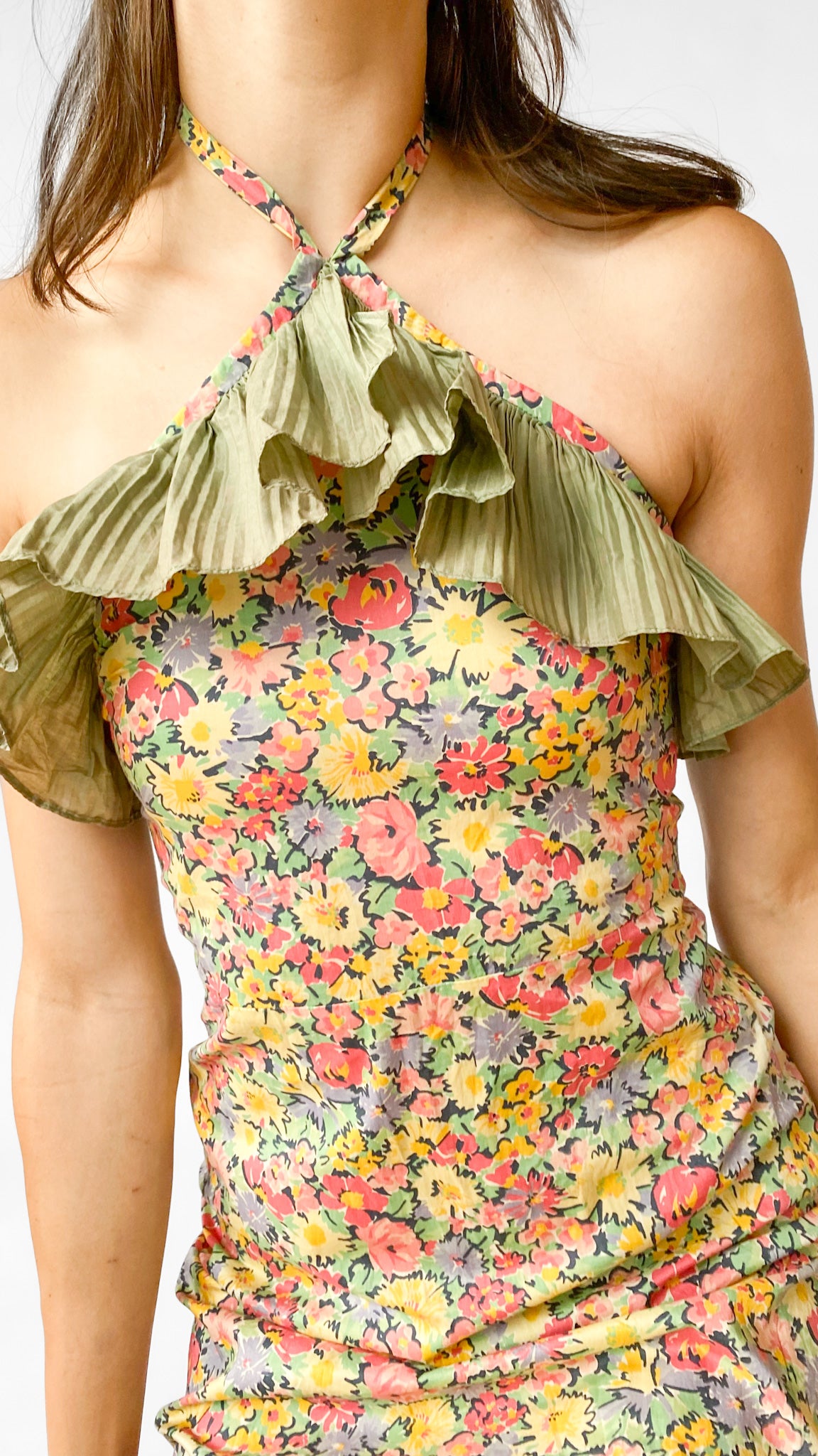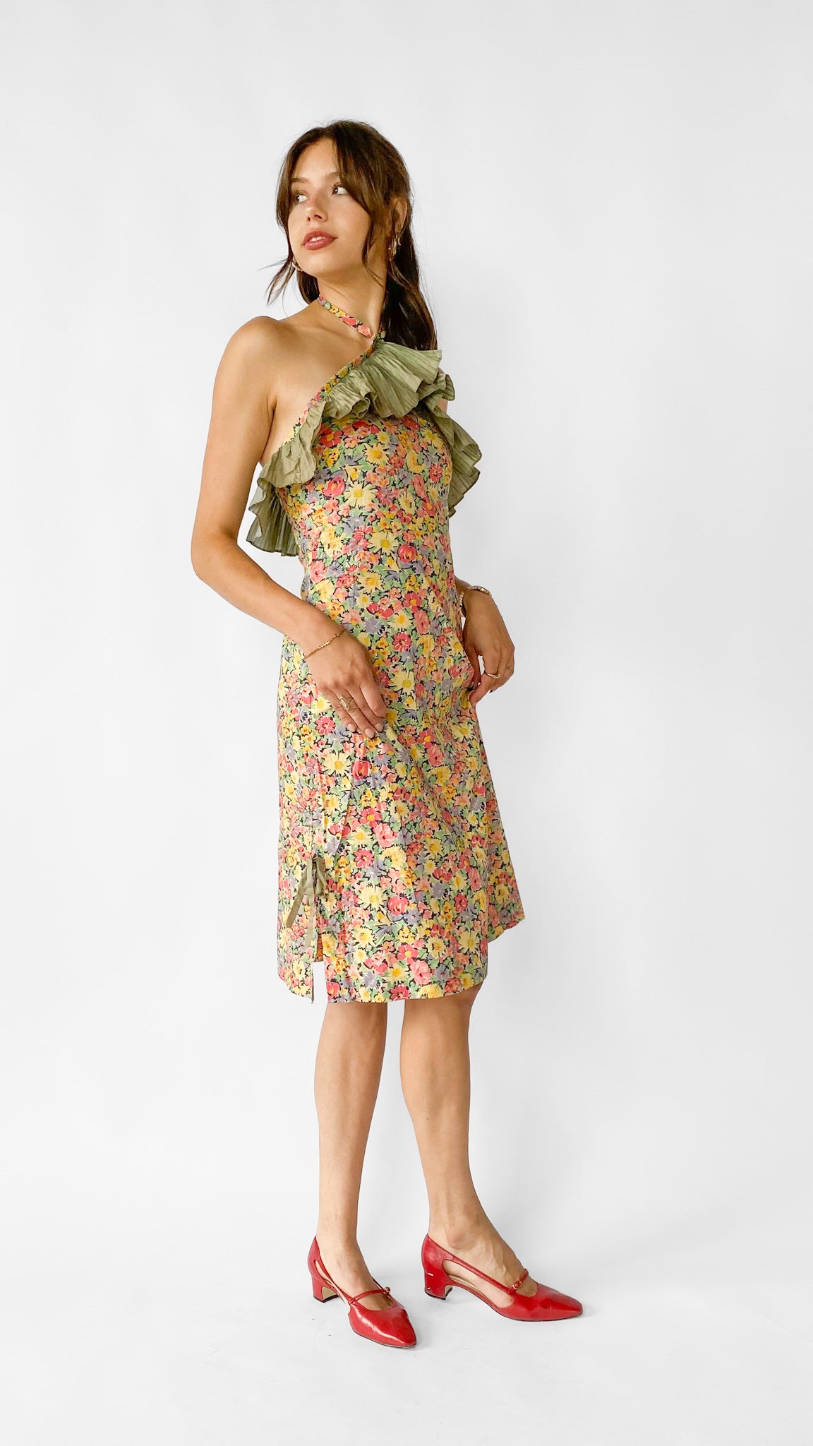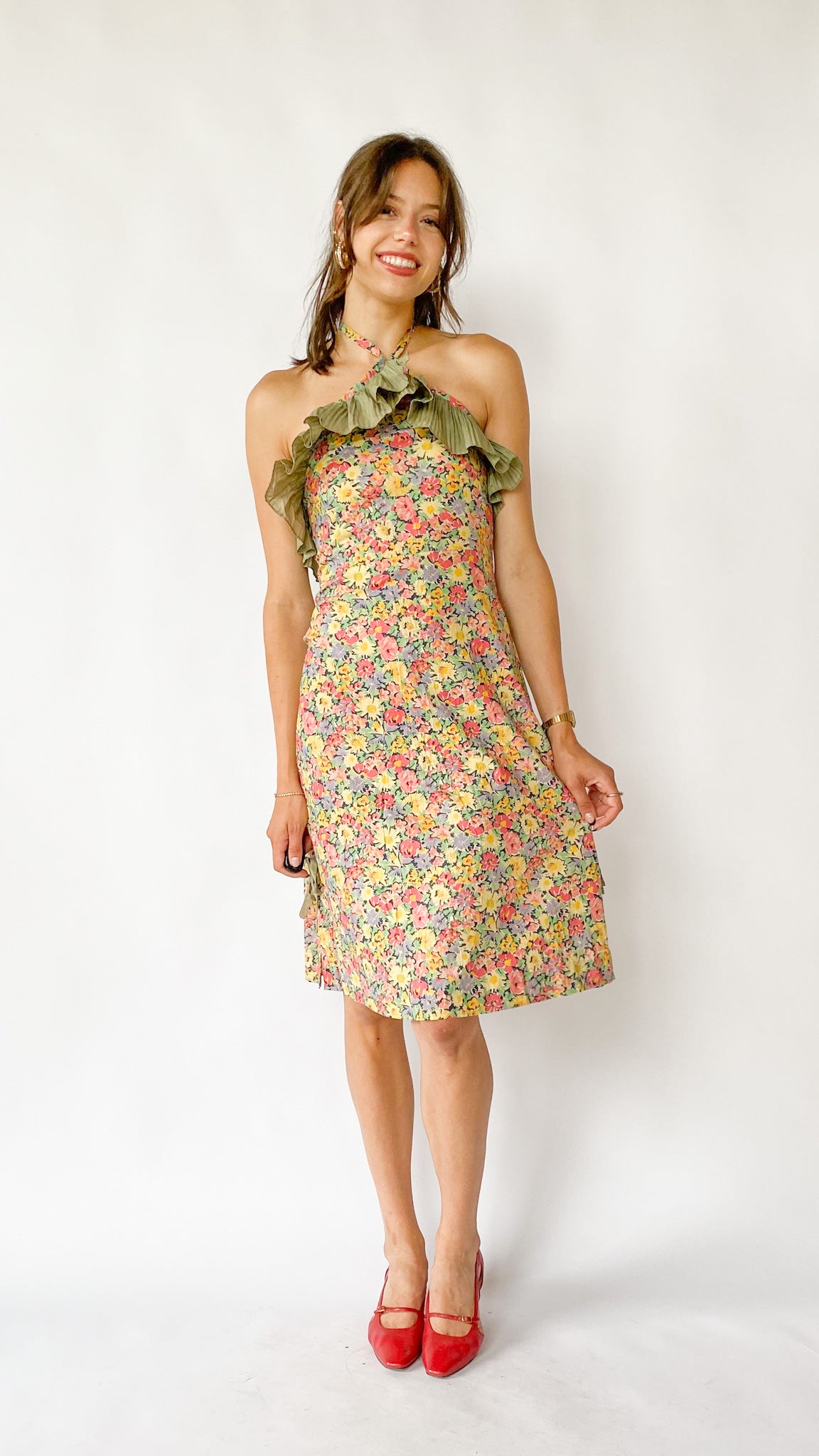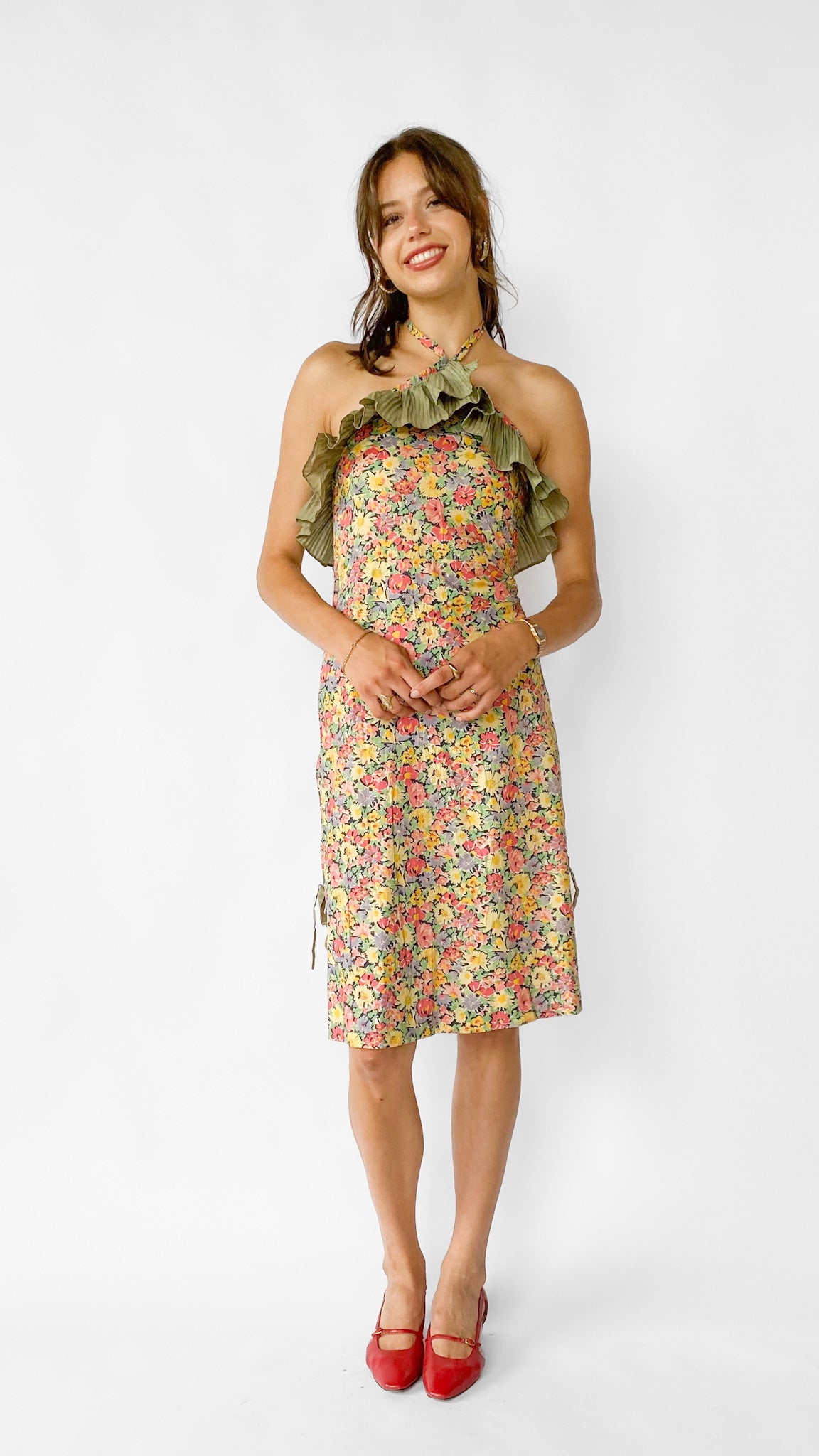 Description: Floral shift dress with green ruffle around neckline & halter tie. Has zipper closure down center back. Hem has slits along side seams, with bow detail. Unlined.