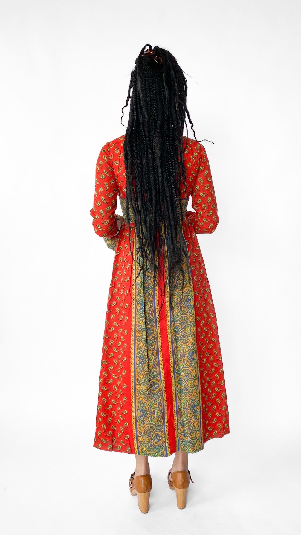 Long sleeve orange maxi dress with blue, green and yellow colored paisley pattern. Dress has V-shaped neckline. Button detailing on the ends of the sleeves.