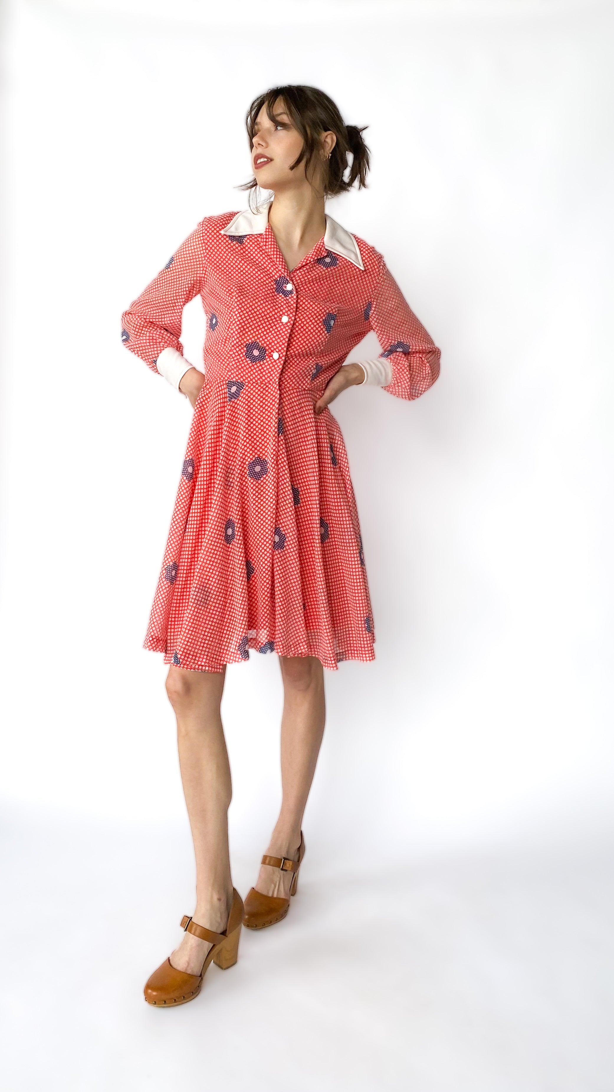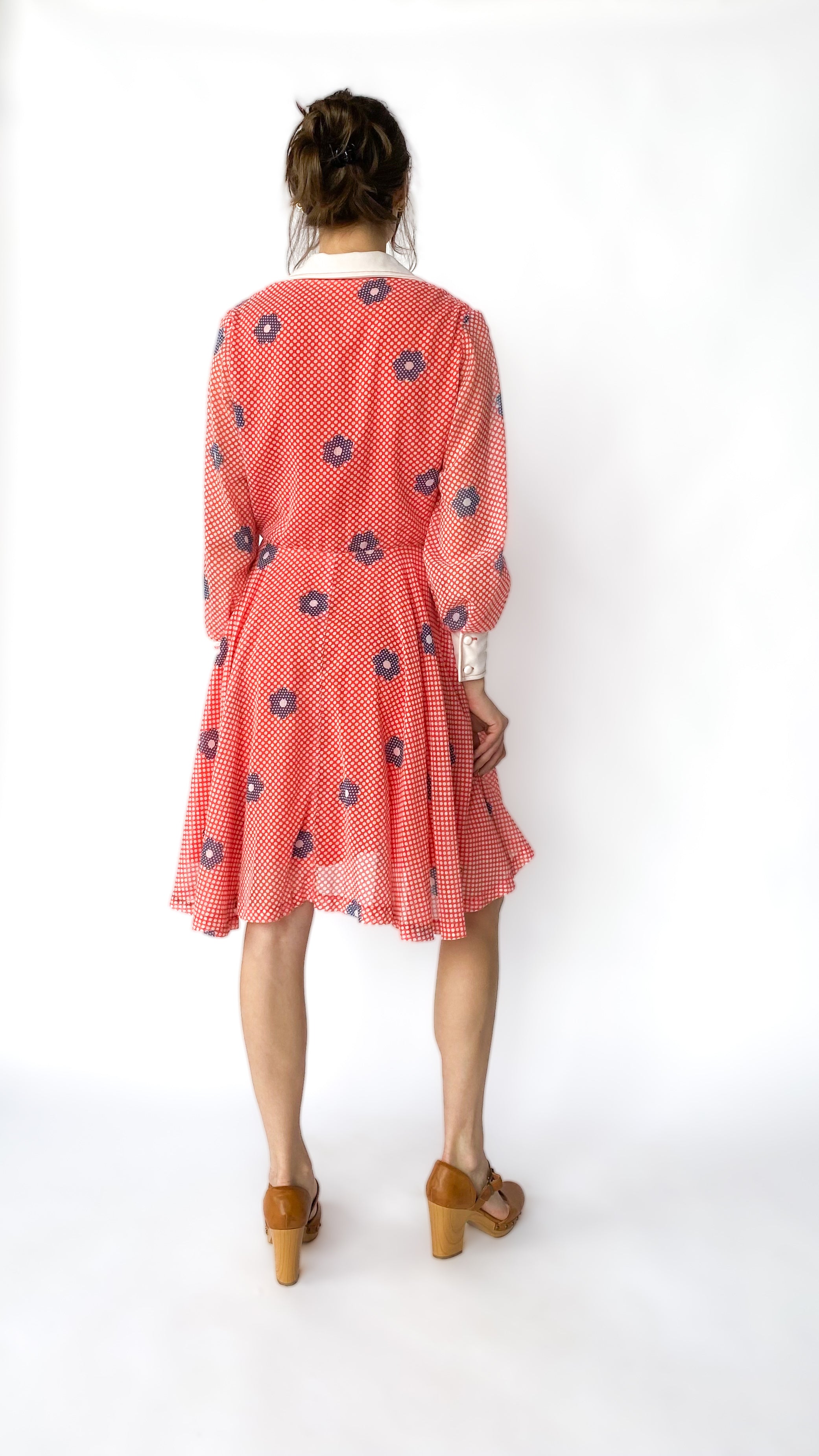 Red polka dot floral dress; has white collar & cuffs, sleeves are slightly sheer. Fully lined, with white mod buttons down center front to waistband; has hook & eye closure at waist.