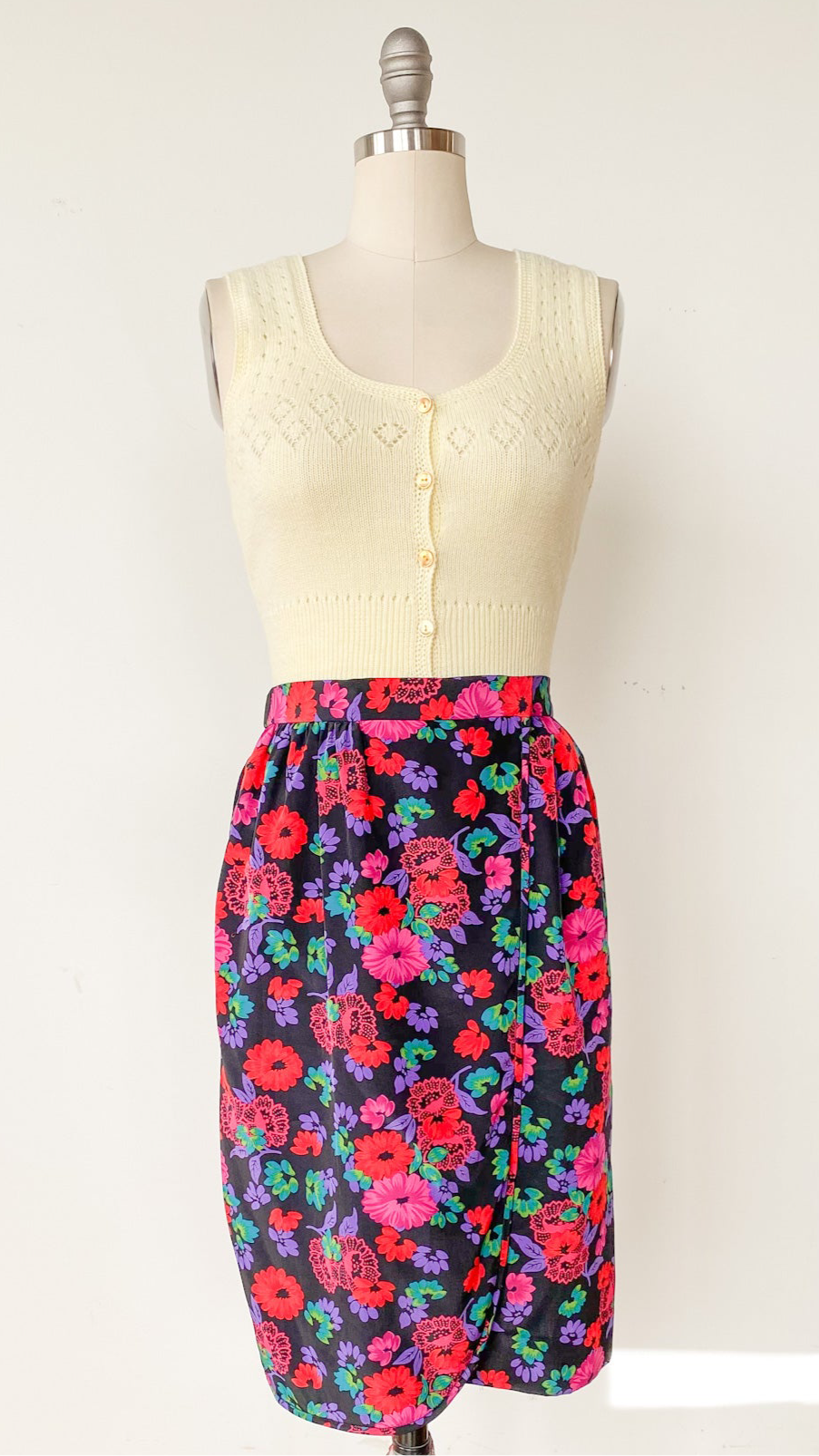 1980s Black Floral Faux Wrap Skirt, sz. S