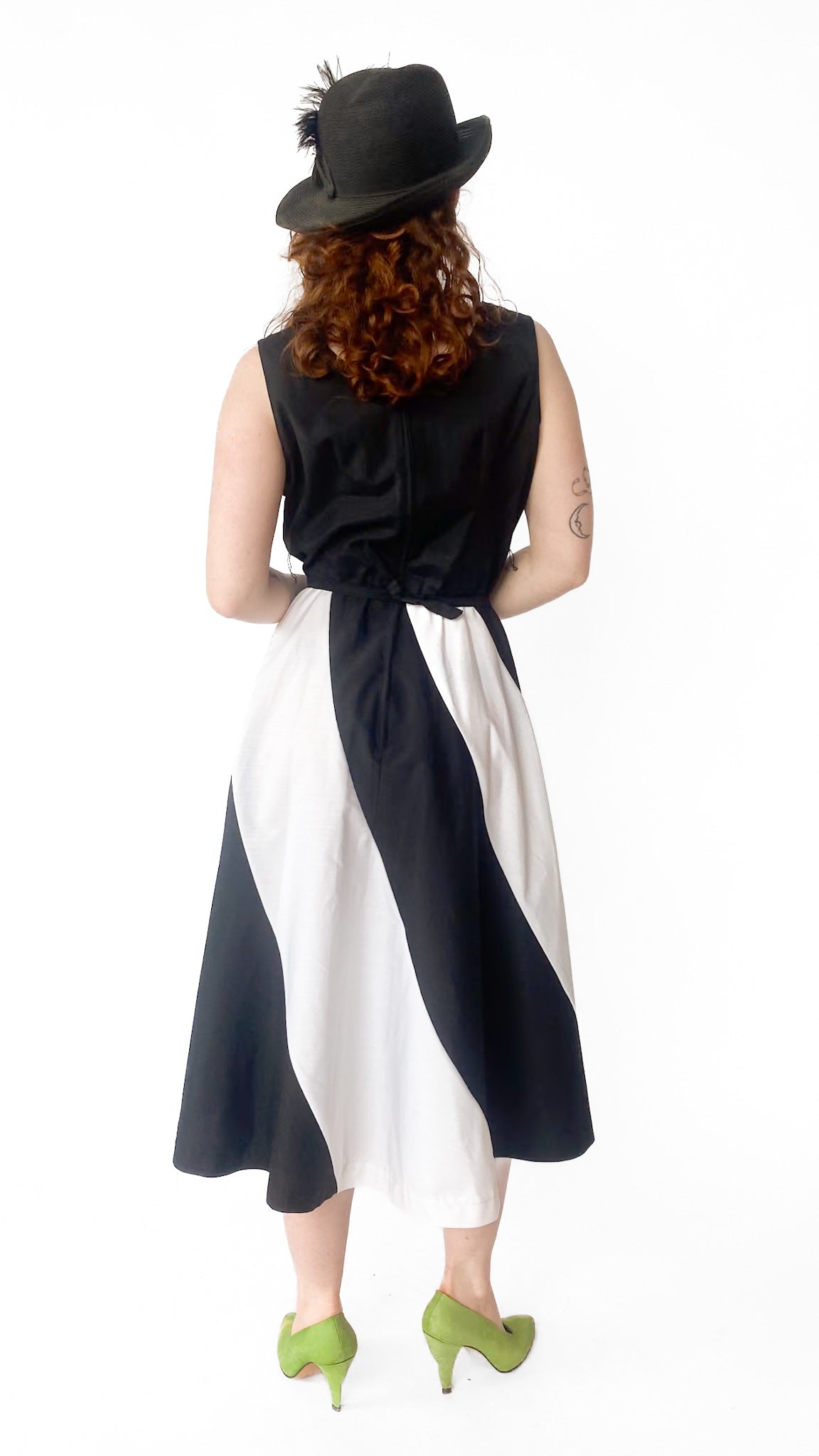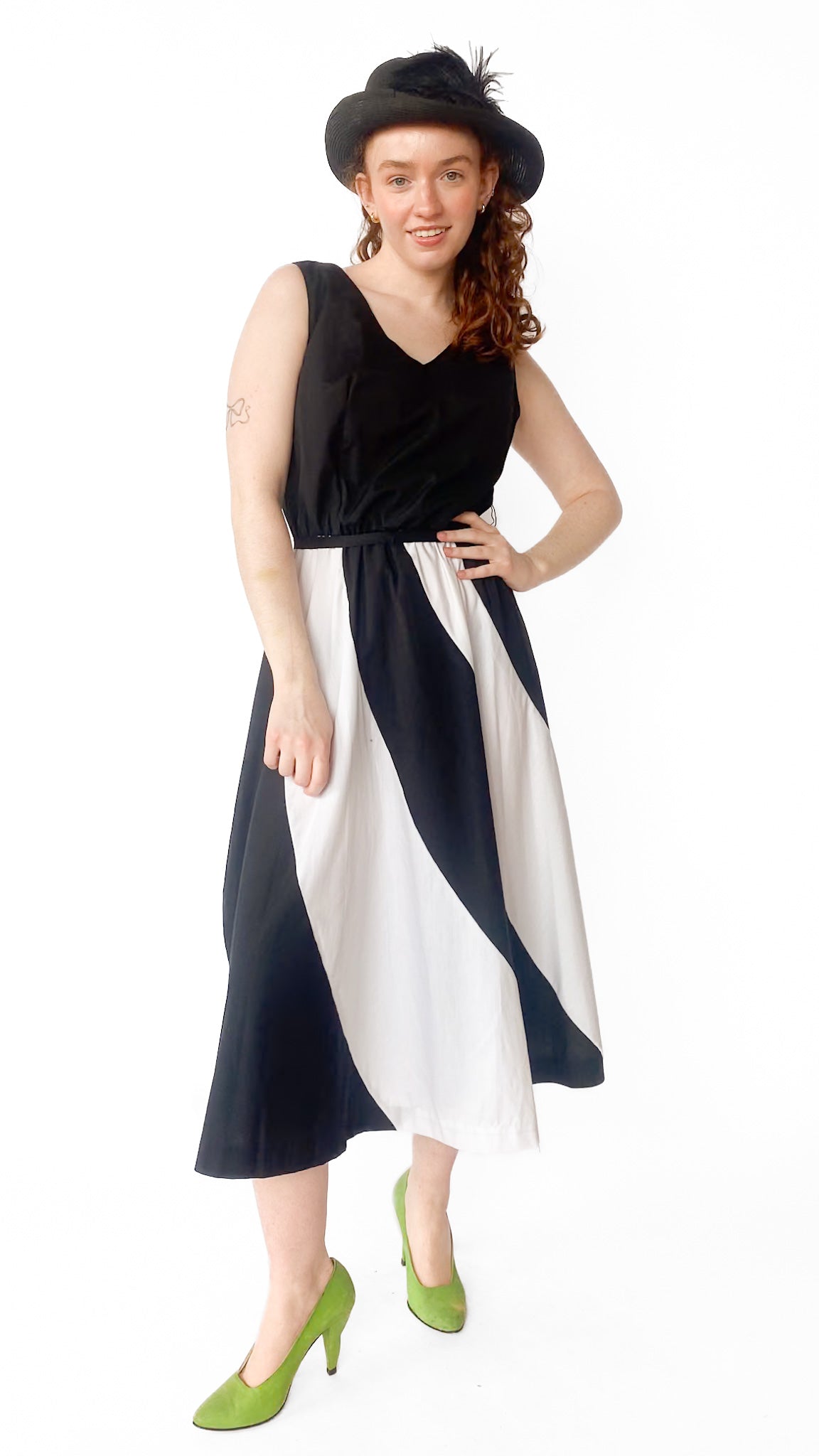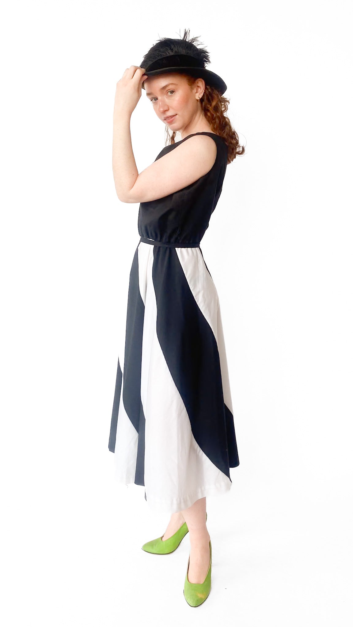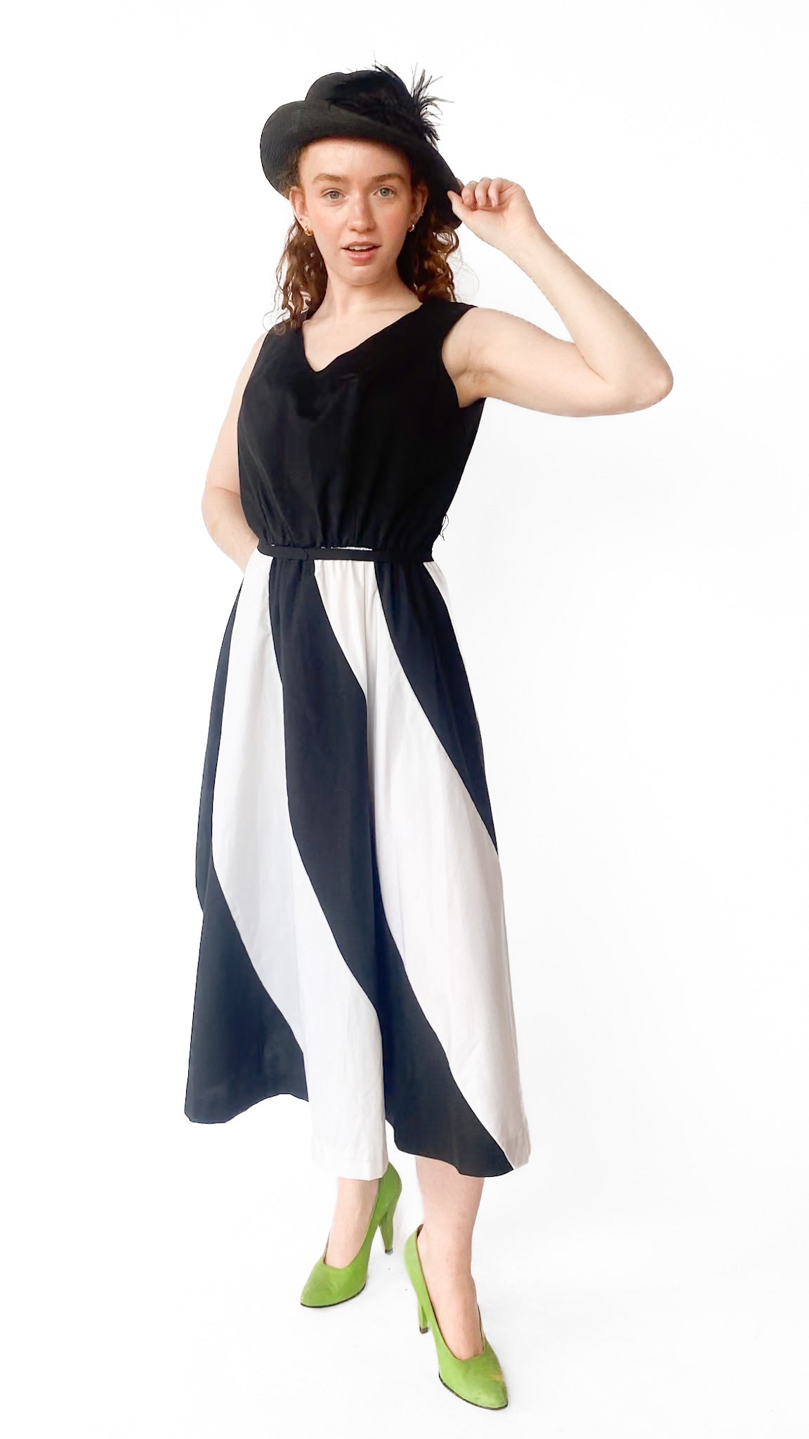 Description: 1950s style black and white sleeveless dress. Top of dress is completely black, skirt of dress is a diagonal striped black and white pattern. Waistband is elastic. Dress has zipper in back and comes with black fabric belt to tie around waist.