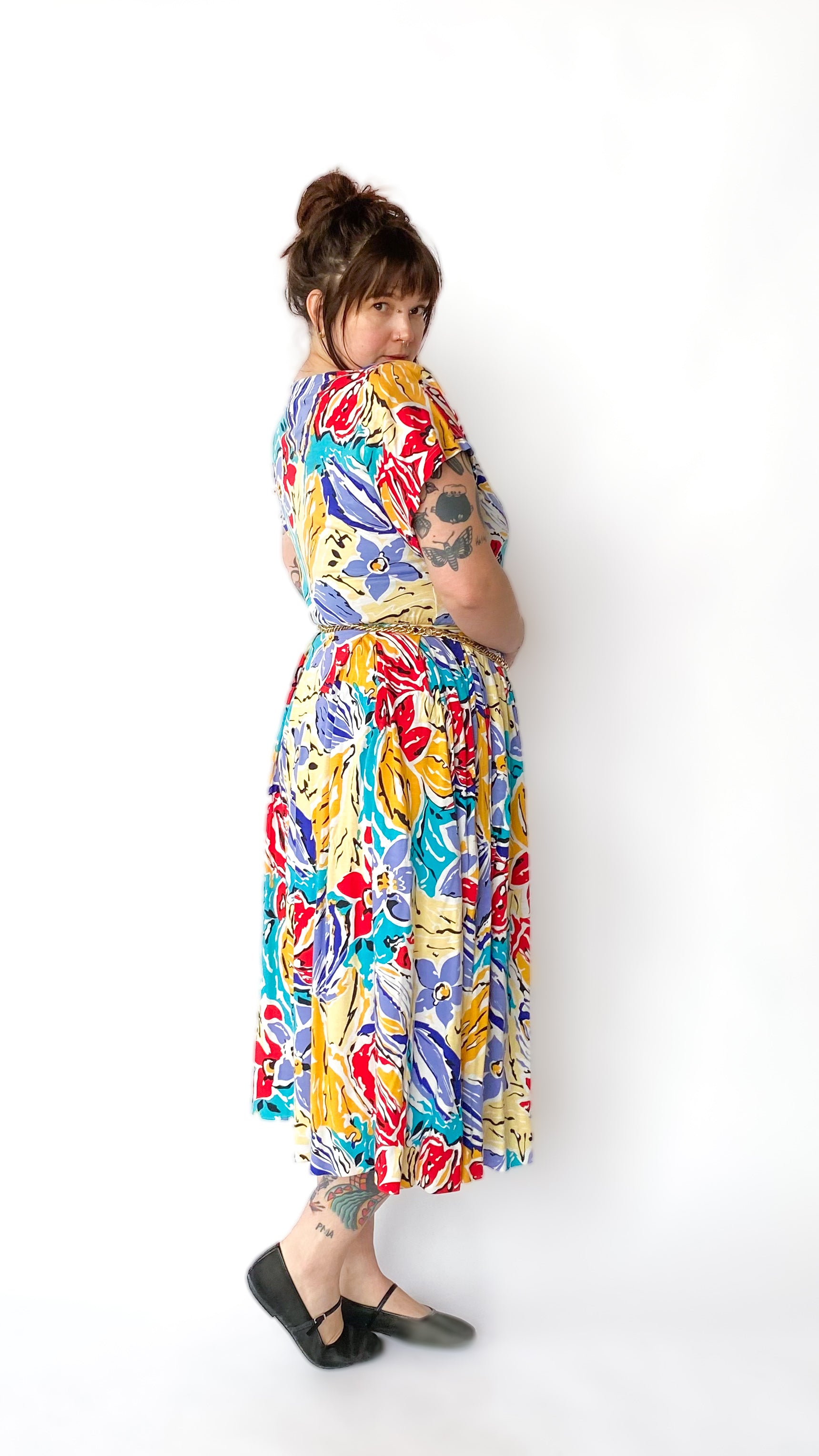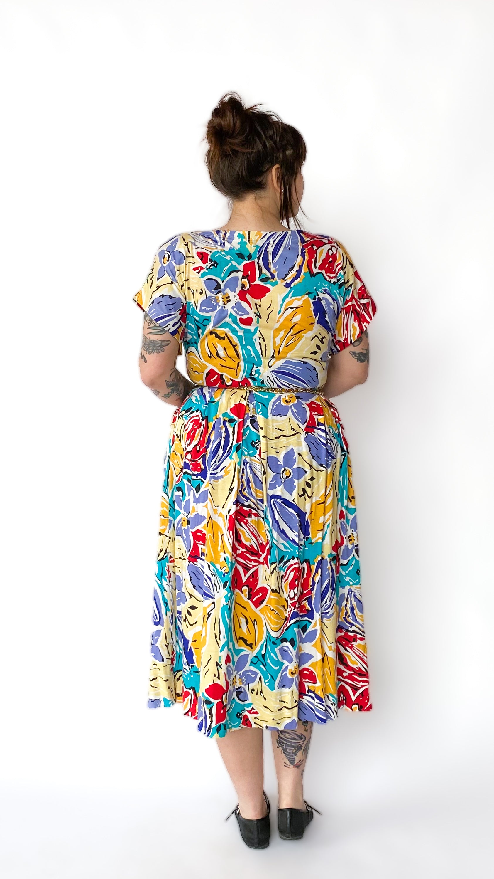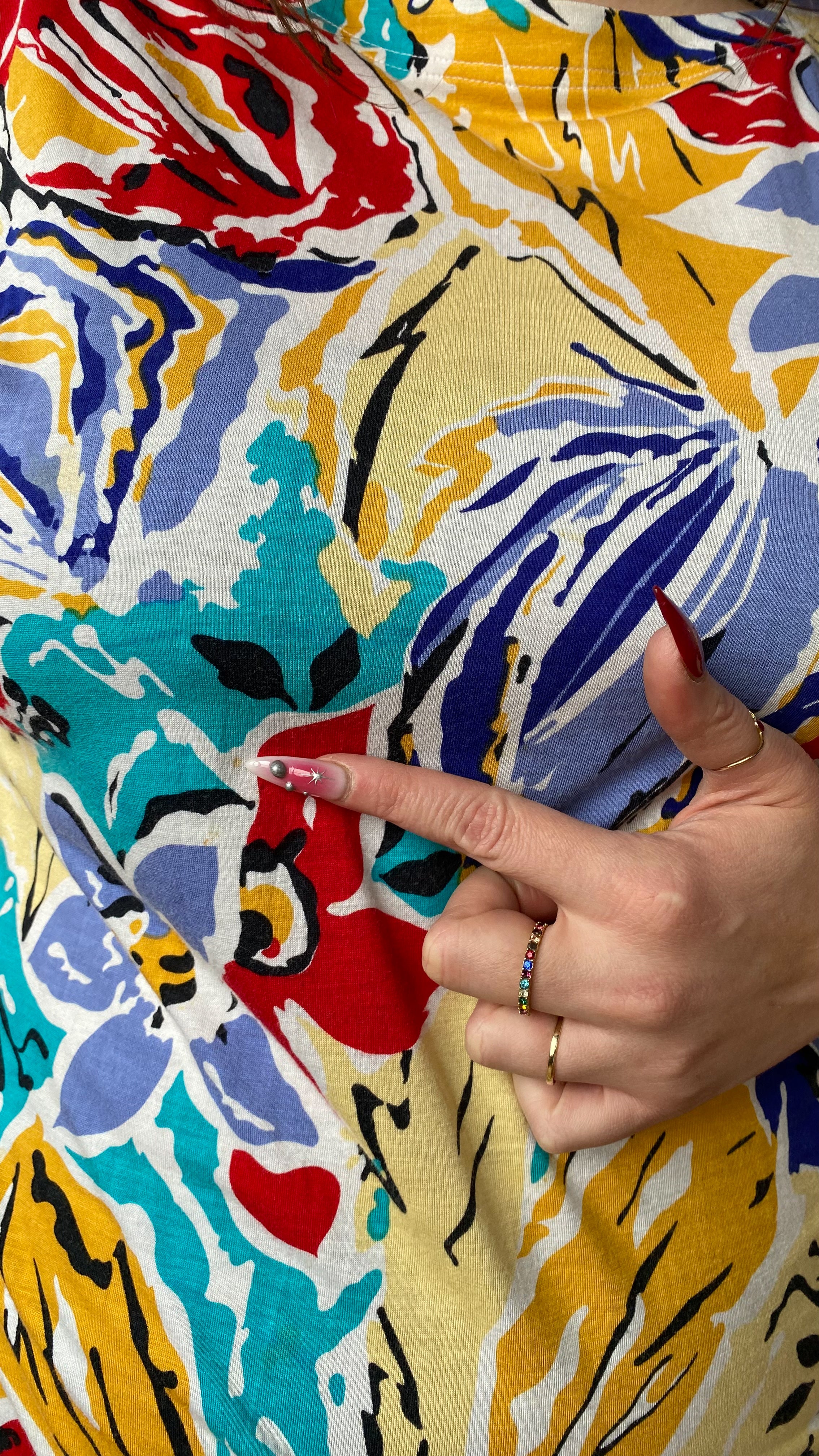T-shirt and skirt set in abstract floral motif. Shirt has shoulder pads and is unlined. Skirt has side hook closure, with pockets at hips.