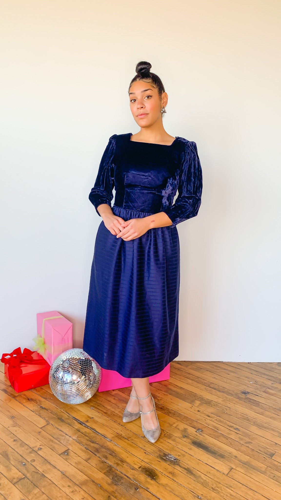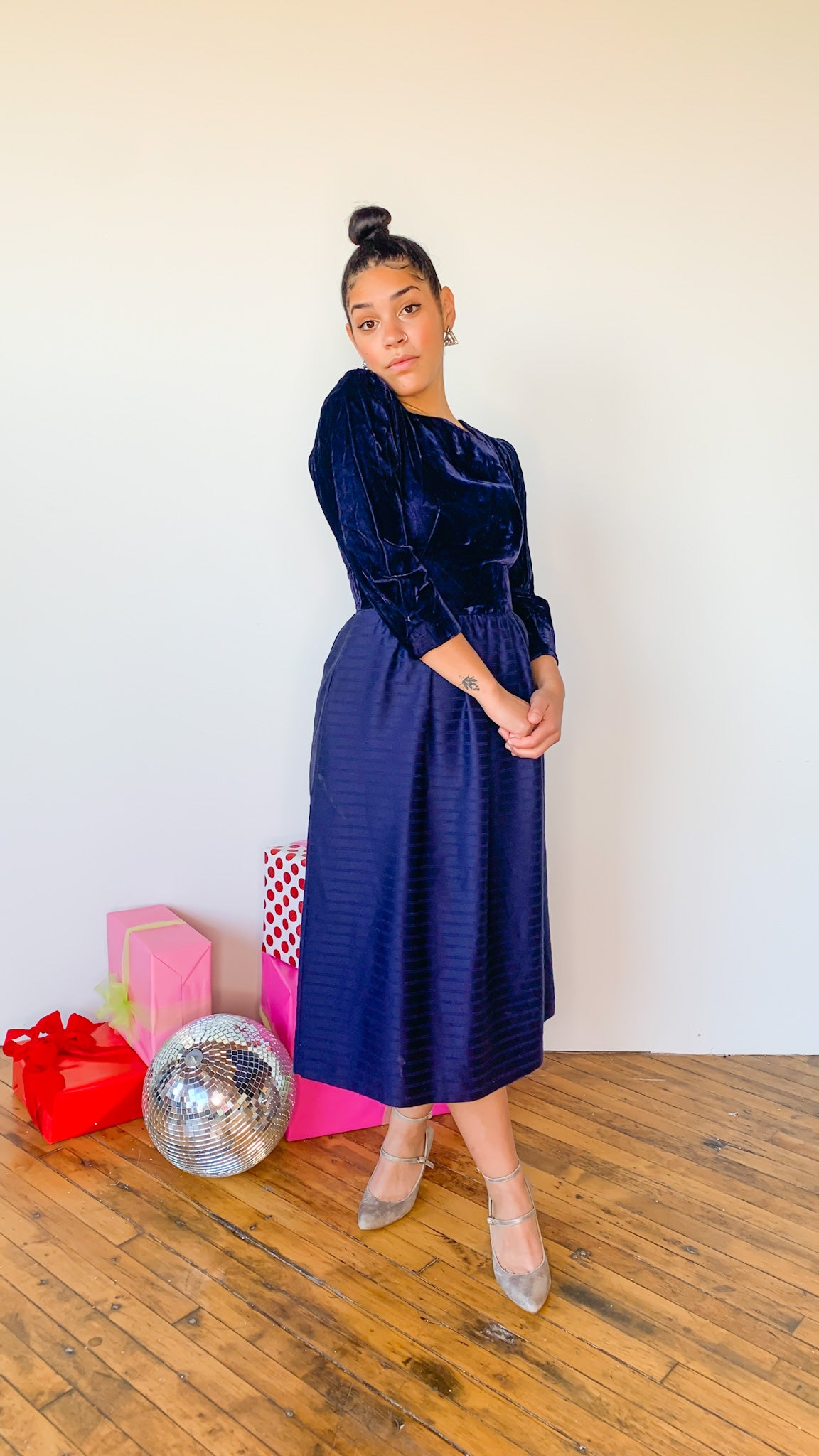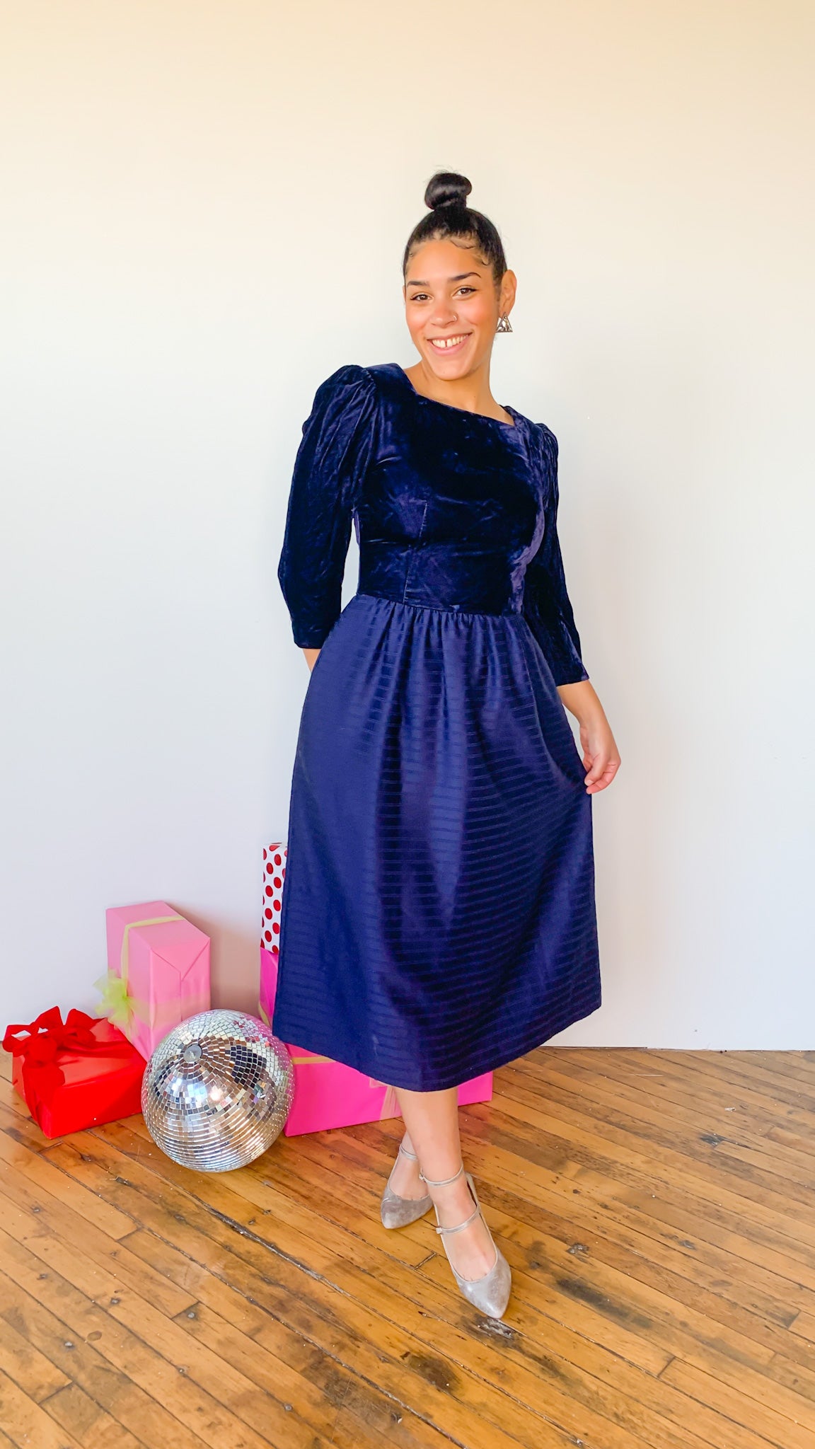 Deep blue/purple dress with velvet at the top and subtle stripes across the skirt. Has pockets. Three-quarter sleeved. Has shoulder pads. Zipper closure on back.
