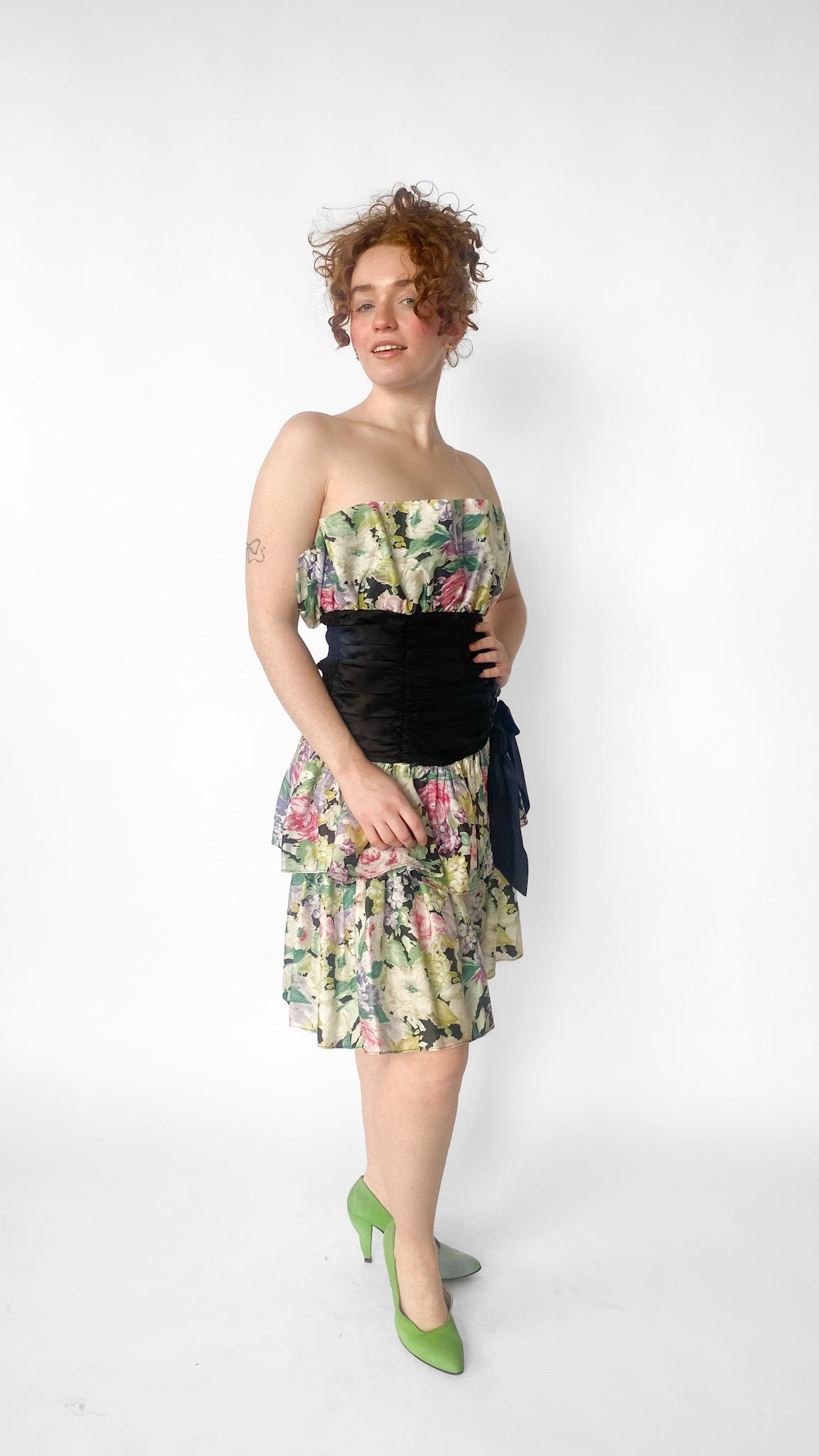 Black floral ruffled dress with gathered waist and bow detailing. Back is smocked, with zipper closure.