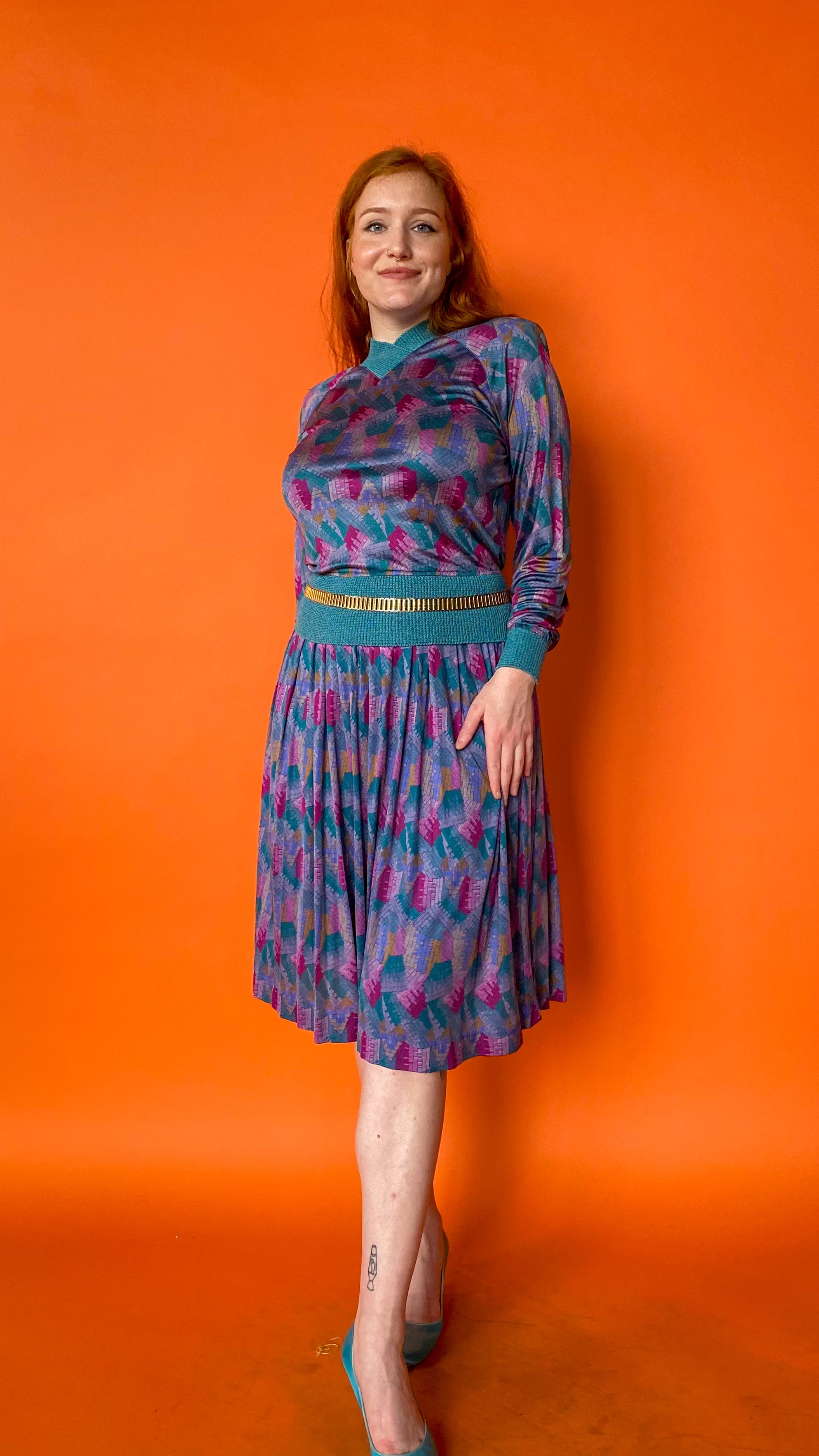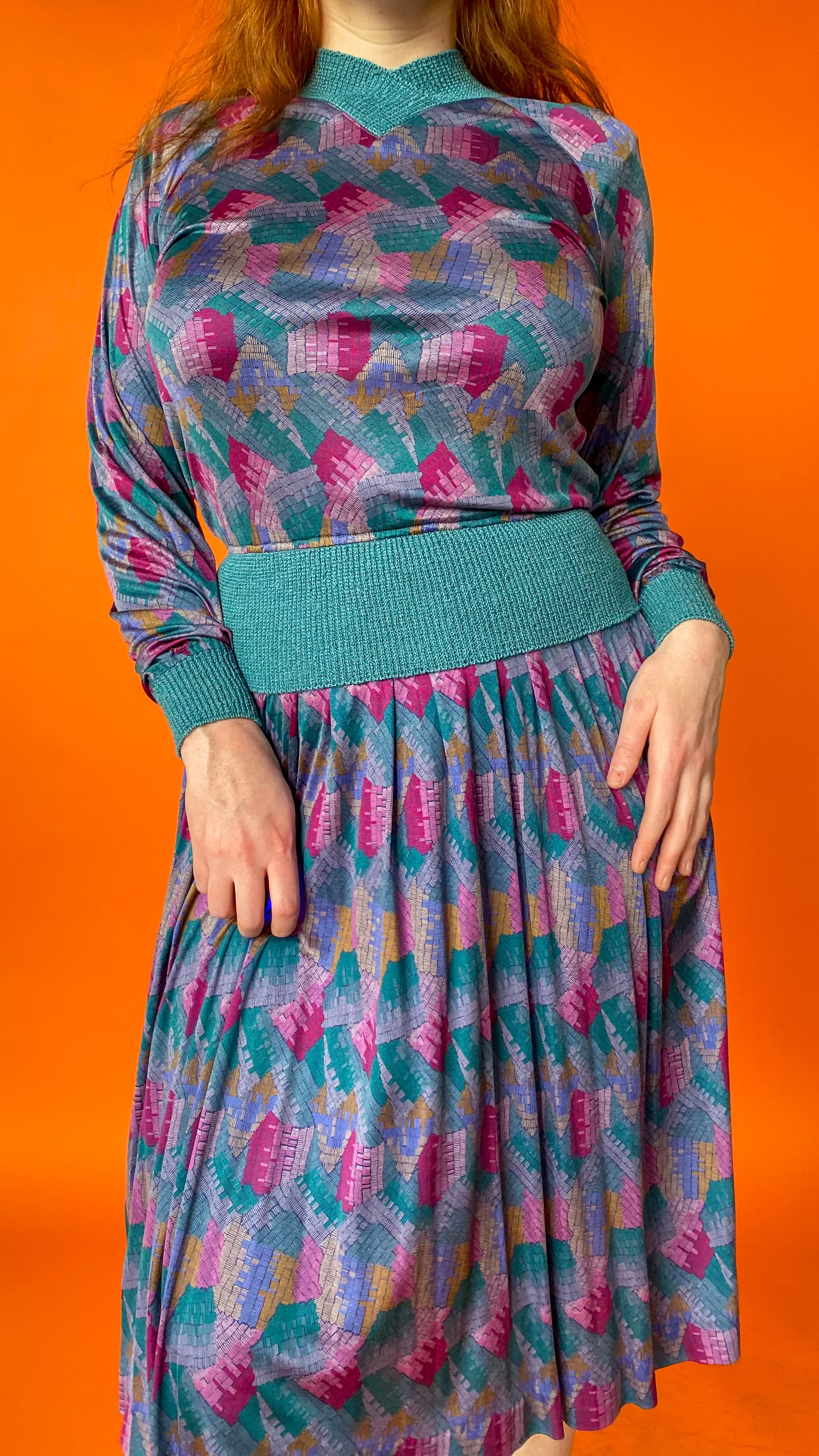 Geometric silk skirt set in shades of blue and teal. Skirt has elastic waistband & top has teal knit collar & waistband. No closures on either garment, but material is stretchy. Can fit between sizes extra small and medium depending on desired fit.