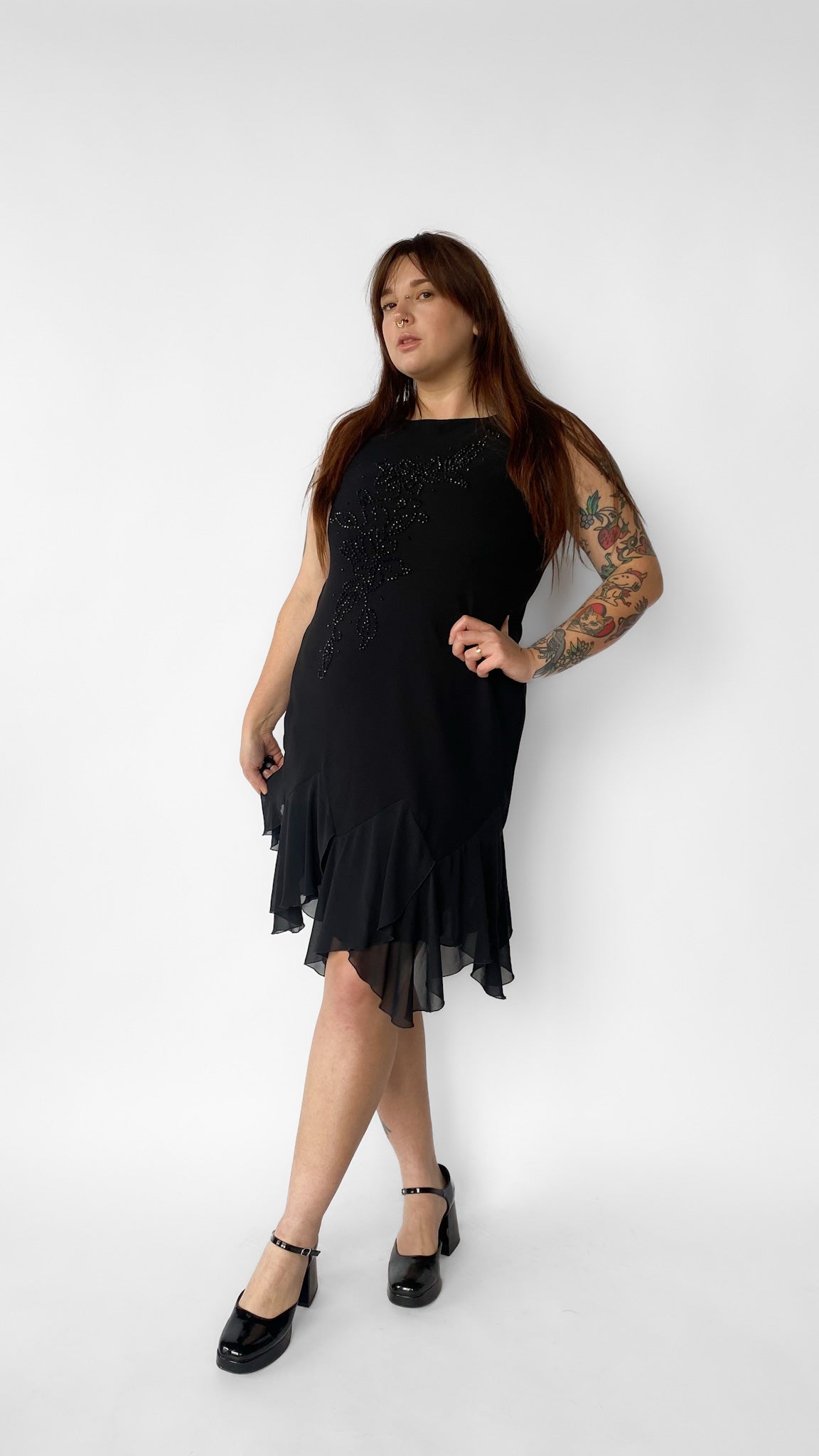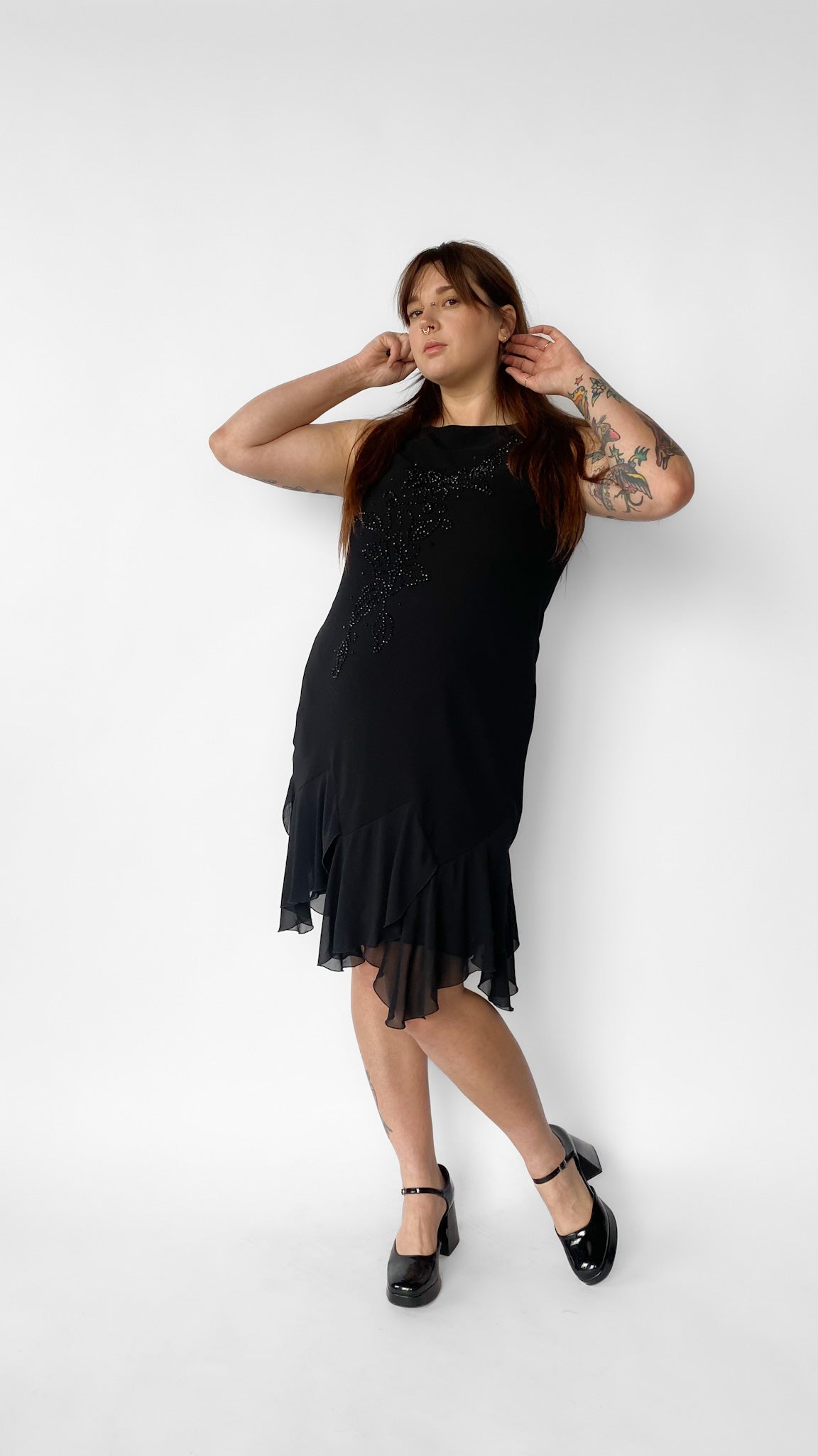 Black sleeveless bias cut dress with beading on the front and handkerchief hemline.