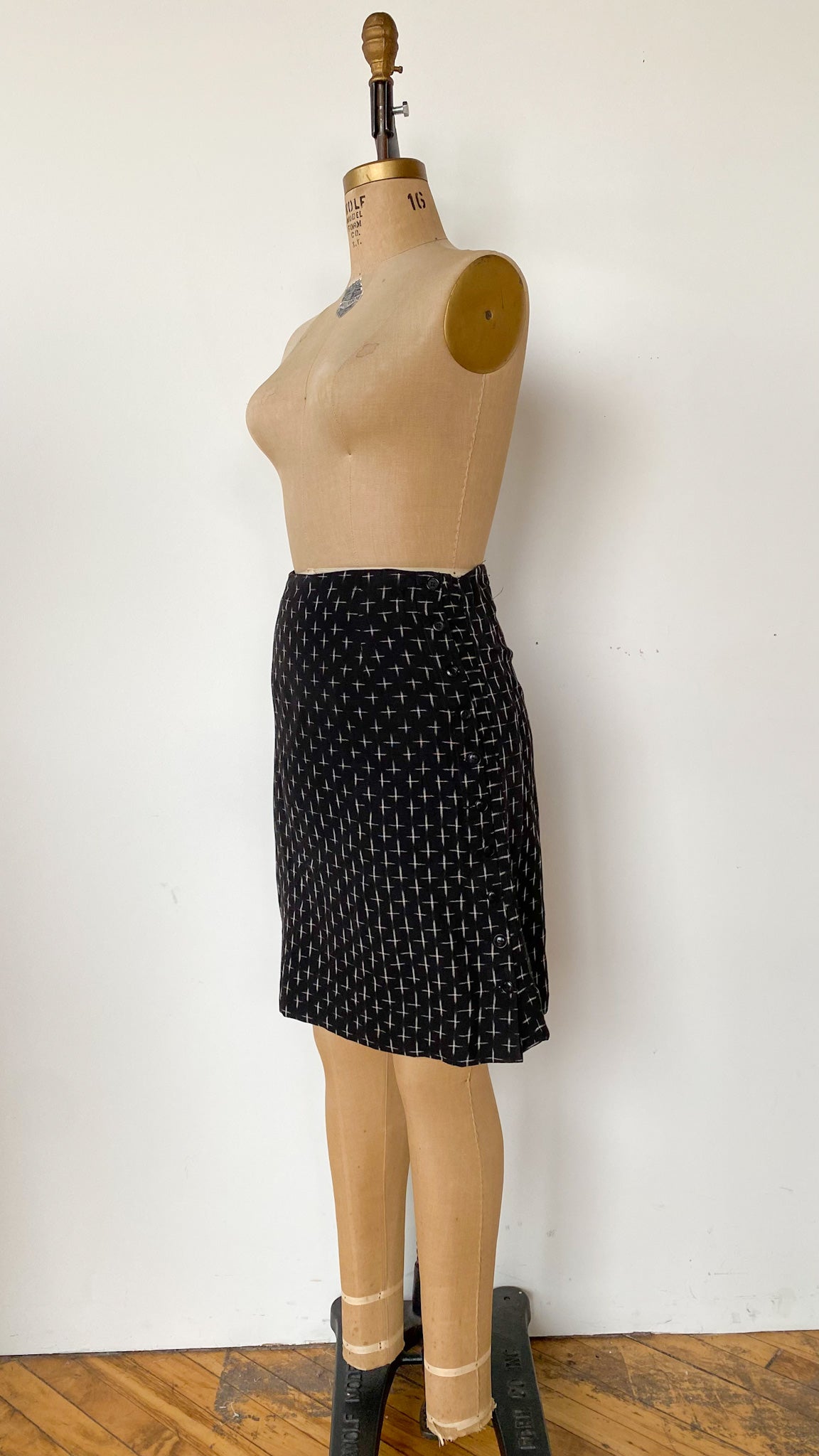 Description: Black midi skirt with white cross pattern. Side of skirt has black buttons going from waistband to a few inches above hemline.