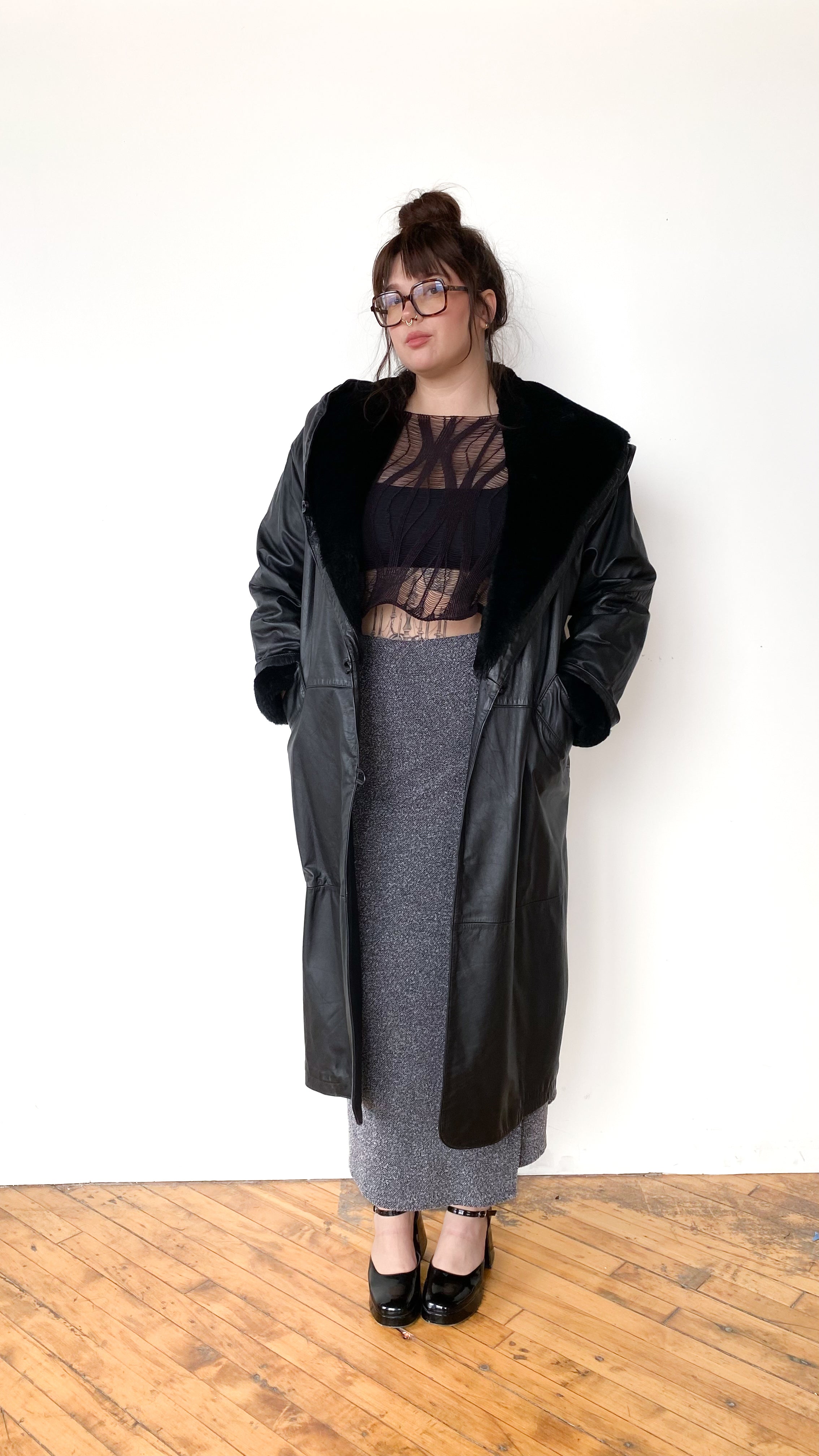 Black leather coat with fur trim around the collar and cuffs. Longer length with button closures down the front. Side pockets. Fur trimmed collar is oversized.