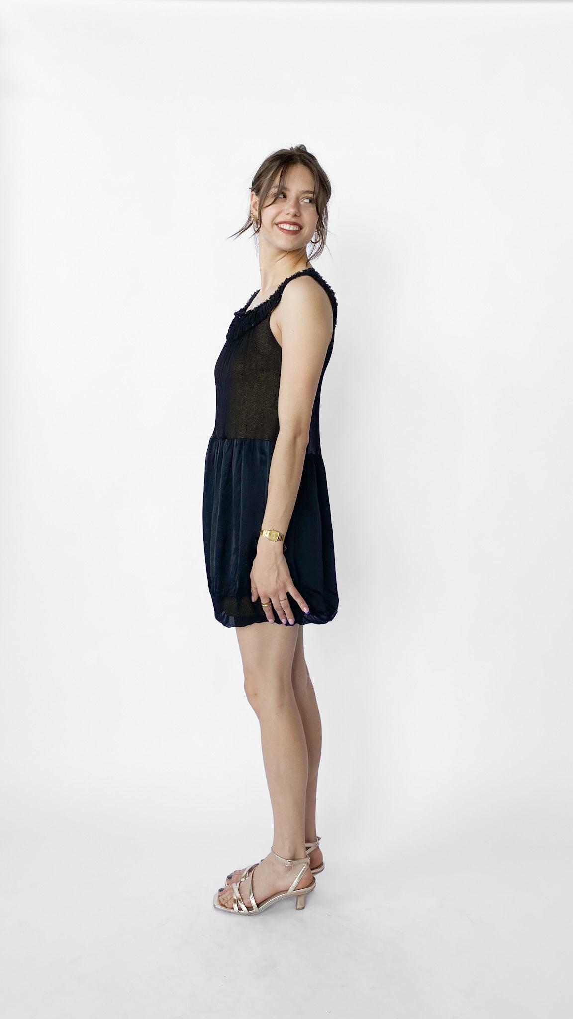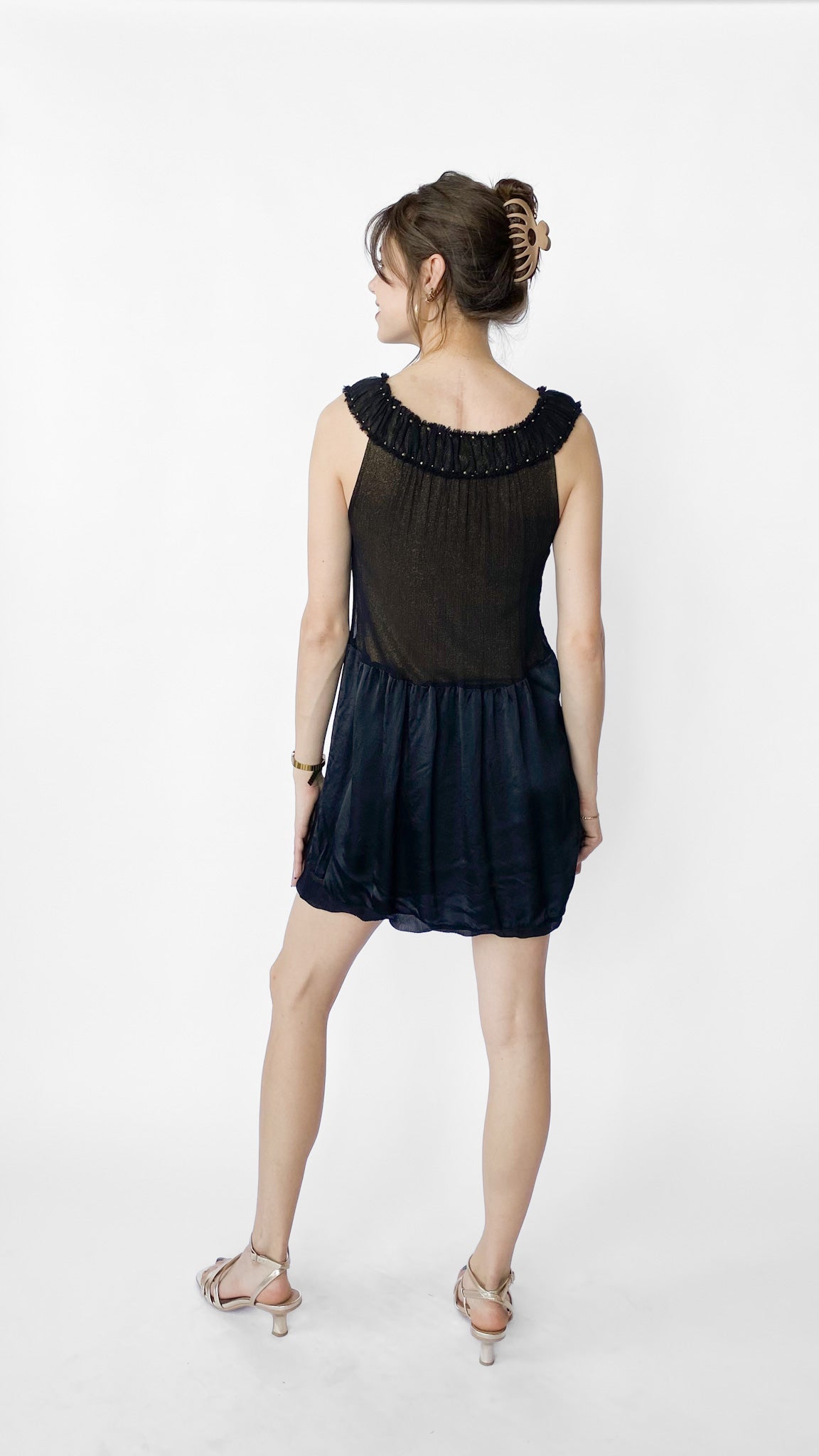 Glittery gold dress with sheer black overlay; has pleated neckline with stud detailing. Skirt has bubble hem. No closure.