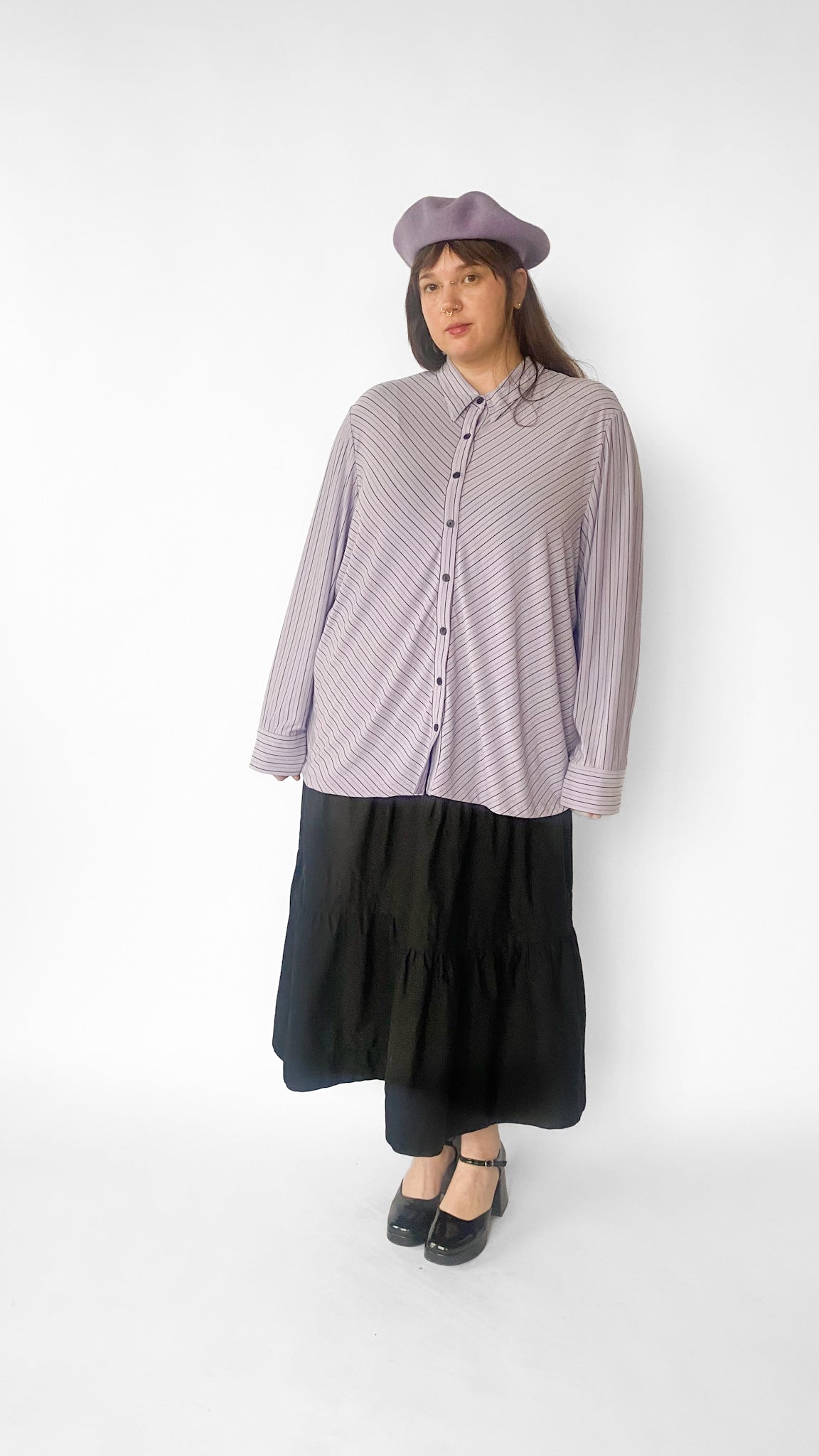 Lilac long sleeved button down shirt with black diagonal stripes.