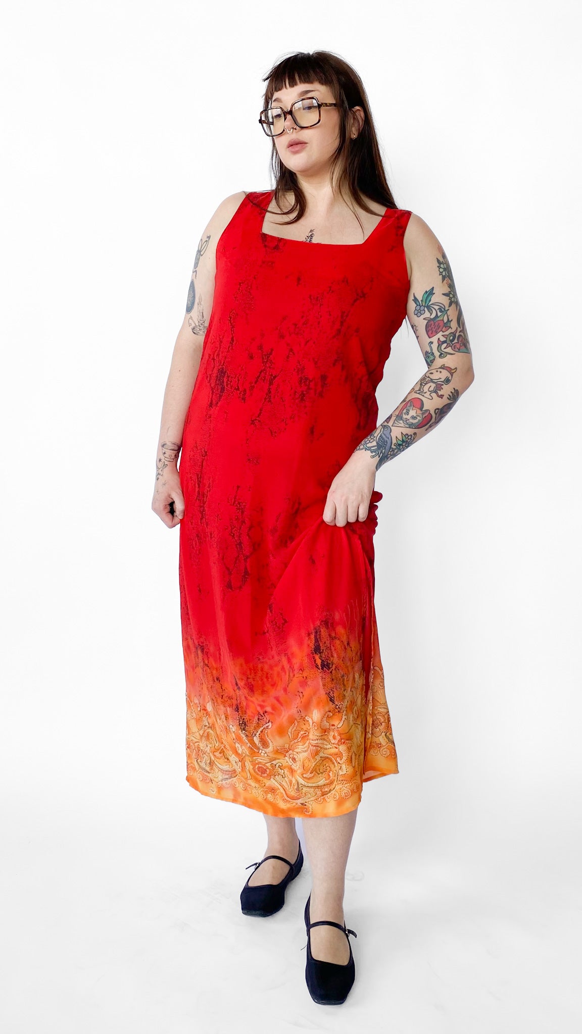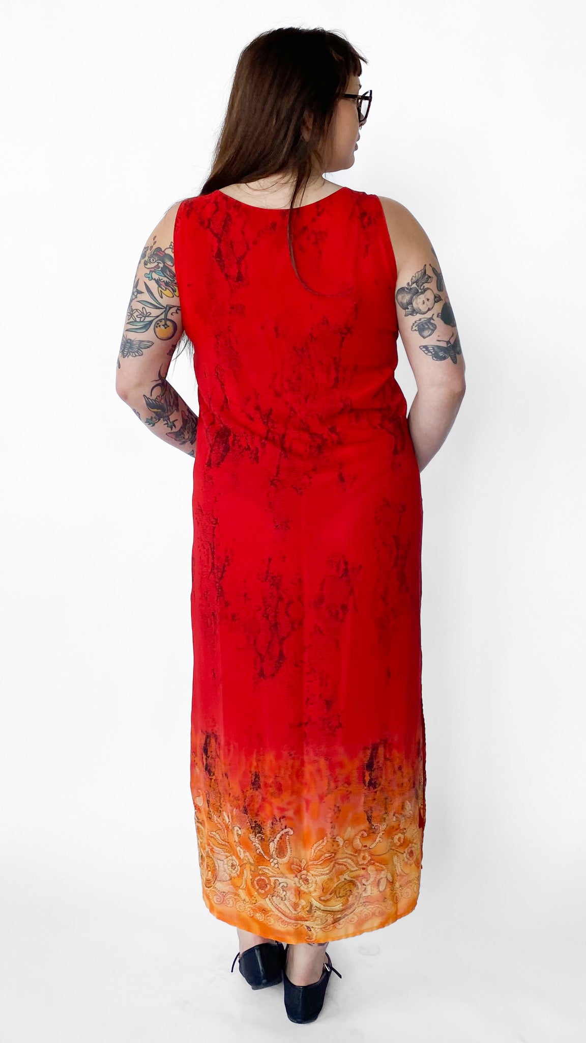 Red sleeveless dress with snakeskin pattern. Bottom of dress fades to a light orange with a polka dot floral design. Bottom sides of dress have small slits.